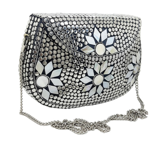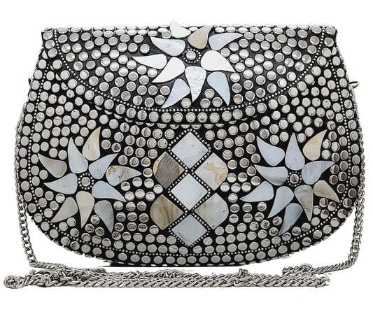 Trend Overseas Women's Metal Mosaic Stone Shell Ethnic Vintage Sling Bag (Silver)