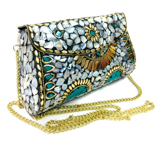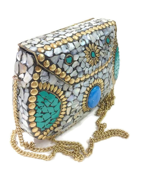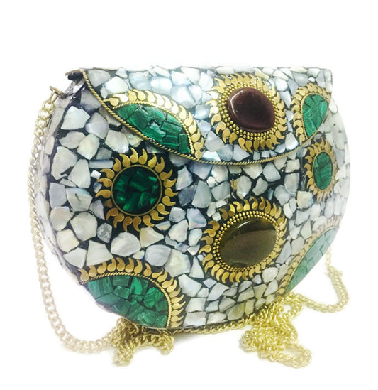 Trend Overseas Green Stone metal Bag Shell stone mosaic clutch MOP nacre bag ethnic indian antique bridal CLUTCH