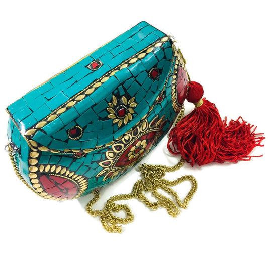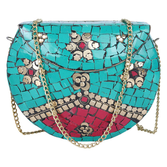 Trend Overseas Green Turquoise Women/Girls Bridal clutch party sling bag mosaic metal bag antique ethnic Indian purse