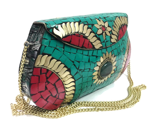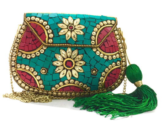 Trend Overseas Green Red color Stone metal clutch Indian Ethnic mosaic clutch