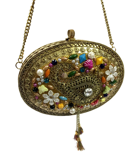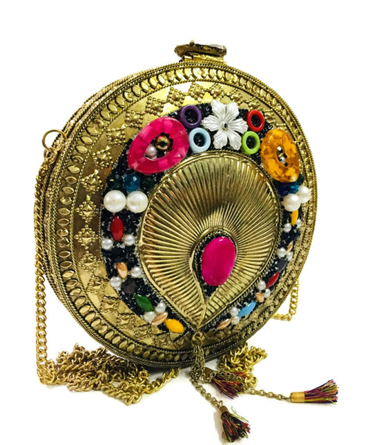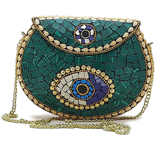 Trend Overseas Green Stone Ethnic Indian Handmade mosaic metal bag Women/Girls Bridal metal clutch party sling bag