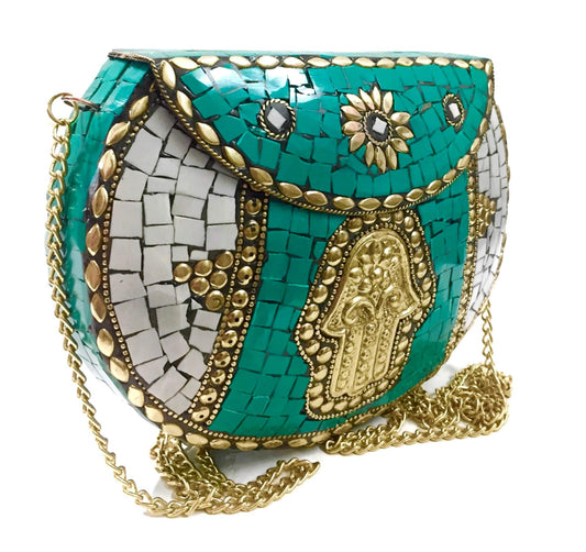 Trend Overseas Green Turquoise Women/Girls Bridal clutch party sling bag mosaic metal bag fatima hand