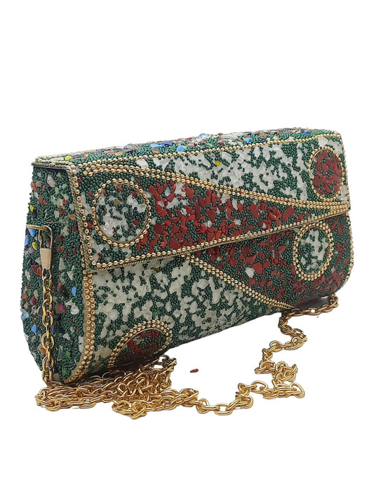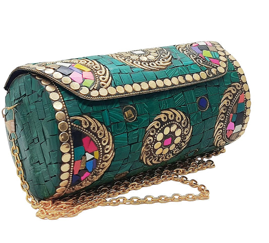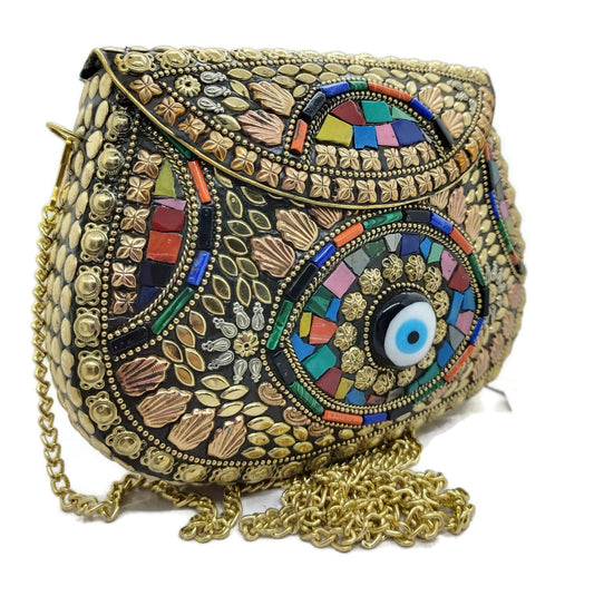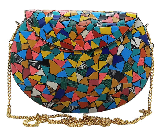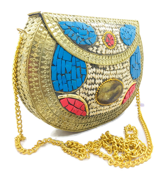 Trend Overseas Handmade Multi Color Metal Mosaic Stone Clutch Ethnic Party Crossbody Bag