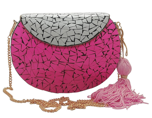 Trend Overseas Handmade Pink Metal Mosaic Stone Clutch Ethnic Party Crossbody Bag