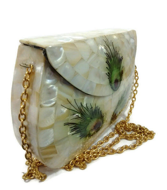 Trend Overseas Handmade Peacock feather Mother of Pearl bag Metal purse stone wallet sling bag Metal clutch women party purse