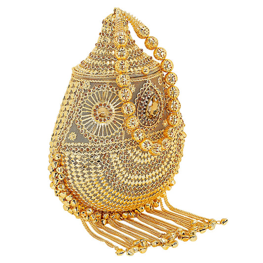 Trend Overseas Handmade Golden Metal Potali Clutch Crystal Rhinestones Tassel Women Evening Bag Long Wedding Party Cocktail Wristlets Handbag Purse