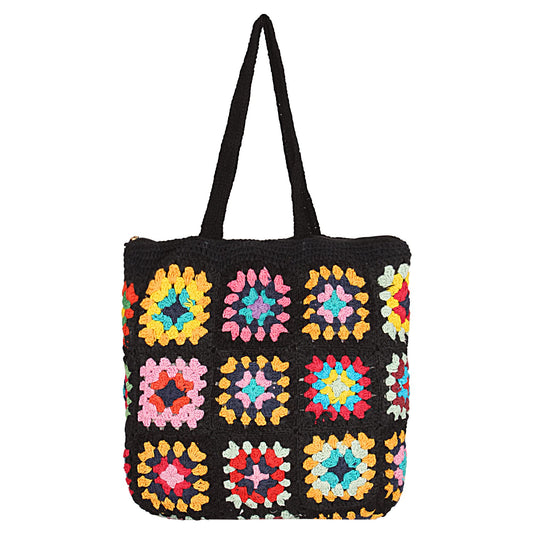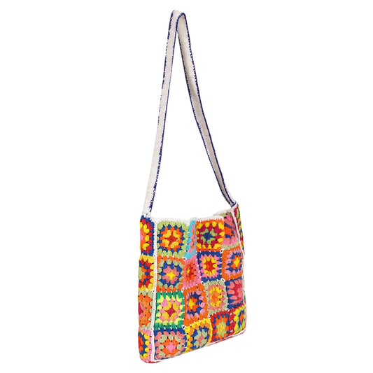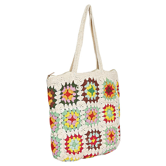 Trend Overseas Handwoven Crochet Multicolour Flower Straw Bag - Travel, Beach, Shopping Woven Shoulder Bag for Women