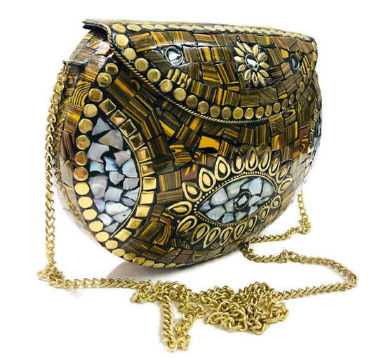 Trend Overseas Women's Antique Indian Art Handmade Stone Mosaic Metal Clutch Sling Bag | Multicolour