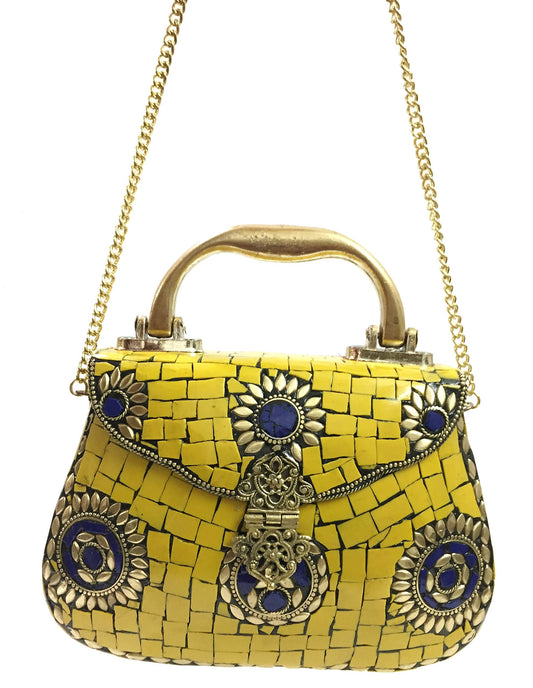 Yellow Purse Ethnic Clutch metal bag metal clutch mosaic purse Vintage clutch Long chain bag Handle clutches Handmade Bag Brass metal purse