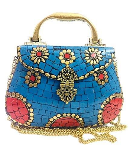 Sky Blue Purse Ethnic Clutch metal bag metal clutch mosaic purse Vintage clutch Long chain bag Handle clutches Handmade Bag Brass metal purse