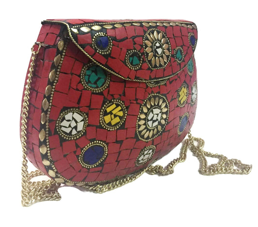 Red Stone Bag, Sling Clutch, mosaic bag, stone Clutch, Ethnic Metal box,bridal wallet, Indian vintage bag, party clutches for women