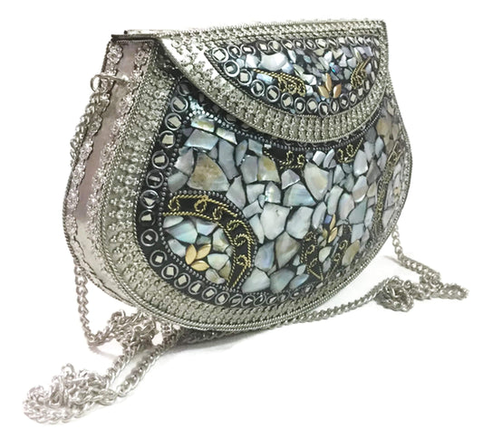 Silver Ethnic Clutch Gift for women, Vintage Handmade Bags, Metal Mosaic stone Bag, Shell purse, Sling bag, Party Bag