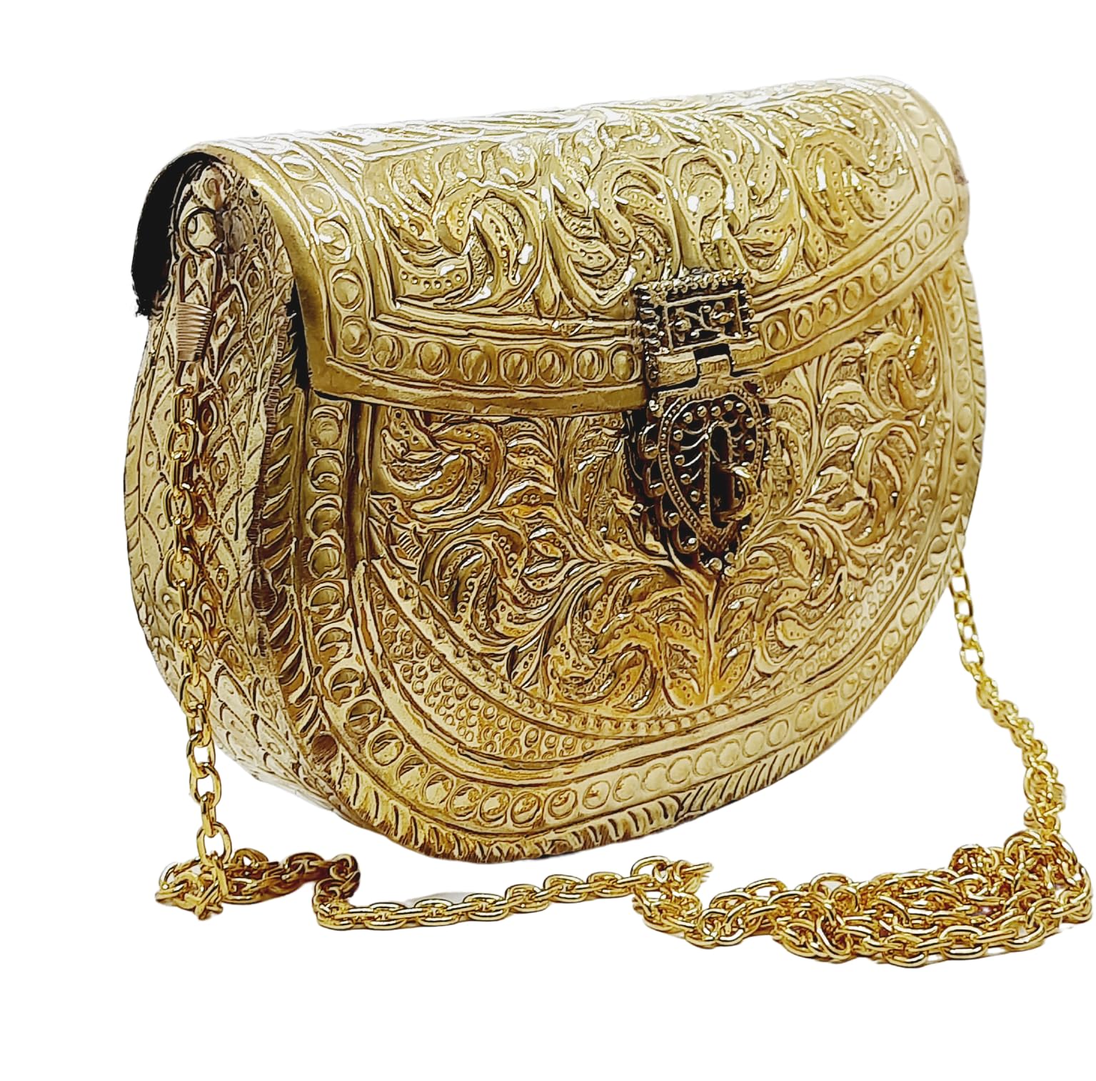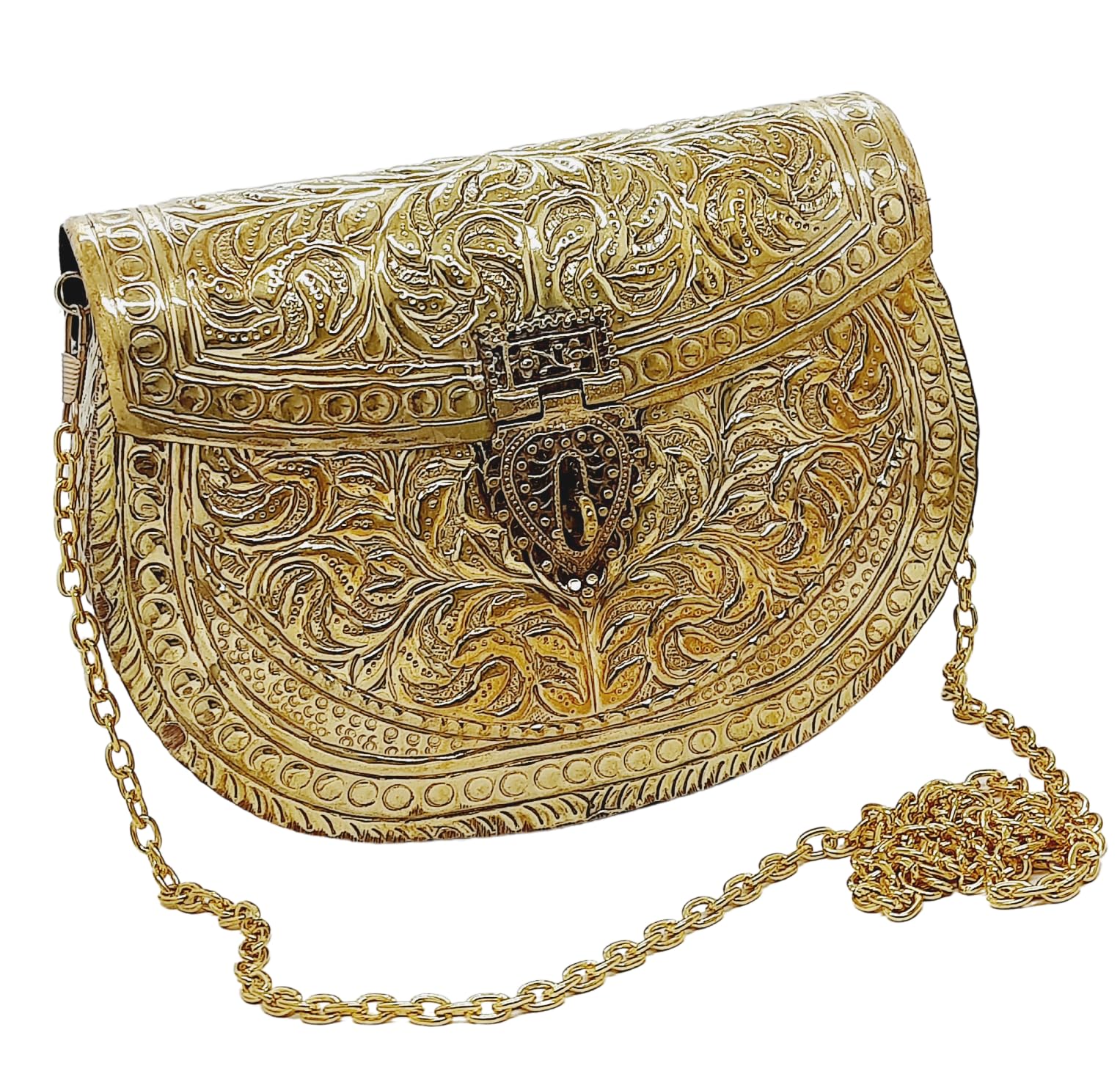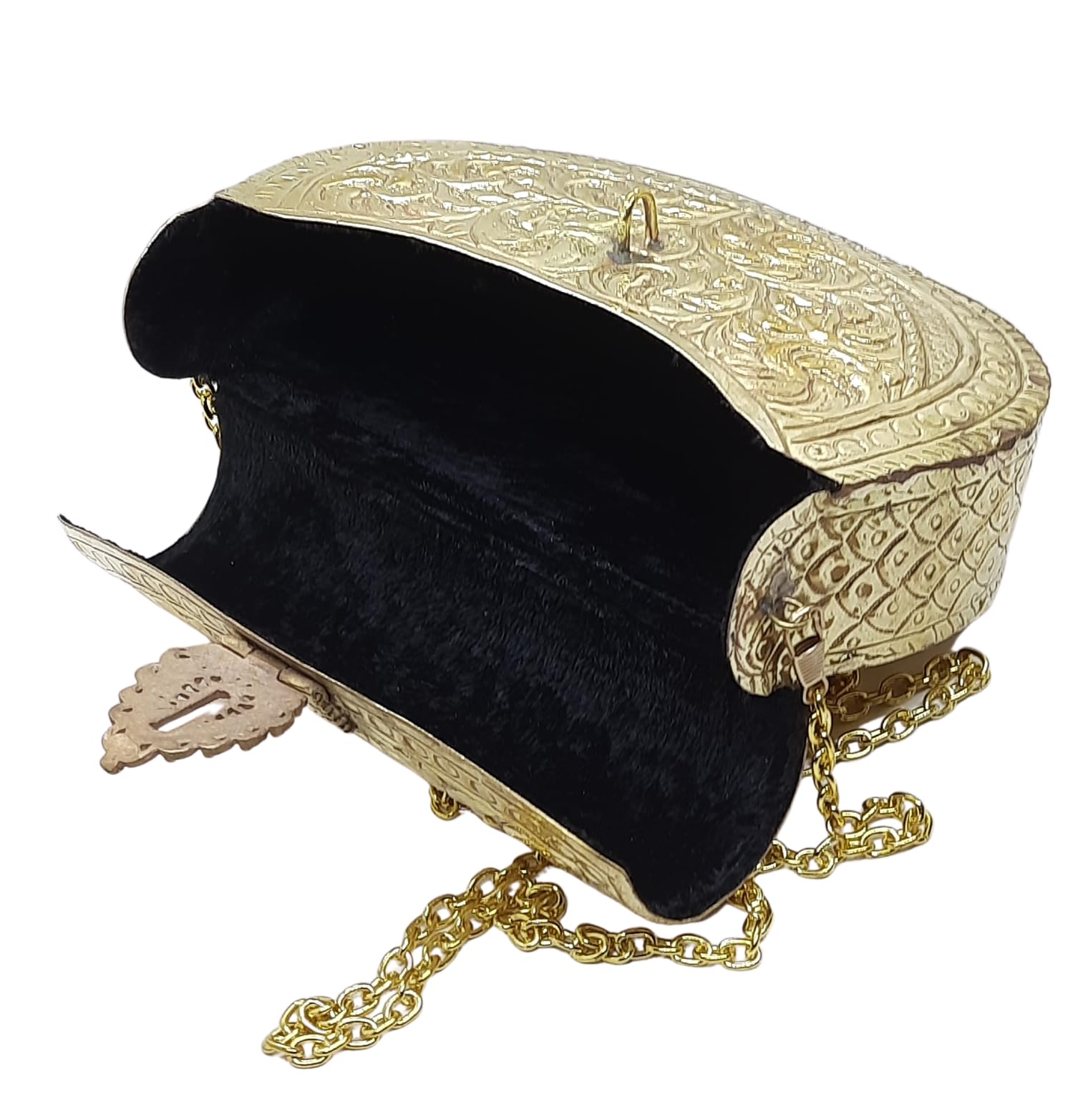 Golden color unique metal clutch purse from the Indian craftsmen. Handmade Vintage Hand Clutch made from Brass Metal . A basic Brass metal object is first designed and fine carving is done on it by hand. The process is finally completed by oxidization and polishing.Wall of the inner space is also fixed with soft velvet to protect your items.Party wear look and this unique bag can Accommodate Any size Cellphone and other small accessories, Design in purpose to give attractive attention in Function,Party. Bag Feature:Length 7.5 Inch,Width 2.5 Inch, Height 6 Inch, Chain Length 20 Inch, Weight 450 Gm
