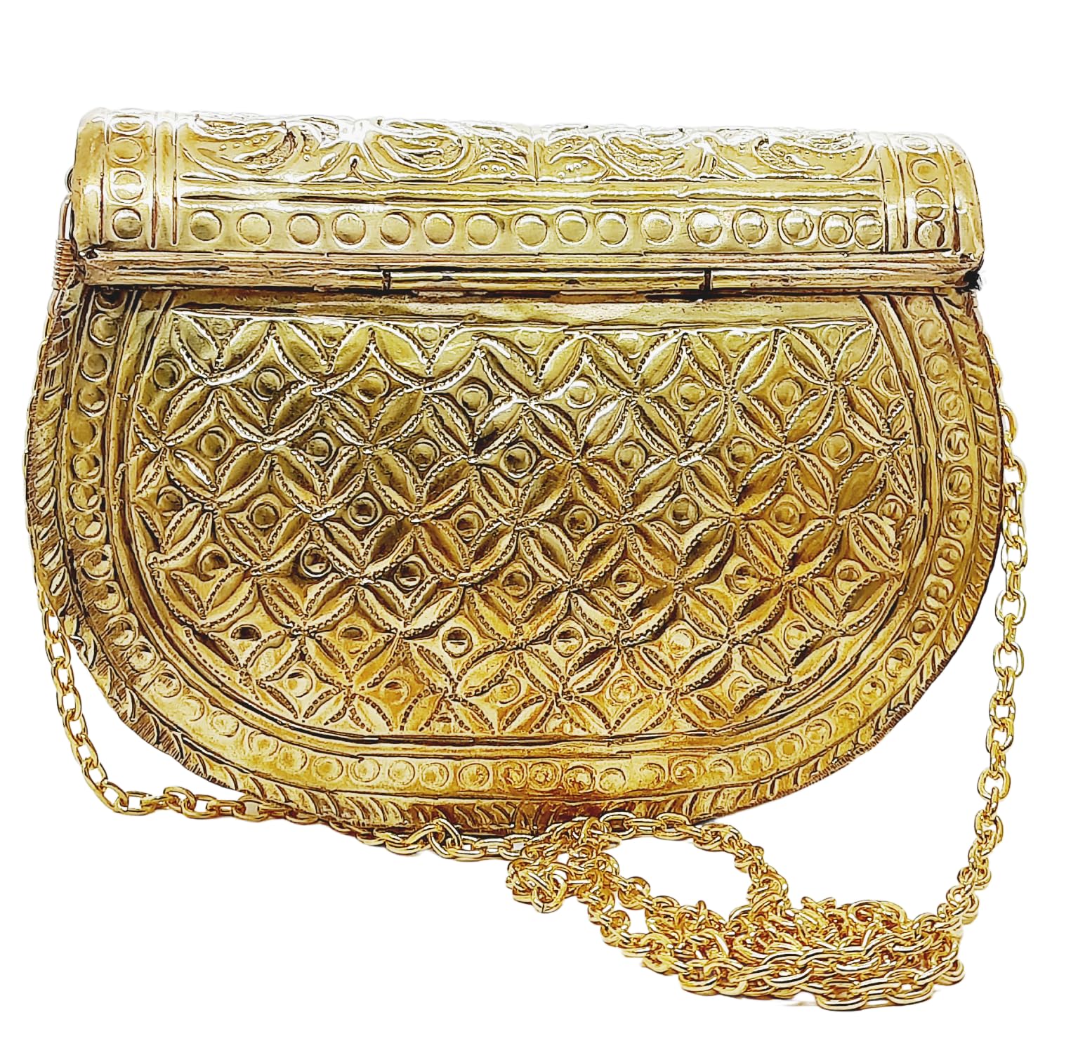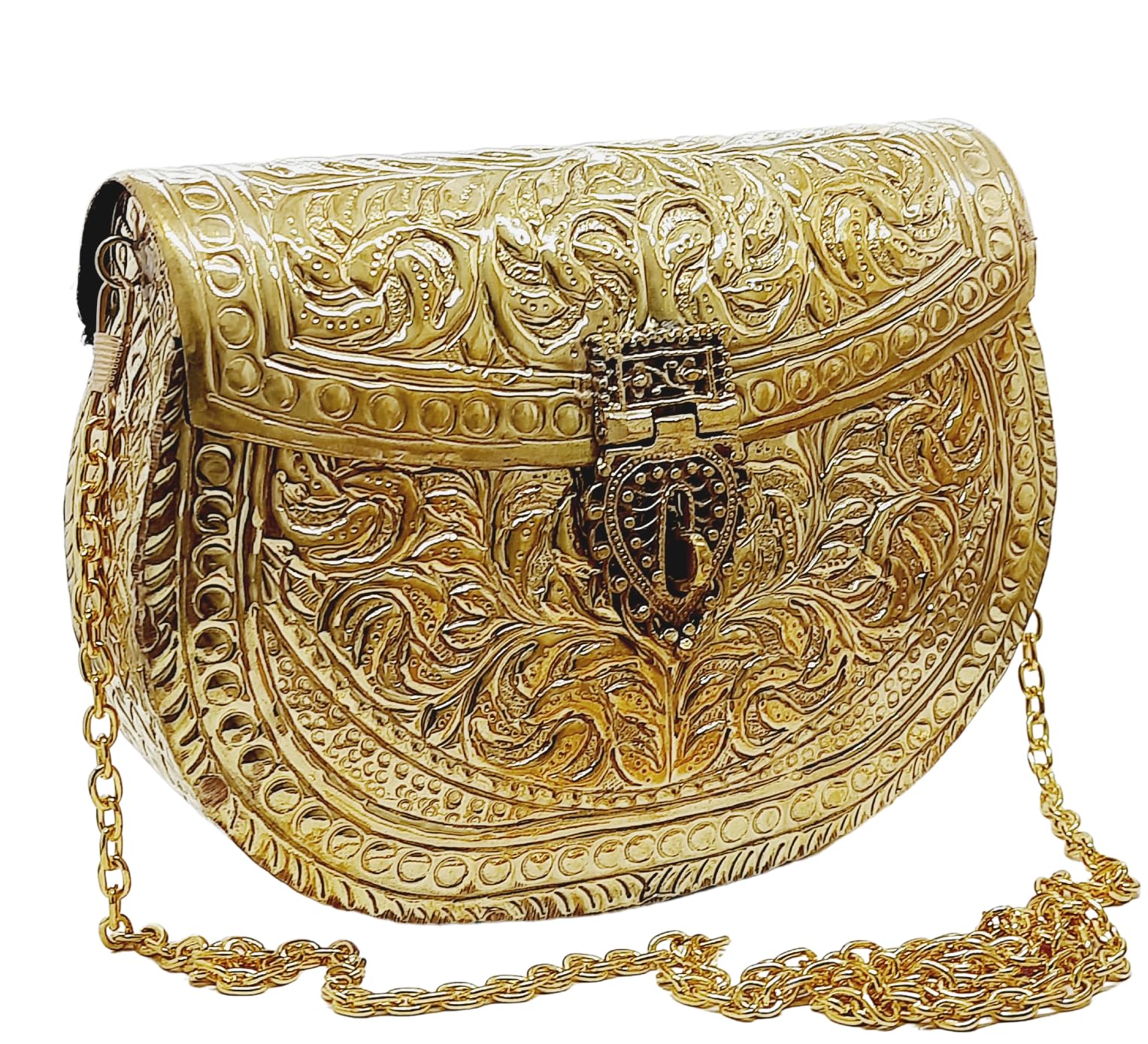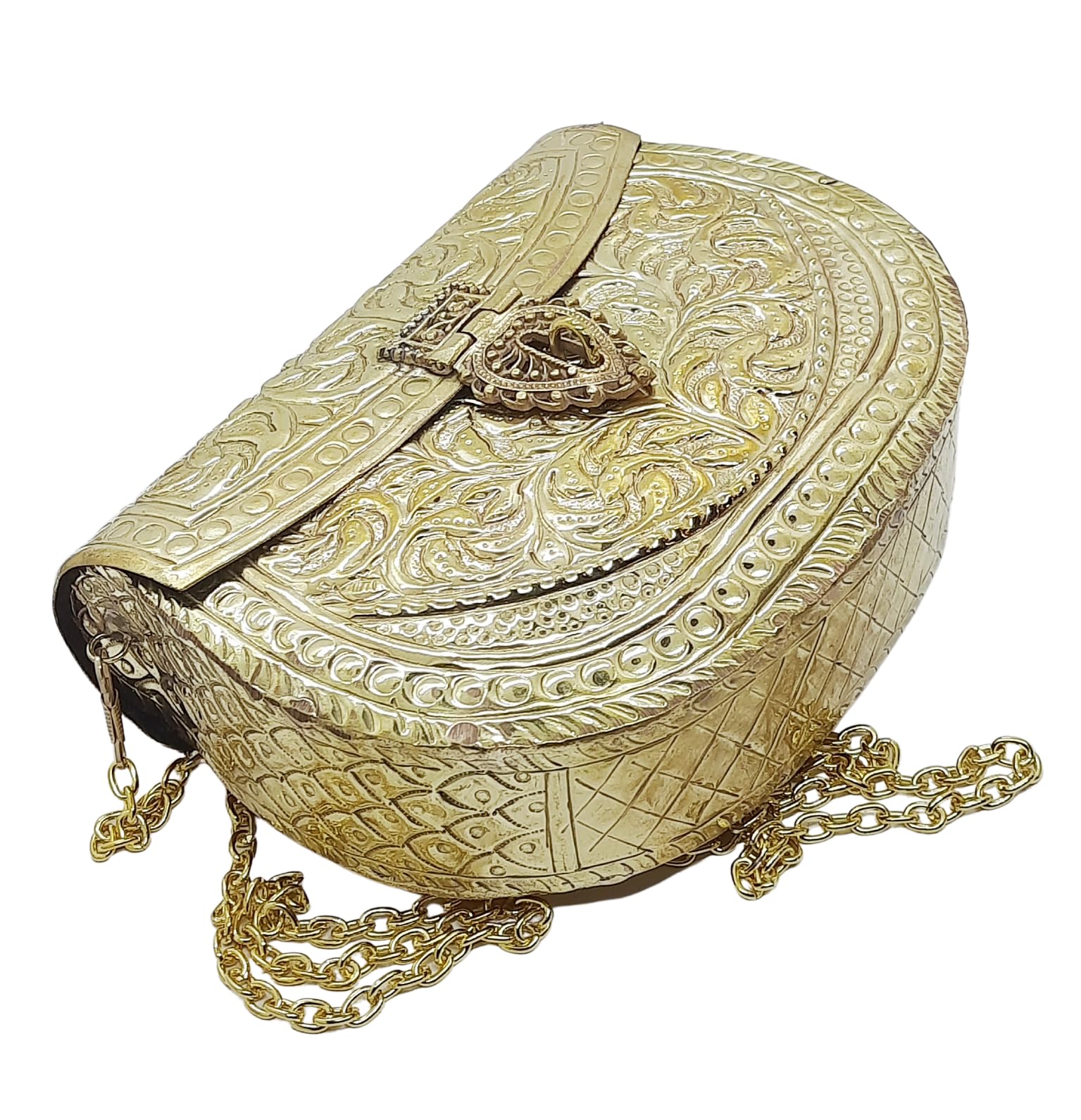 Golden color unique metal clutch purse from the Indian craftsmen. Handmade Vintage Hand Clutch made from Brass Metal . A basic Brass metal object is first designed and fine carving is done on it by hand. The process is finally completed by oxidization and polishing.Wall of the inner space is also fixed with soft velvet to protect your items.Party wear look and this unique bag can Accommodate Any size Cellphone and other small accessories, Design in purpose to give attractive attention in Function,Party. Bag Feature:Length 7.5 Inch,Width 2.5 Inch, Height 6 Inch, Chain Length 20 Inch, Weight 450 Gm