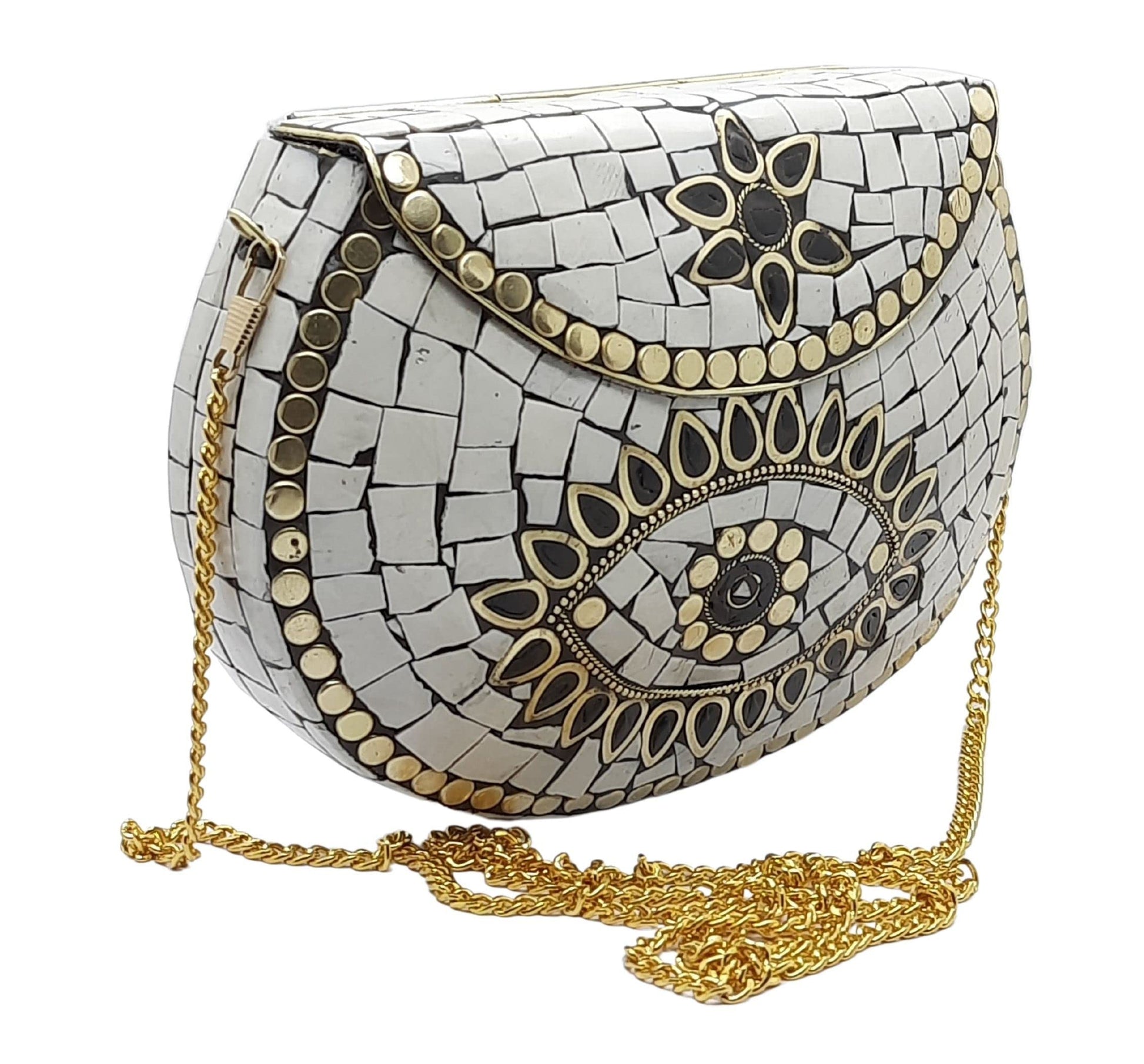 Handmade Metal Clutch cum Sling Bag made by Metal and beautiful stone work in whole bag. Old Indian Ethnic, Vintage Style transformation in modern look. Design by craftsman by cutting metal in frame and Fine stone work on it in mosaic pattern. It comes with Detachable Chain and Handle. So ,You may carry this Bag in two different look , As a Sling Bag as well Handle Clutch. Detachable Tassel with Bag Bag Feature:: "Length 7.5 Inch, Height 5.5 Inch and Chain length 19 Inch, Weight 390 Gm.