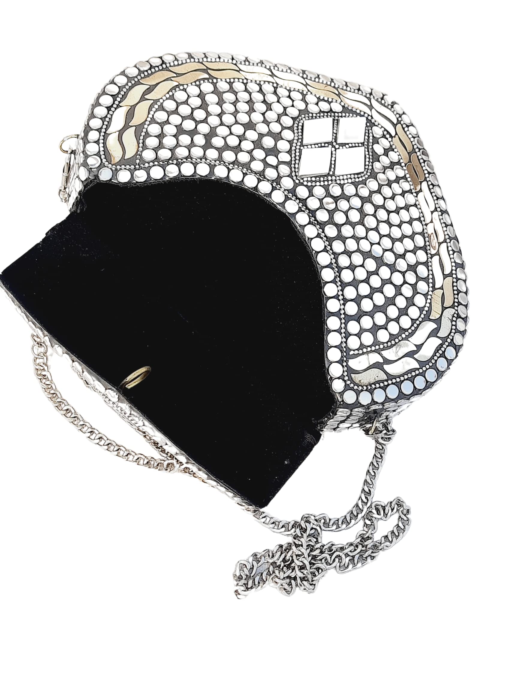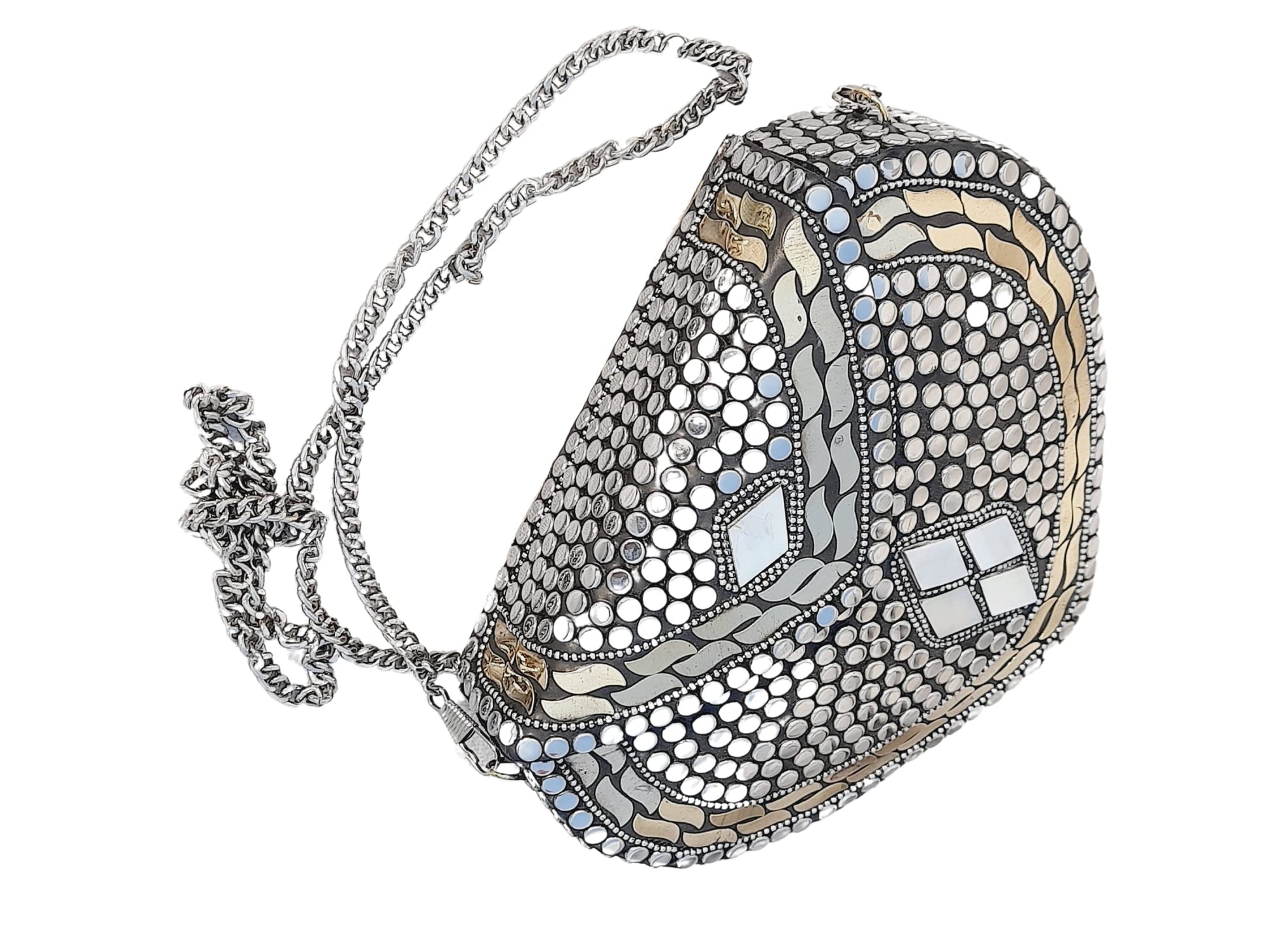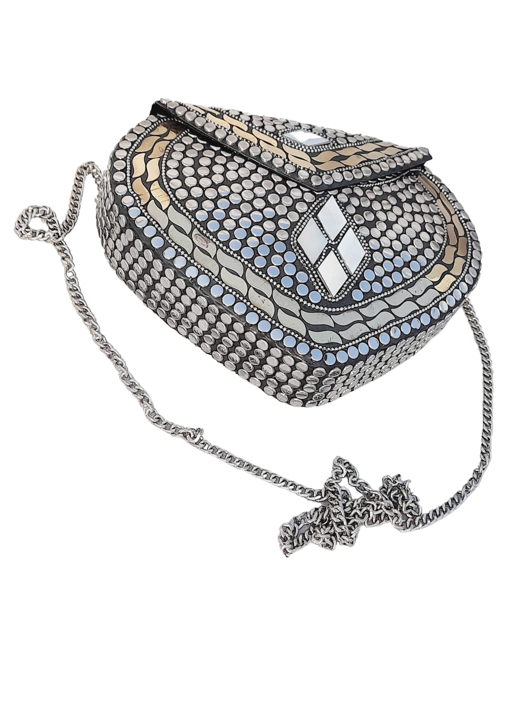 Small Size Handmade Metal Clutch cum Sling Bag made by Metal and beautiful Silver and Arcylic Beads work in whole bag. Old Indian Ethnic, Vintage Style transformation in modern look. Design by craftsman by cutting metal in frame and Fine stone work on it in mosaic pattern. It comes with Detachable Chain and Handle. So ,You may carry this Bag in two different look , As a Sling Bag as well Handle Clutch. Feature:: "Length 7 Inch, Height 5.5 Inch and Chain length 19 Inch, Weight 390 Gm.