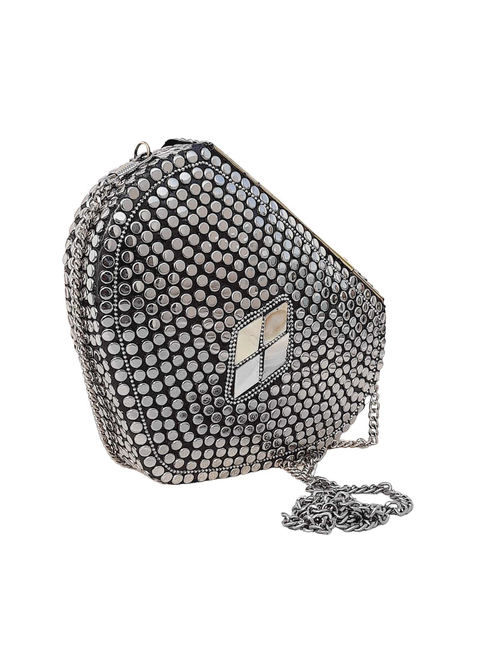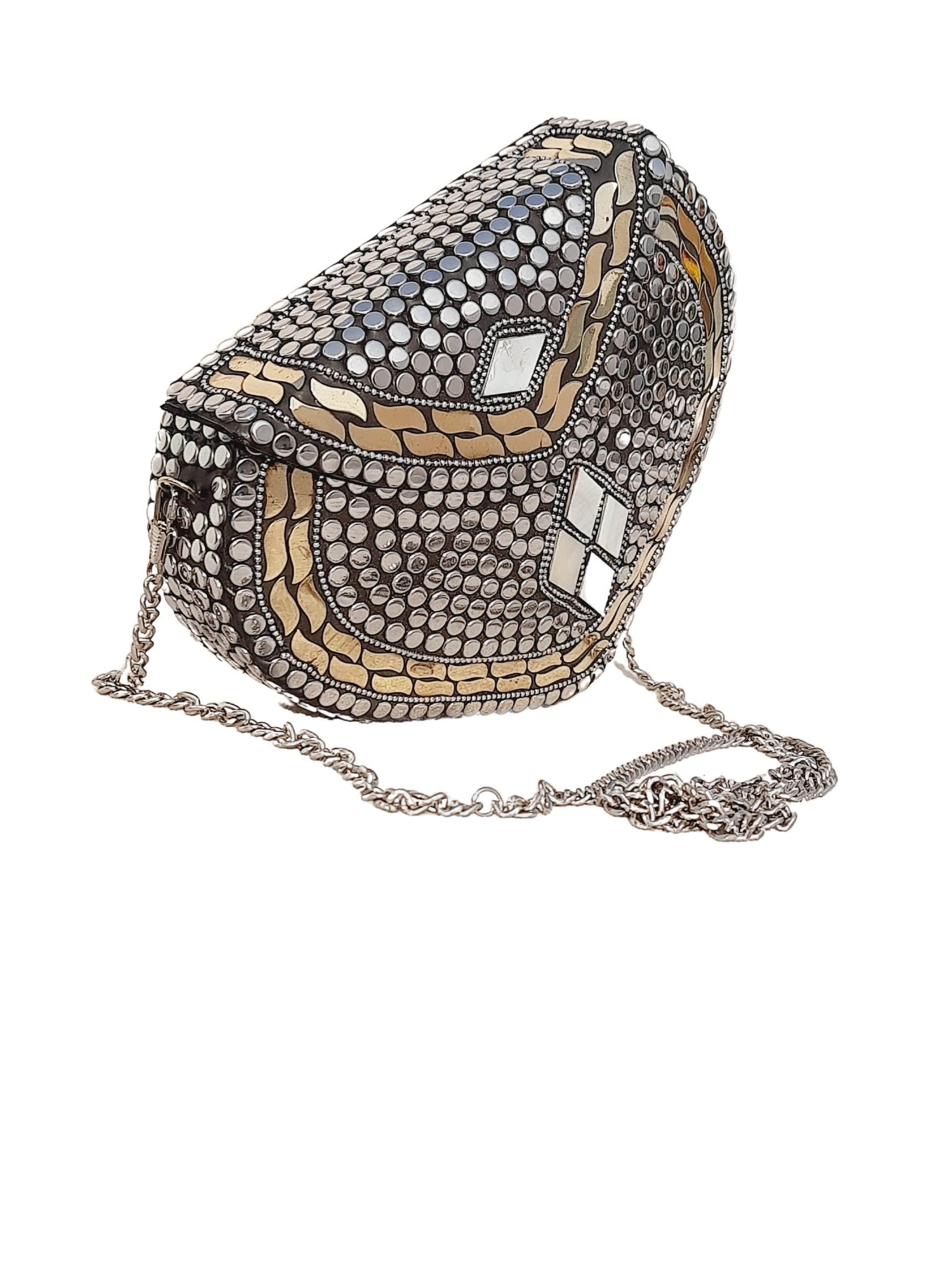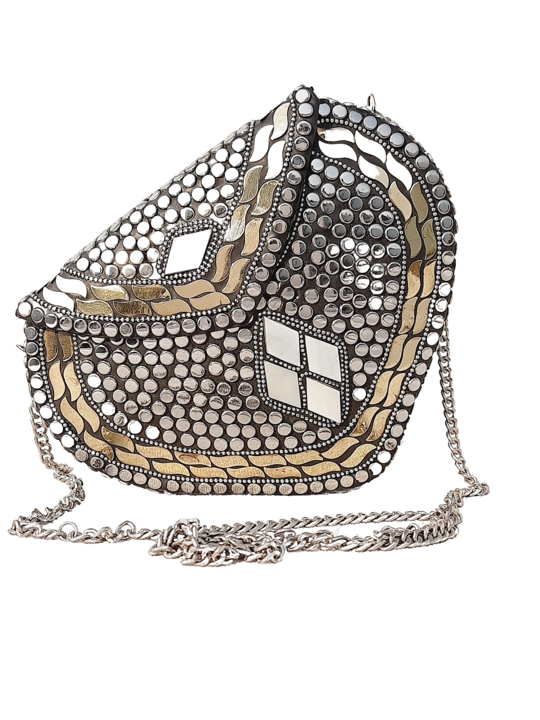 - Small Size Handmade Metal Clutch cum Sling Bag made by Metal and beautiful Silver and Arcylic Beads work in whole bag.