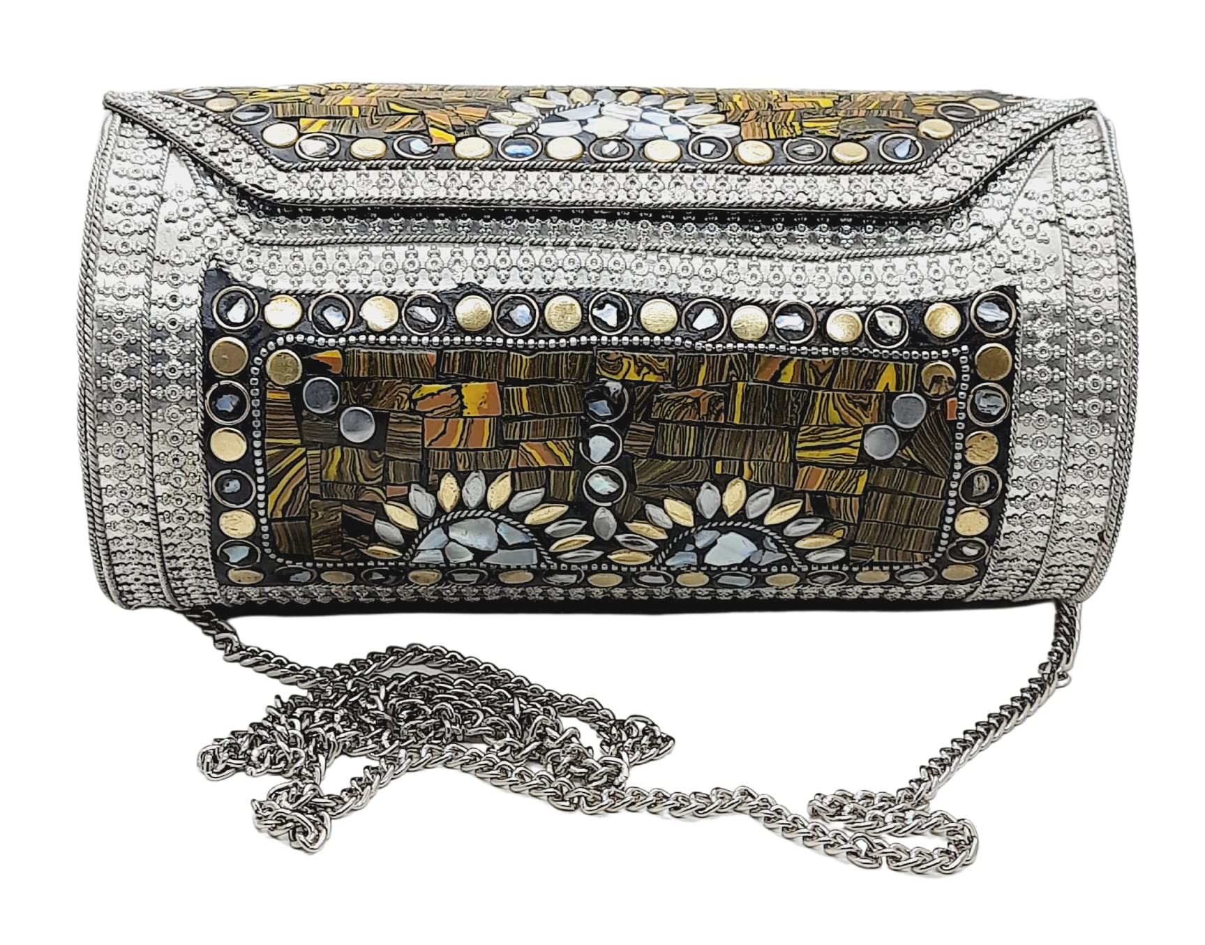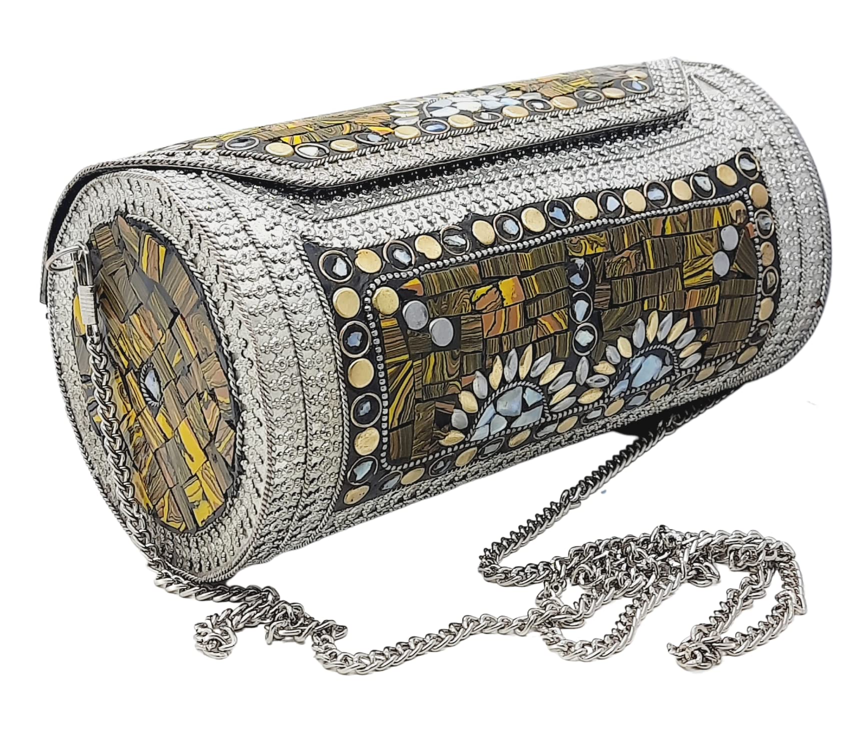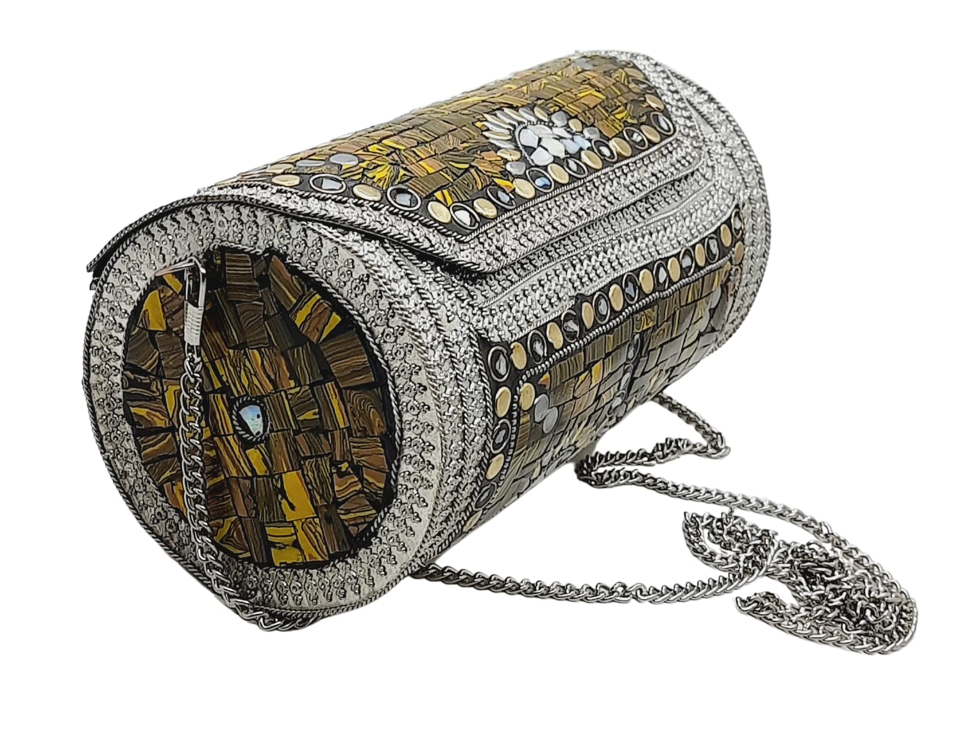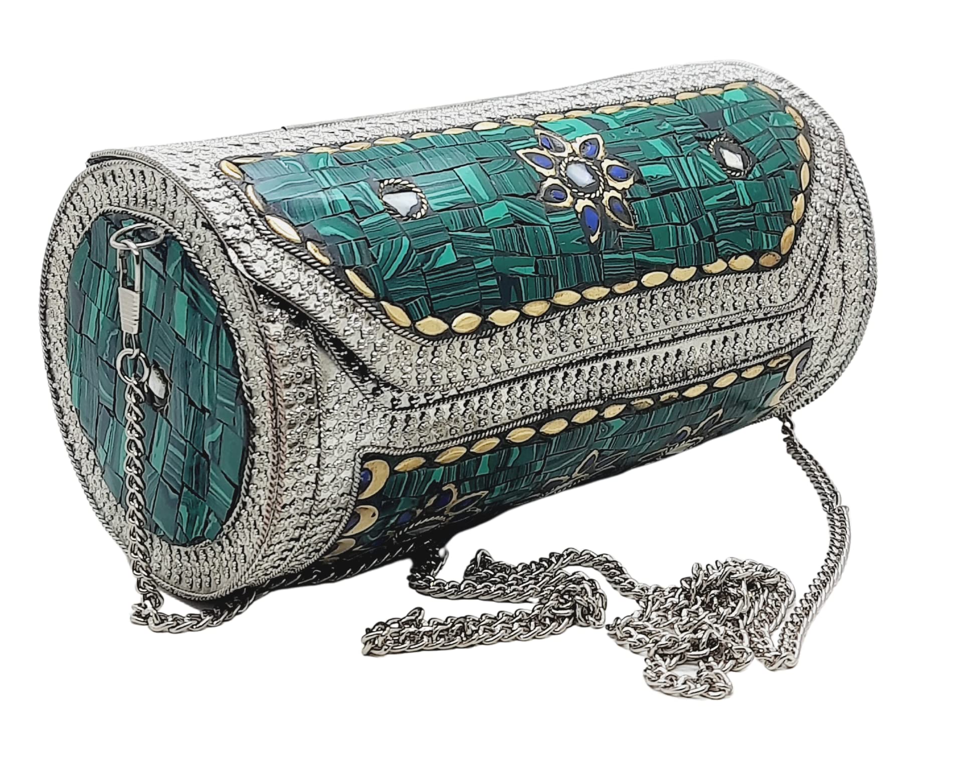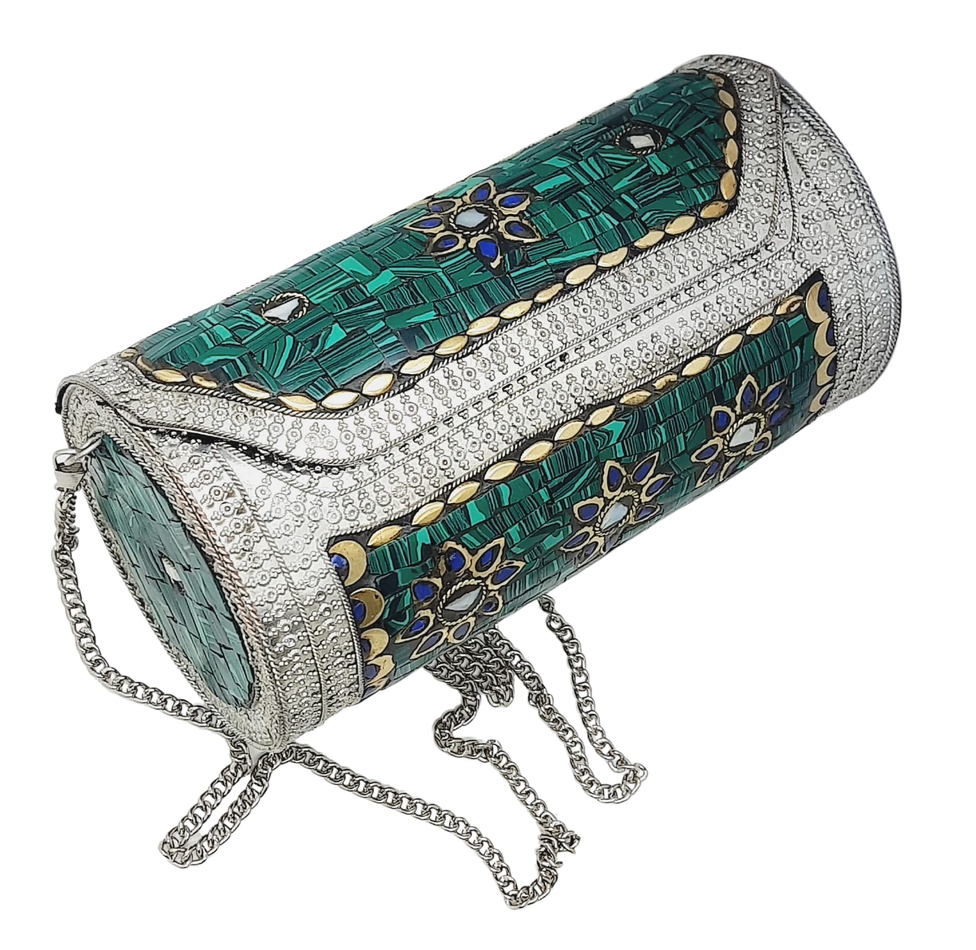 Trend Overseas Eye Catching Handmade Cylinder Round Ethnic Stone Metal bag Antique Bridal clutch