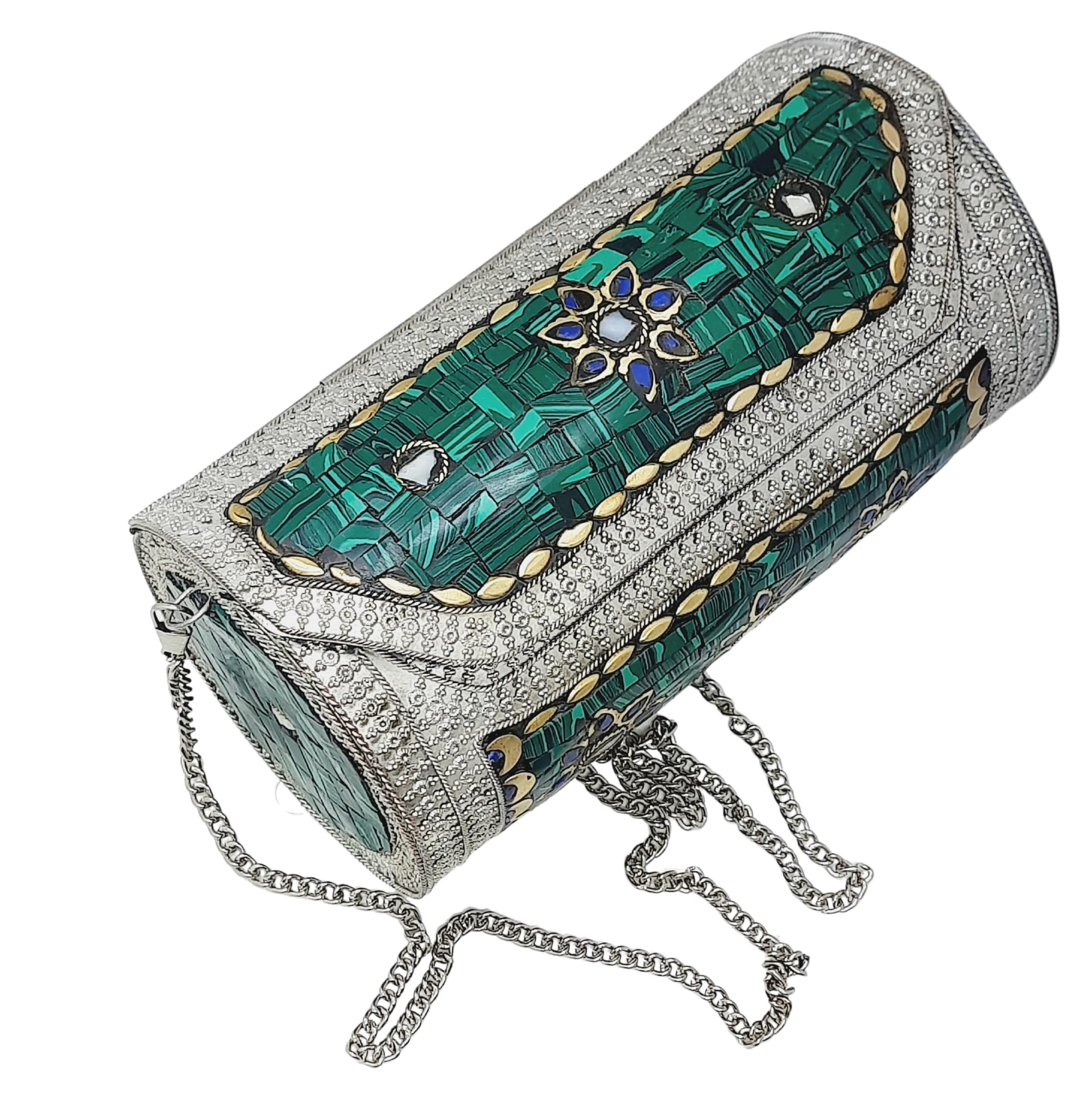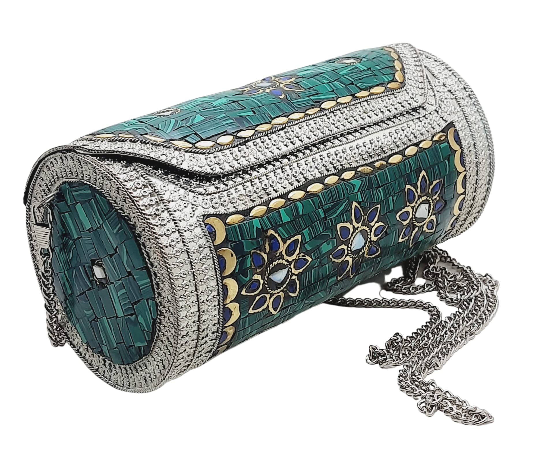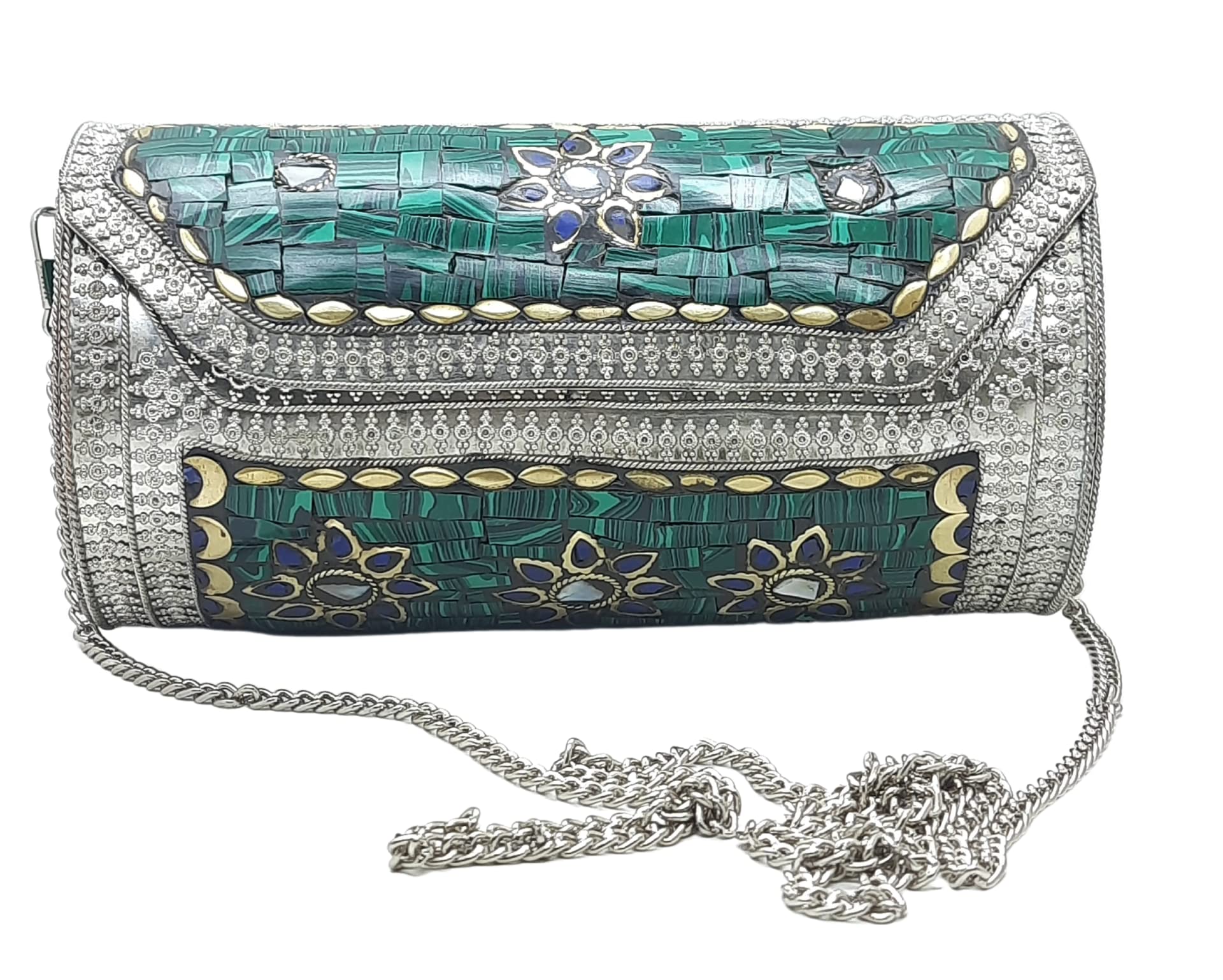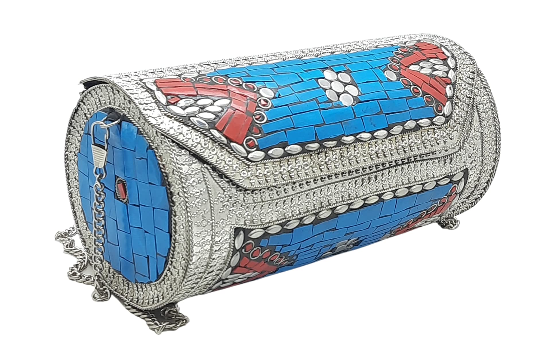 Trend Overseas Eye Catching Handmade Cylinder Round Ethnic Stone Metal bag Antique Bridal clutch