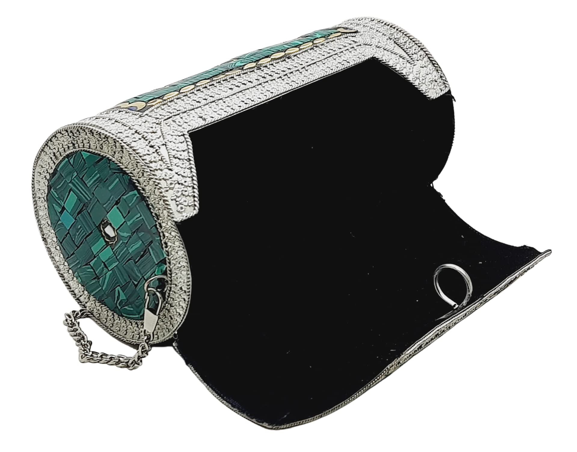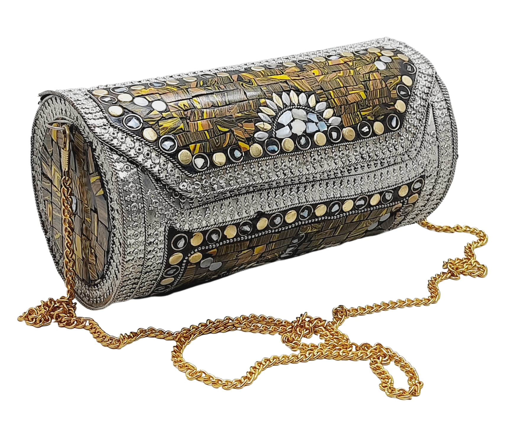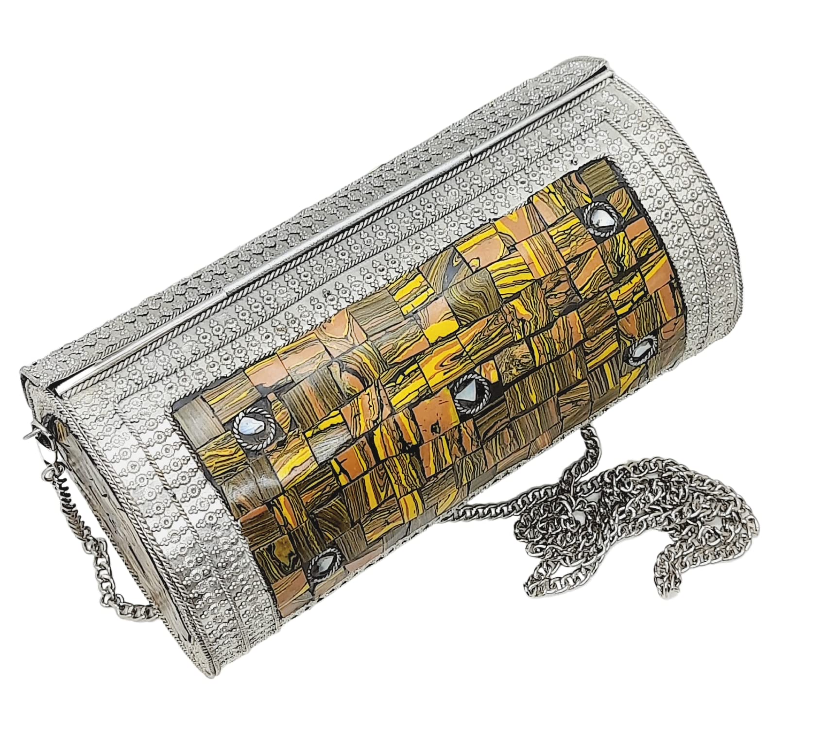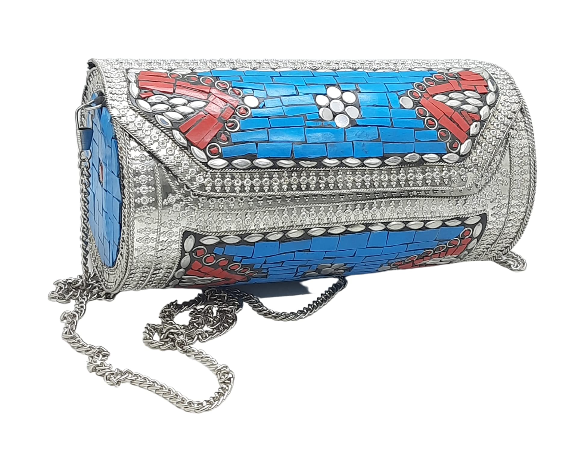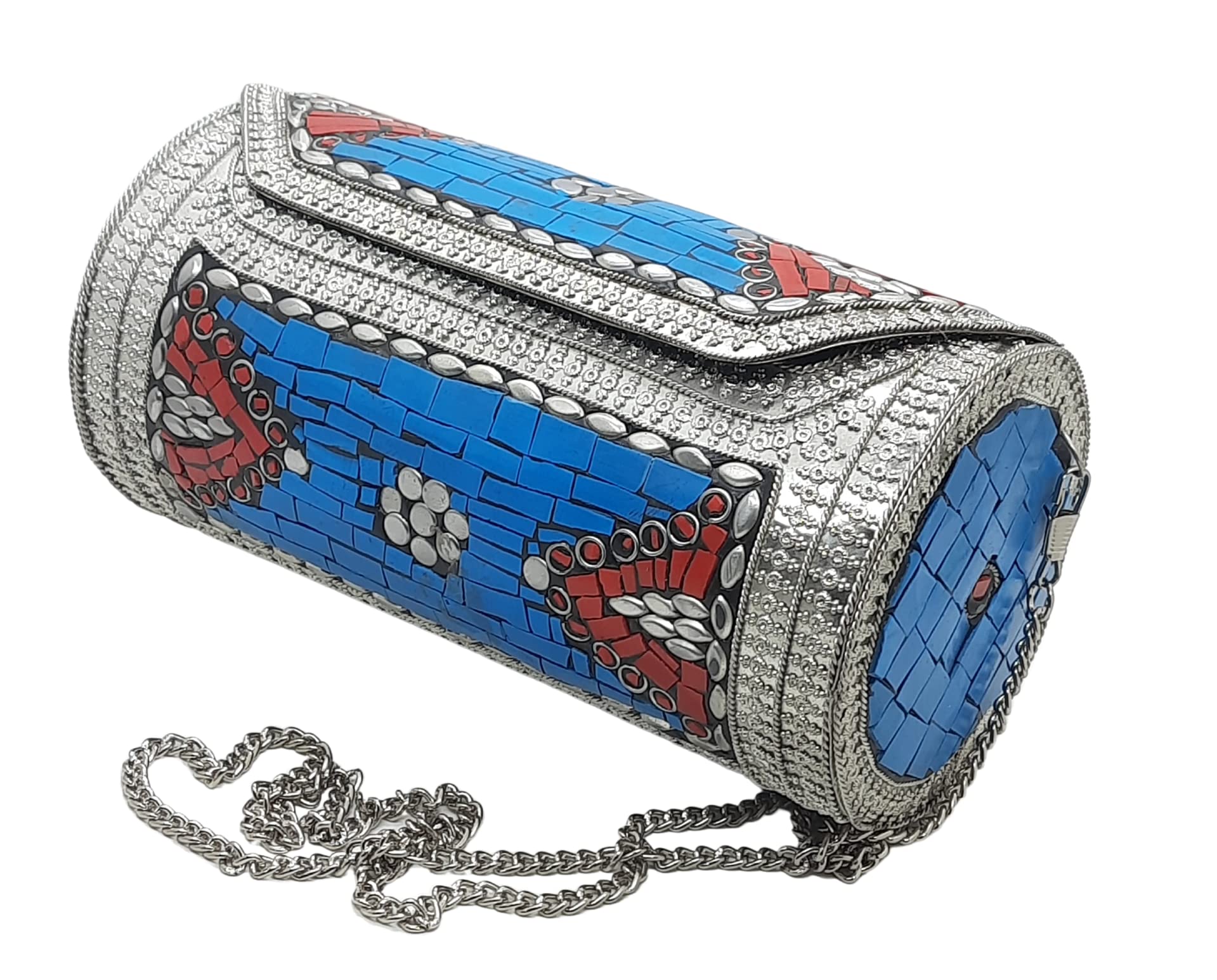 Trend Overseas Eye Catching Handmade Cylinder Round Ethnic Stone Metal bag Antique Bridal clutch