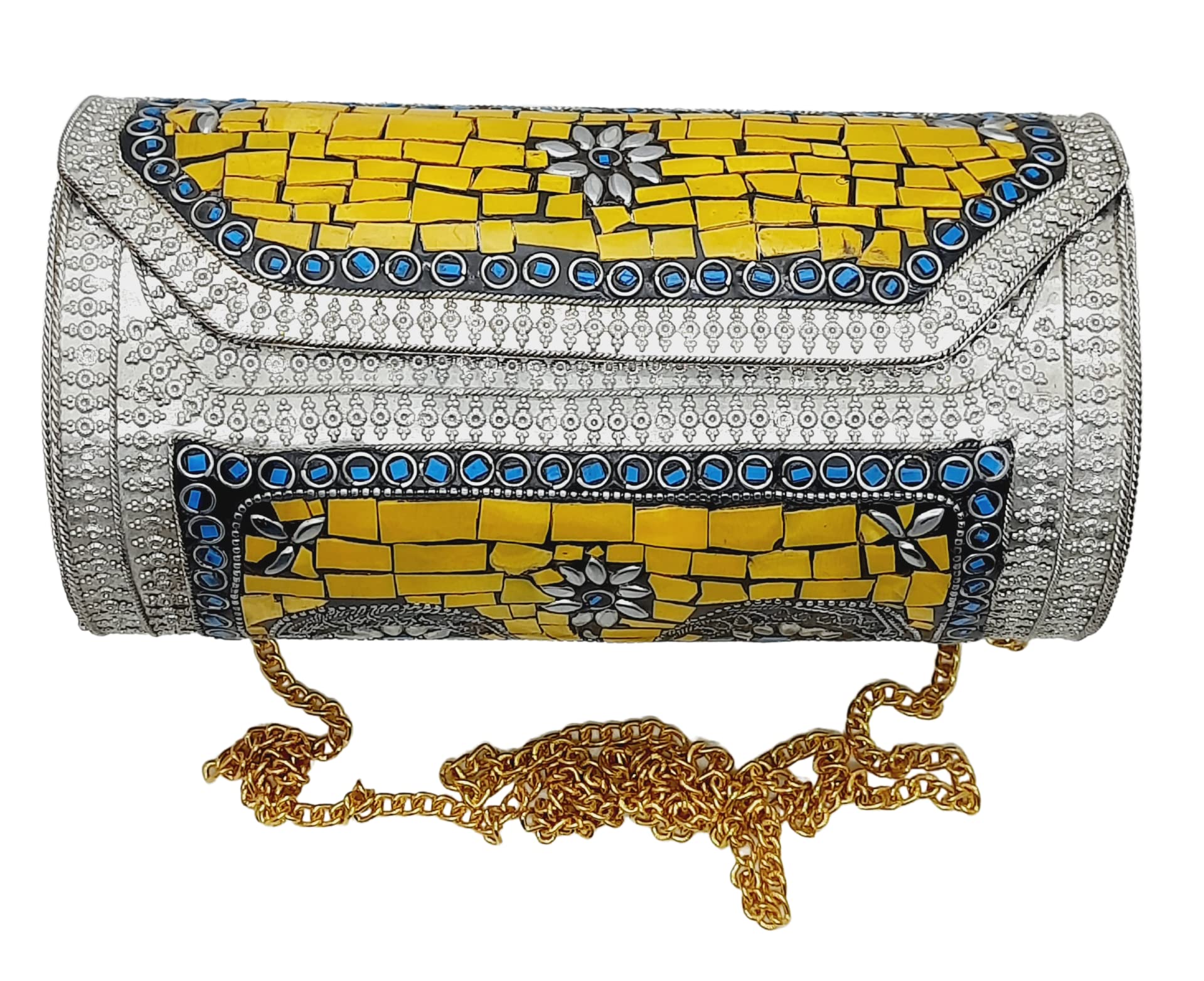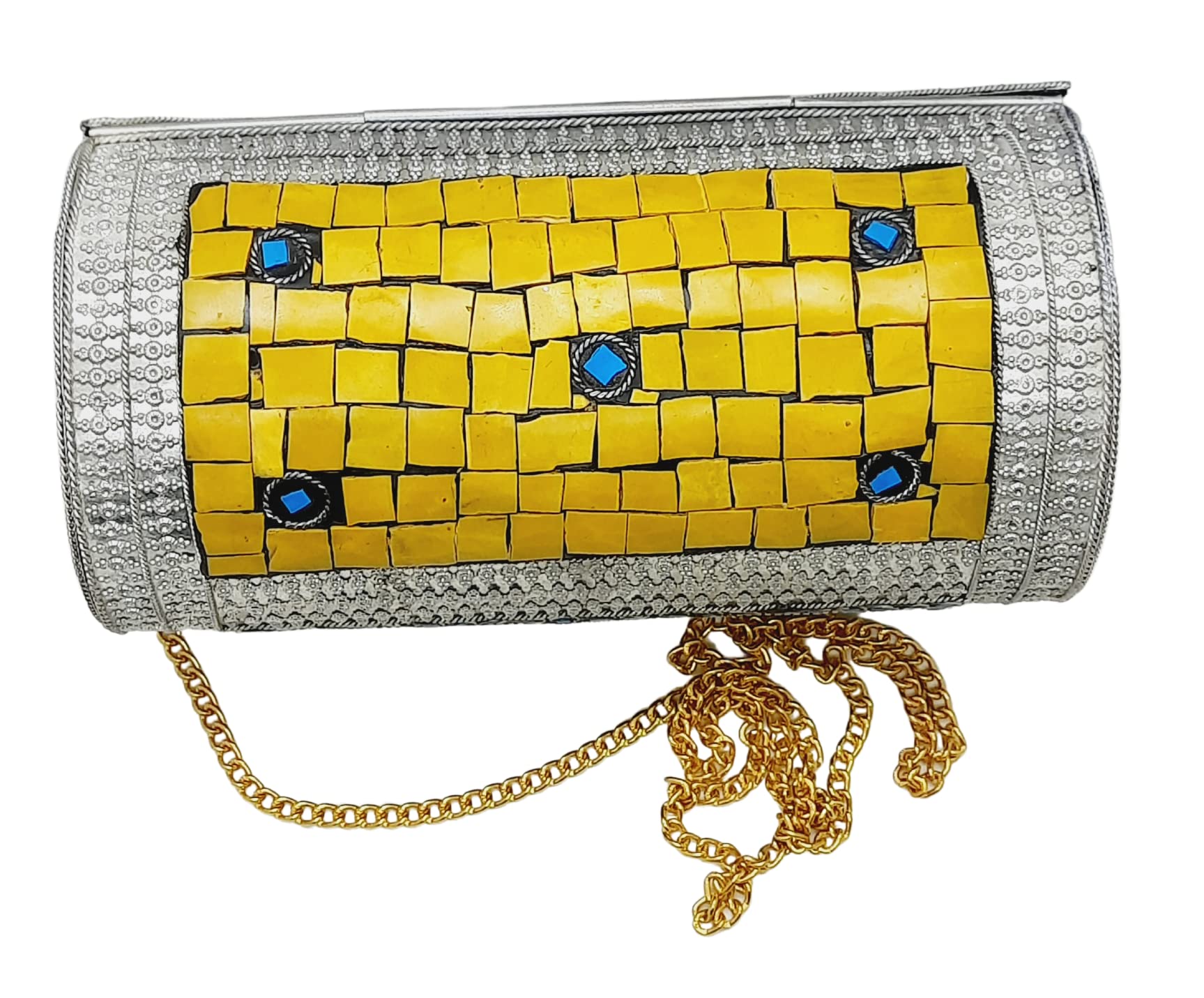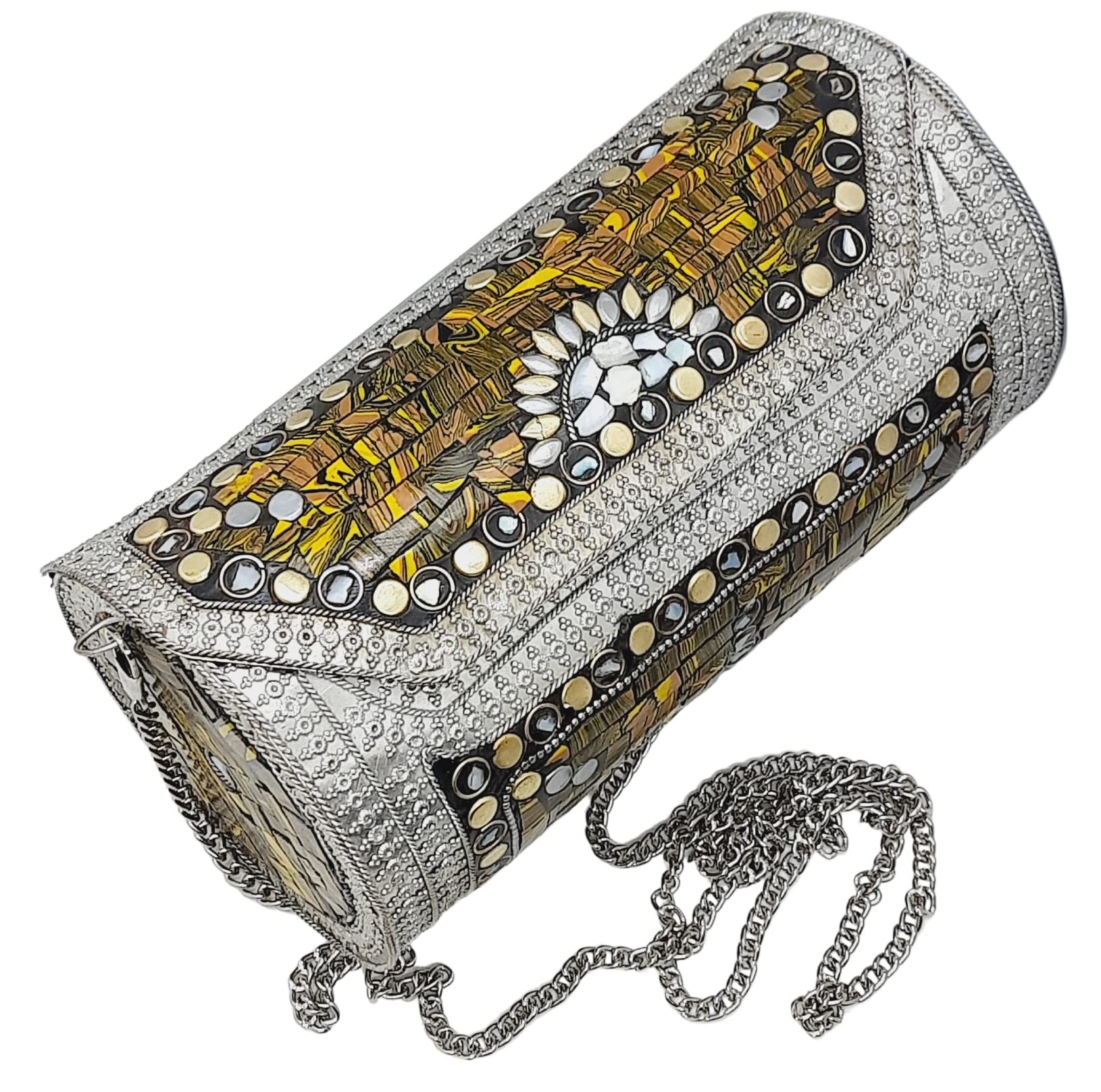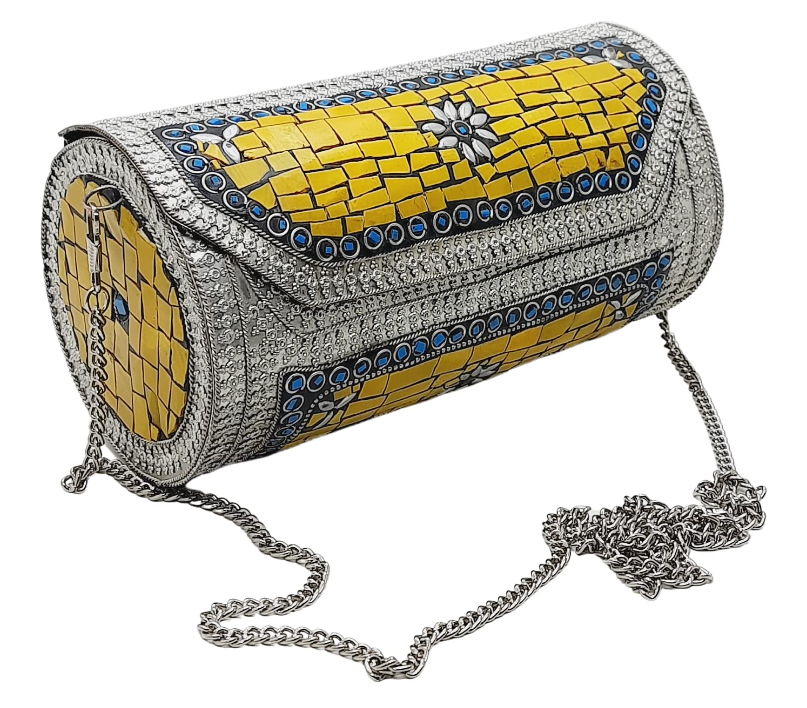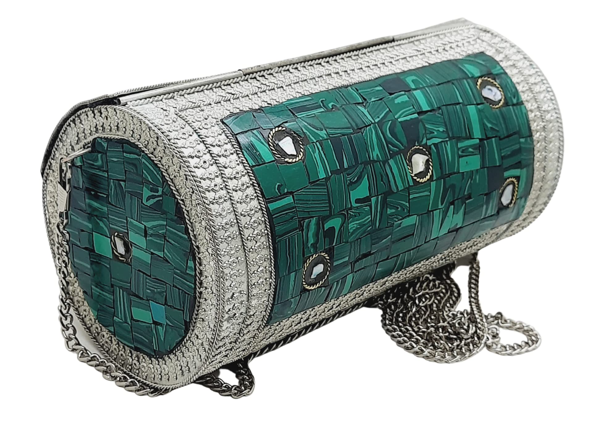 Trend Overseas Eye Catching Handmade Cylinder Round Ethnic Stone Metal bag Antique Bridal clutch