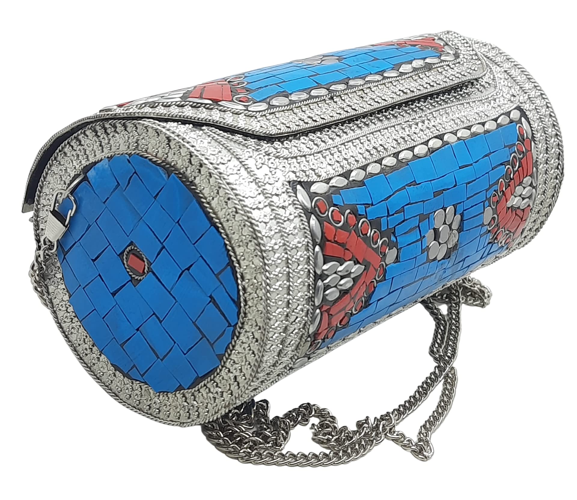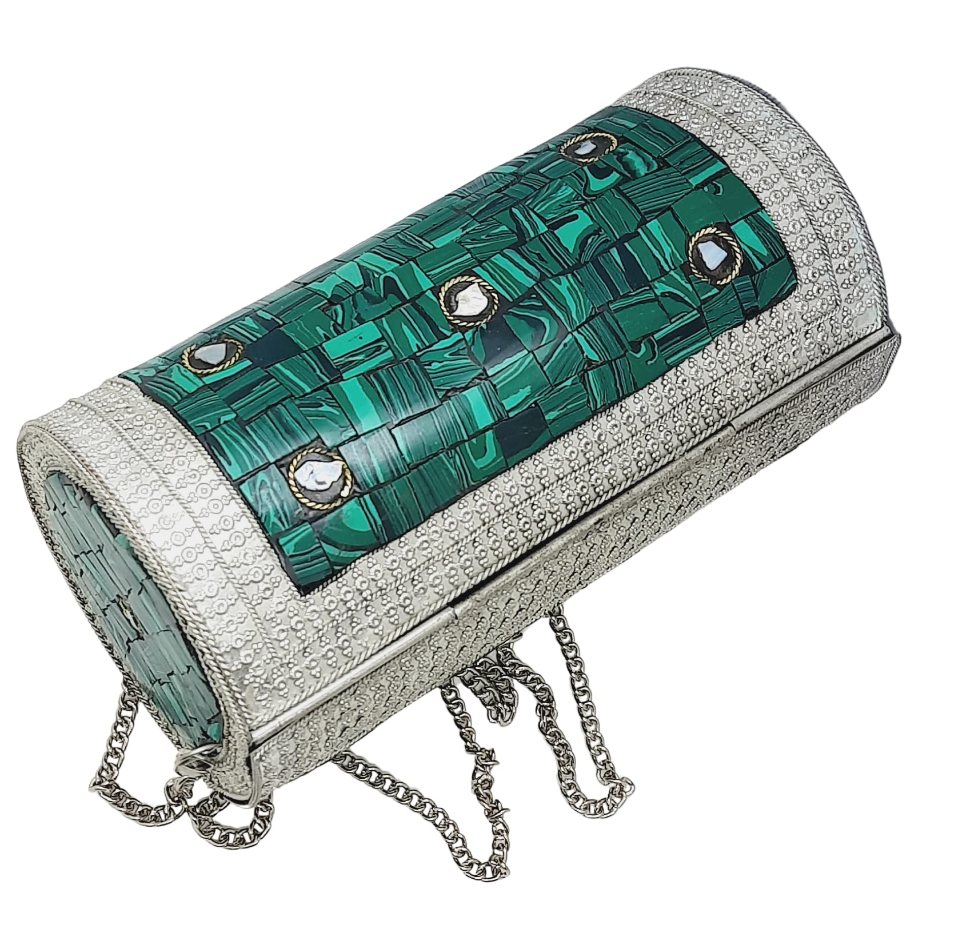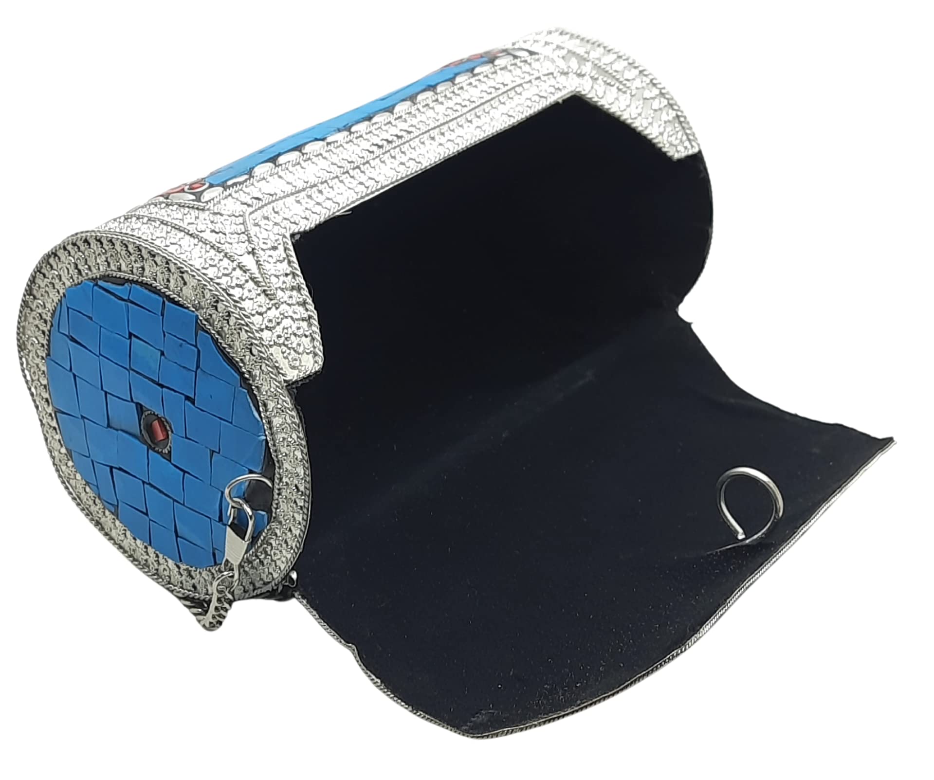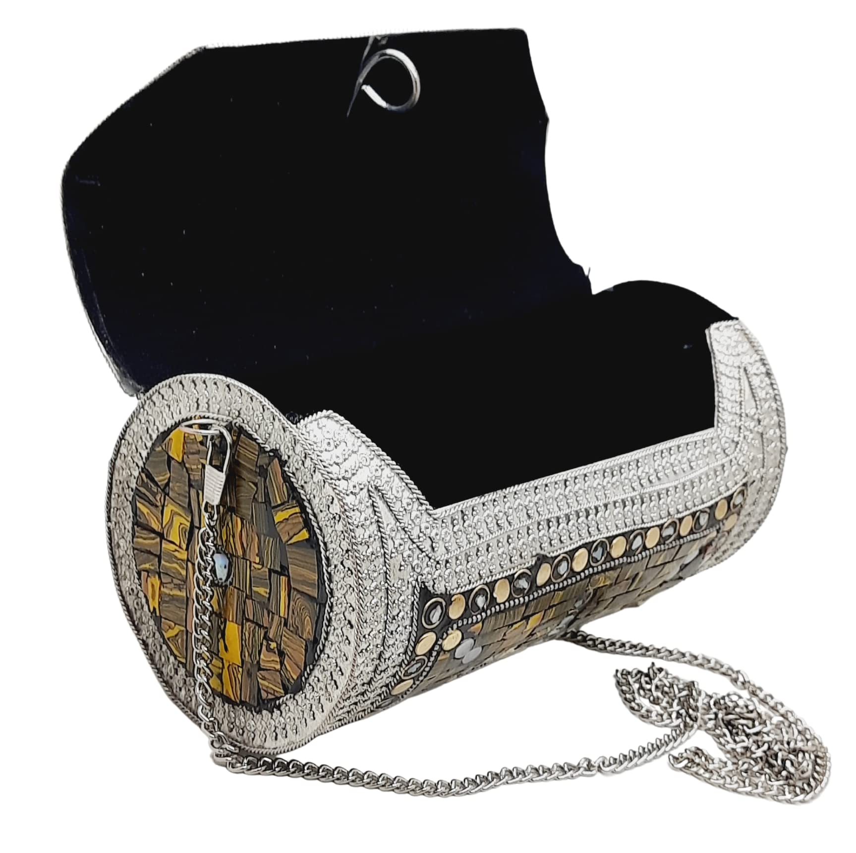 Trend Overseas Eye Catching Handmade Cylinder Round Ethnic Stone Metal bag Antique Bridal clutch