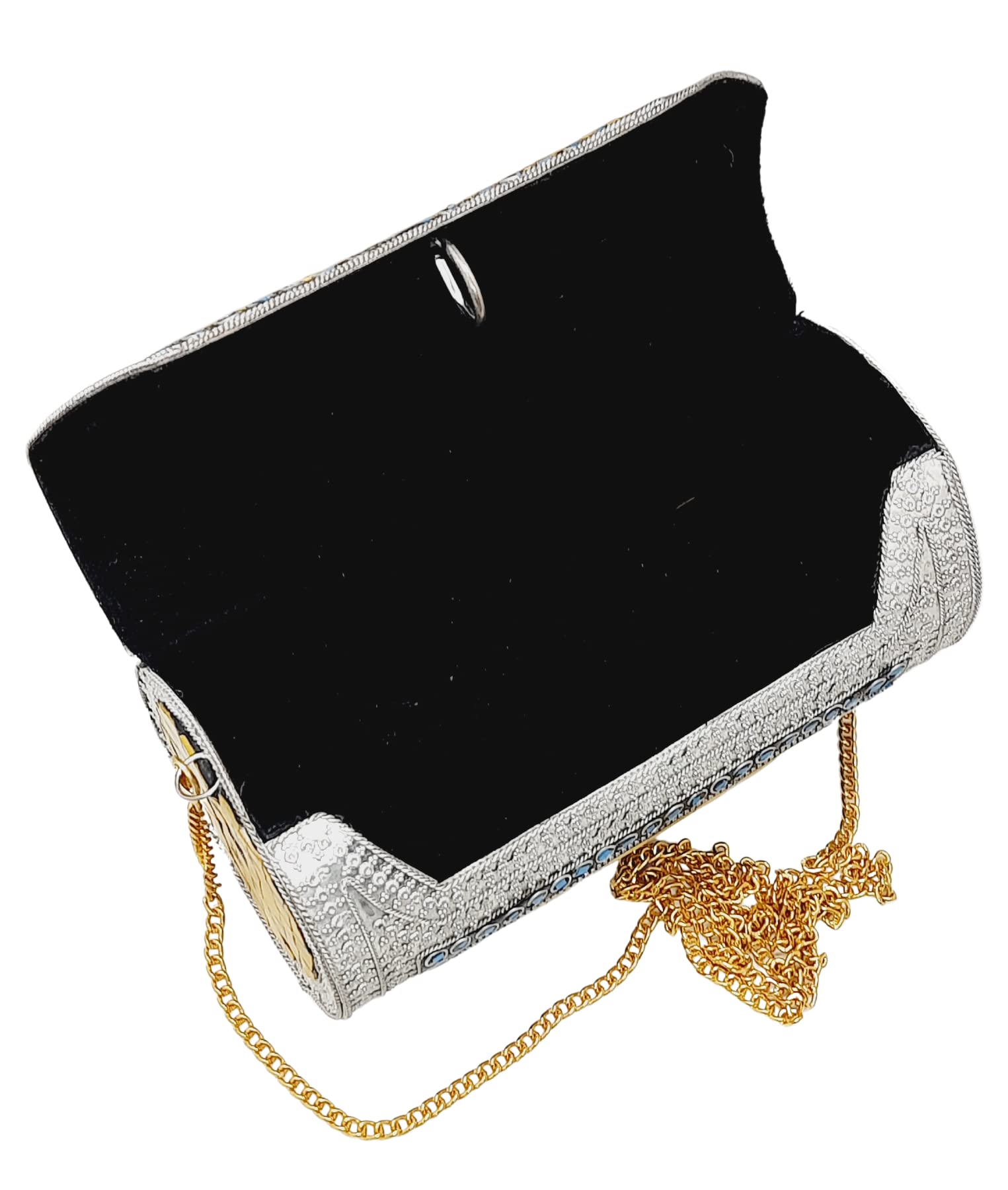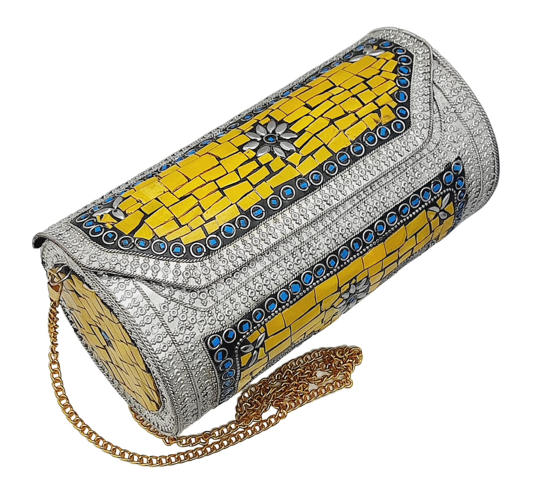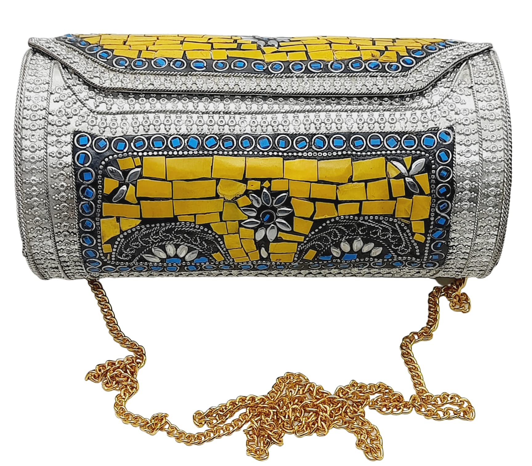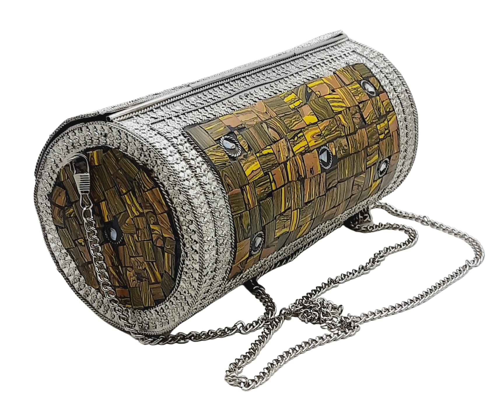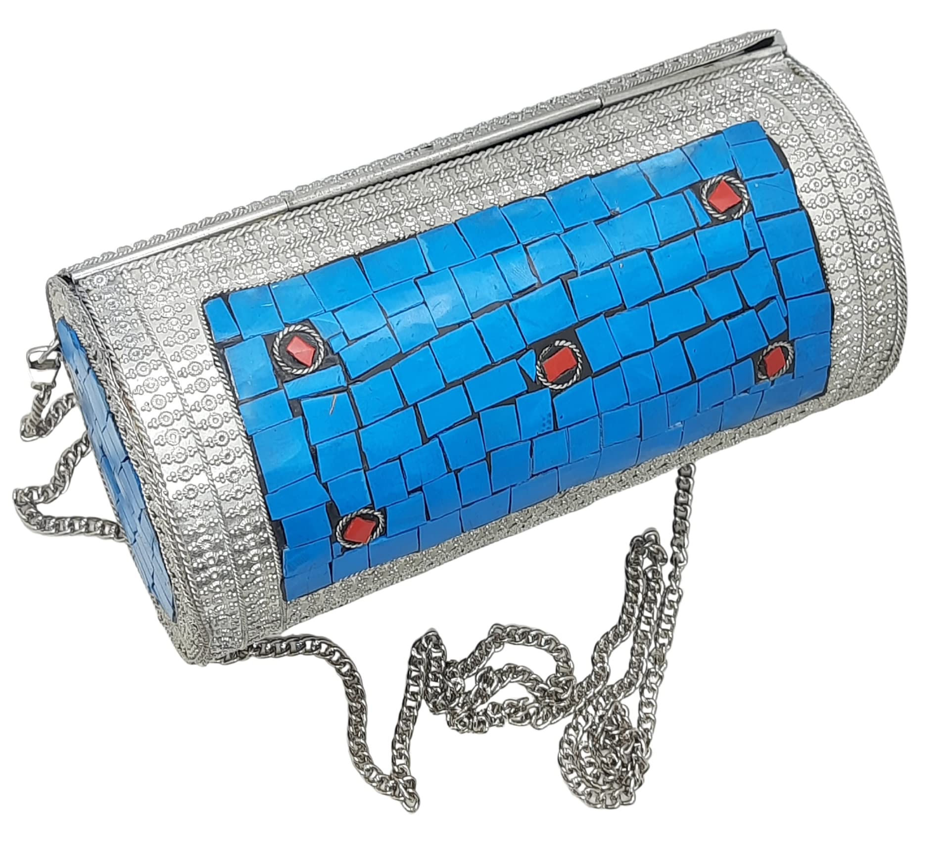 Trend Overseas Eye Catching Handmade Cylinder Round Ethnic Stone Metal bag Antique Bridal clutch