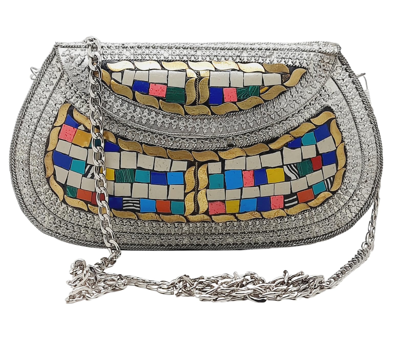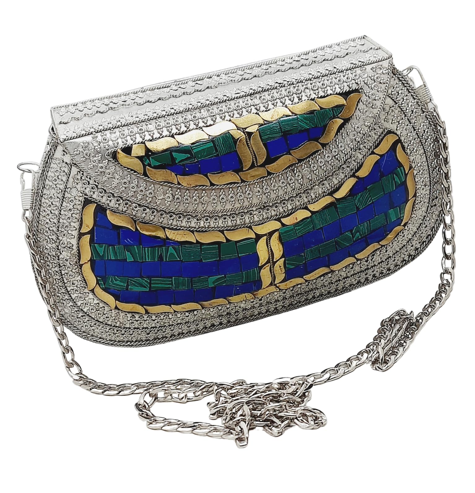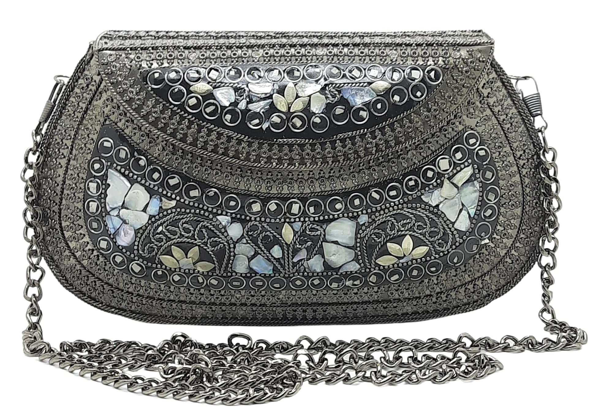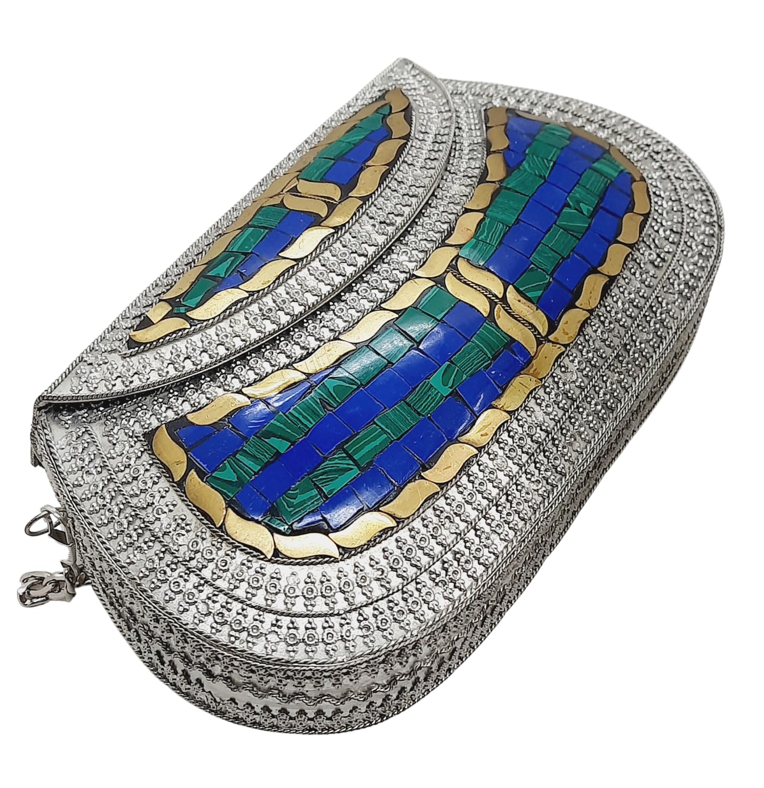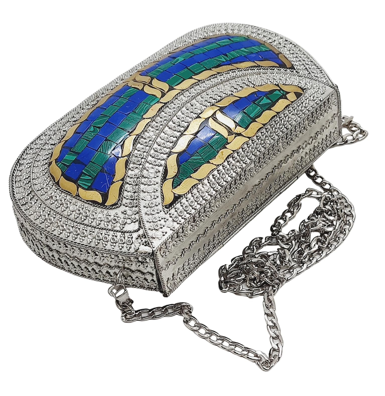 - [HANDMADE CLUTCH] This bag is meticulously handcrafted and made from metal, giving it a unique and antique look. It is also decorated with multi-color stones for added elegance.