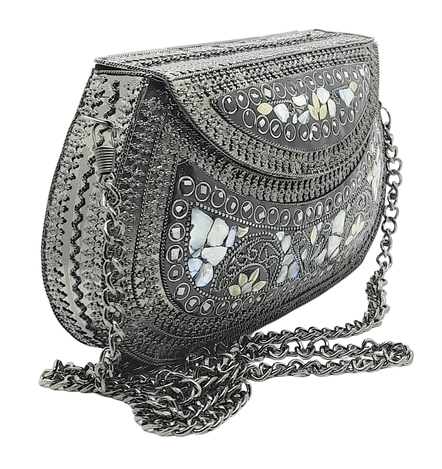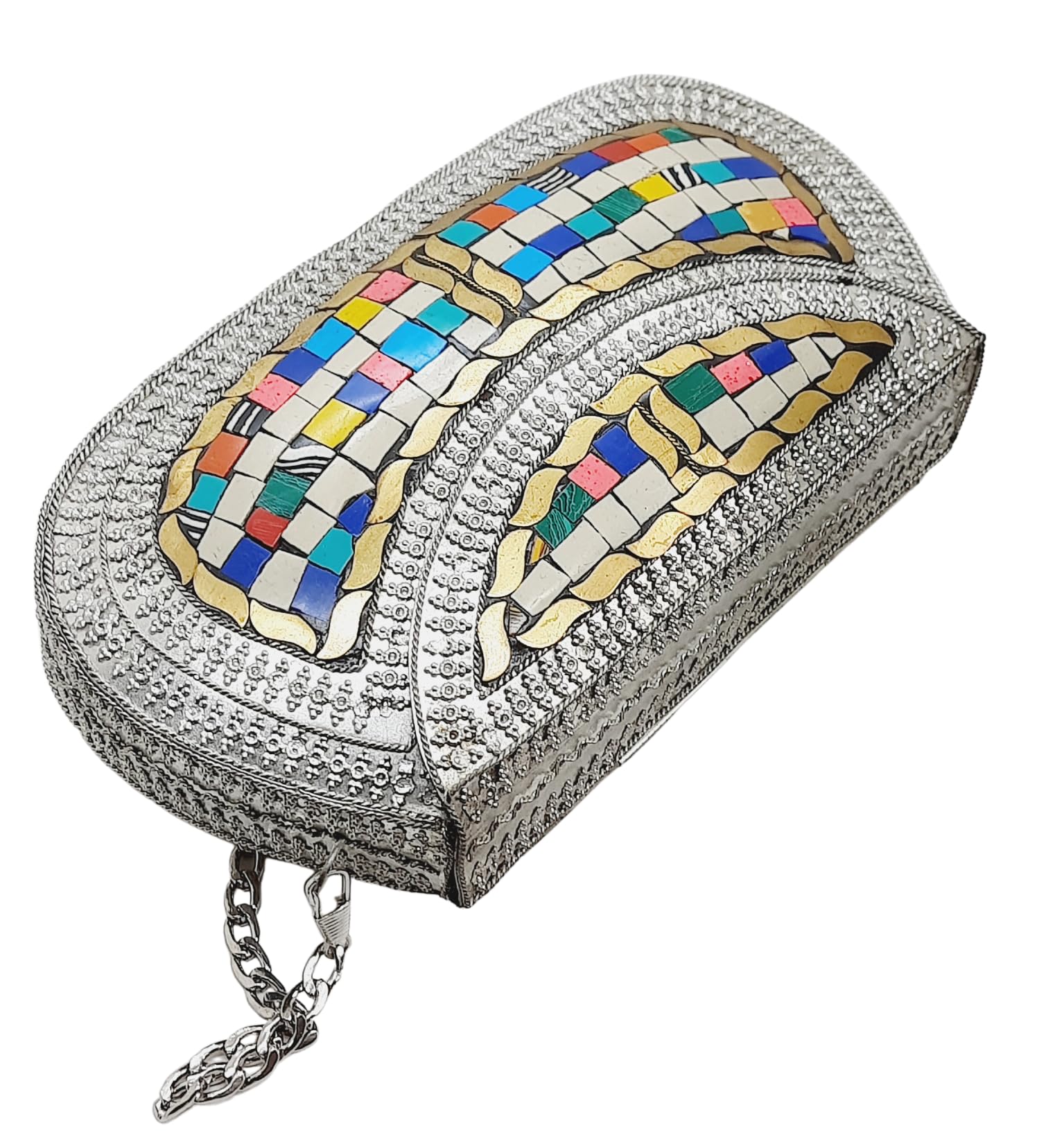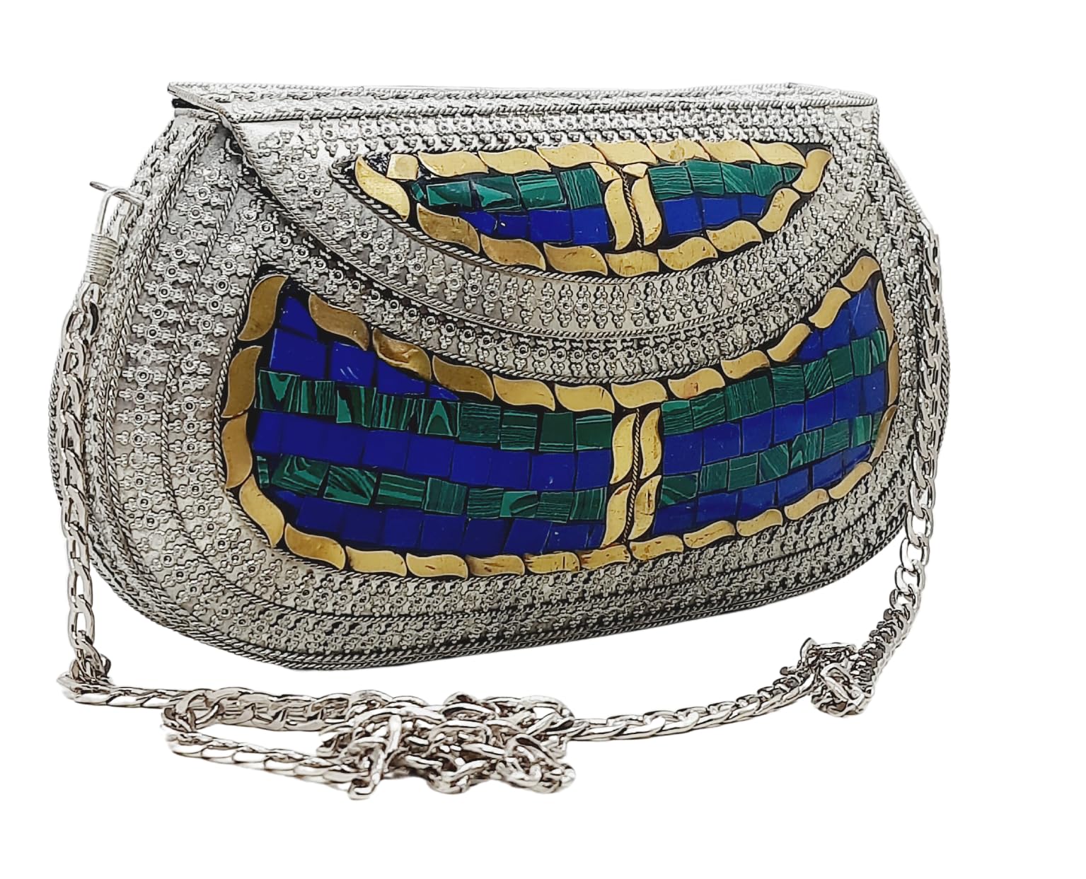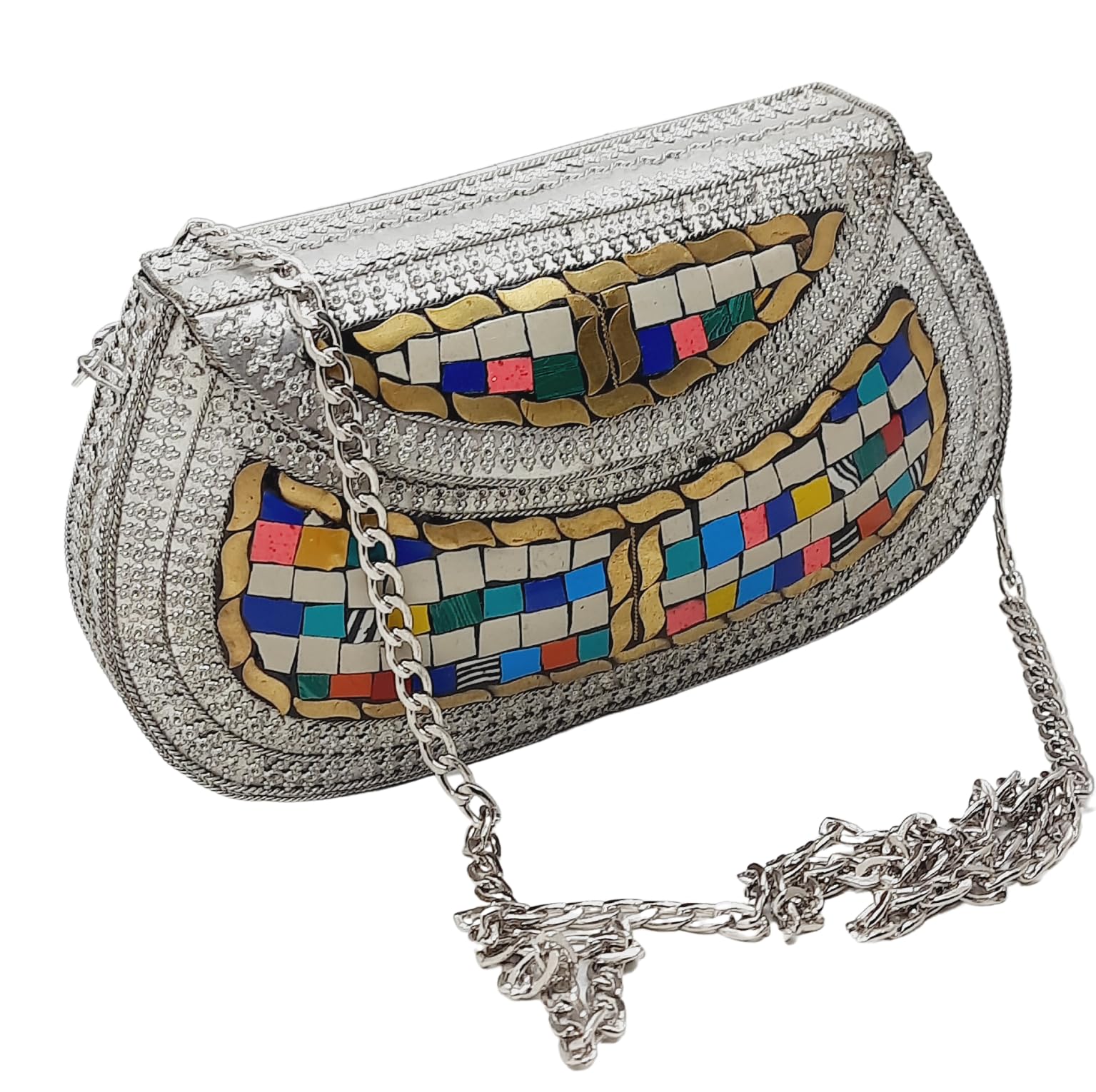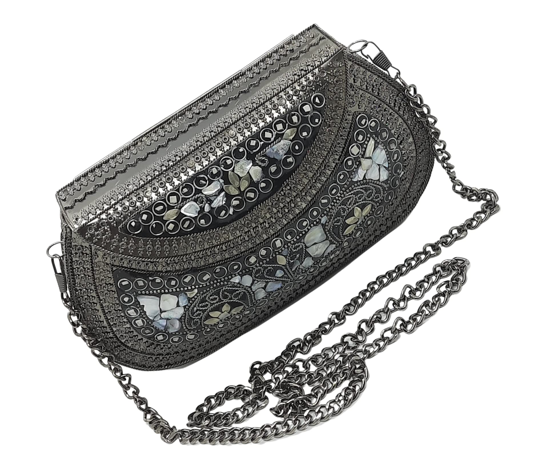- [HANDMADE CLUTCH] This bag is meticulously handcrafted and made from metal, giving it a unique and antique look. It is also decorated with multi-color stones for added elegance.