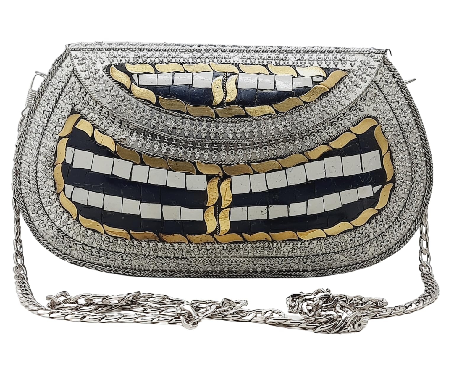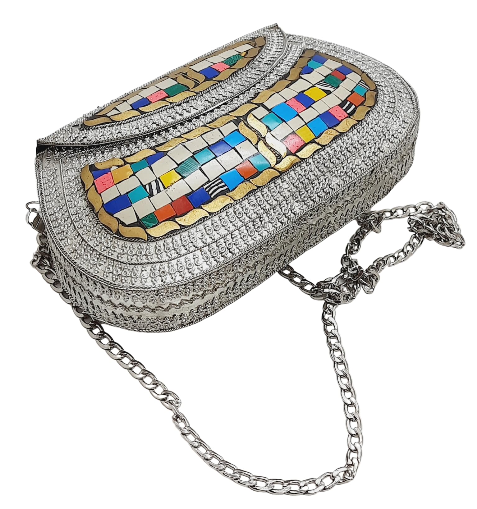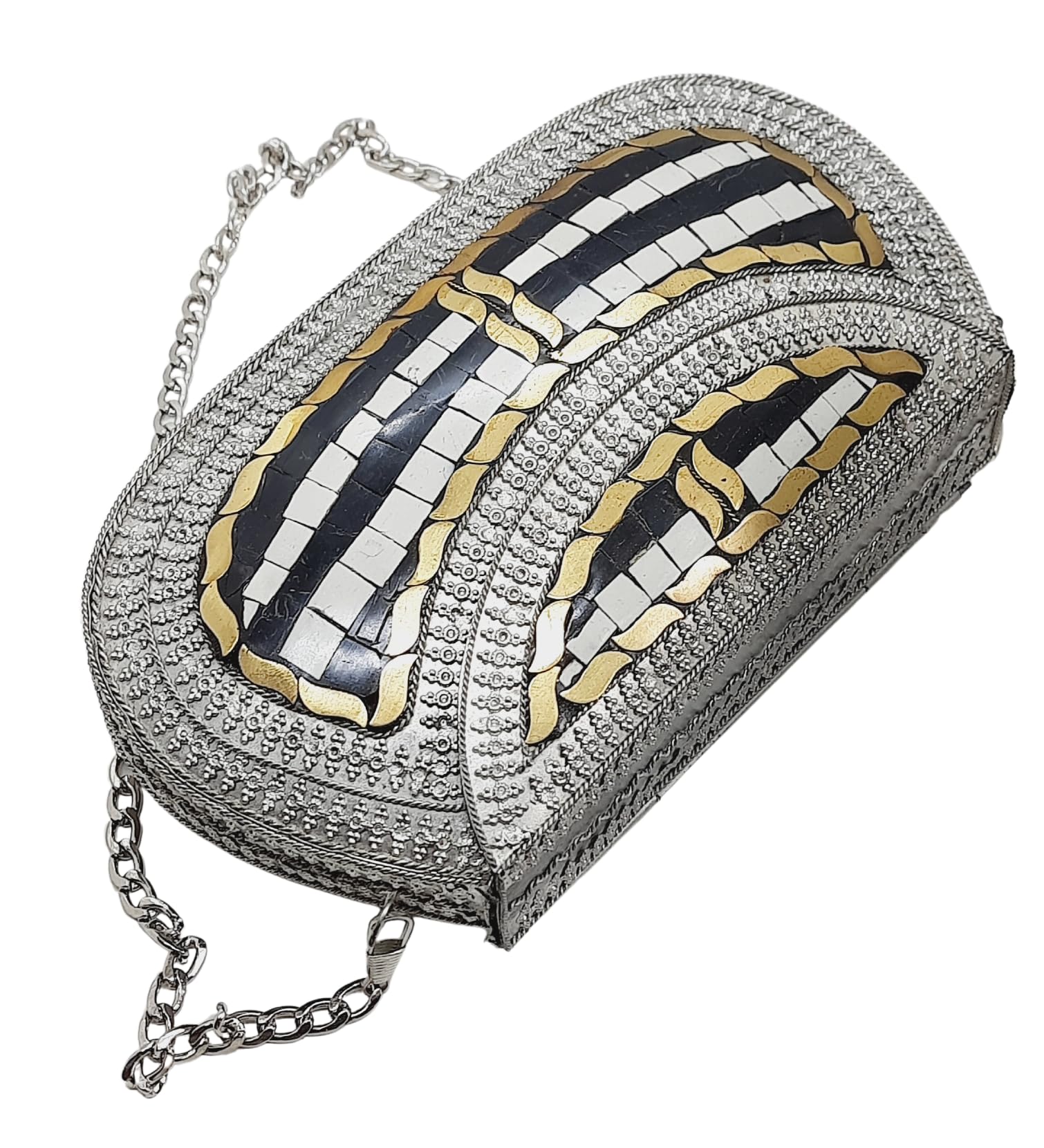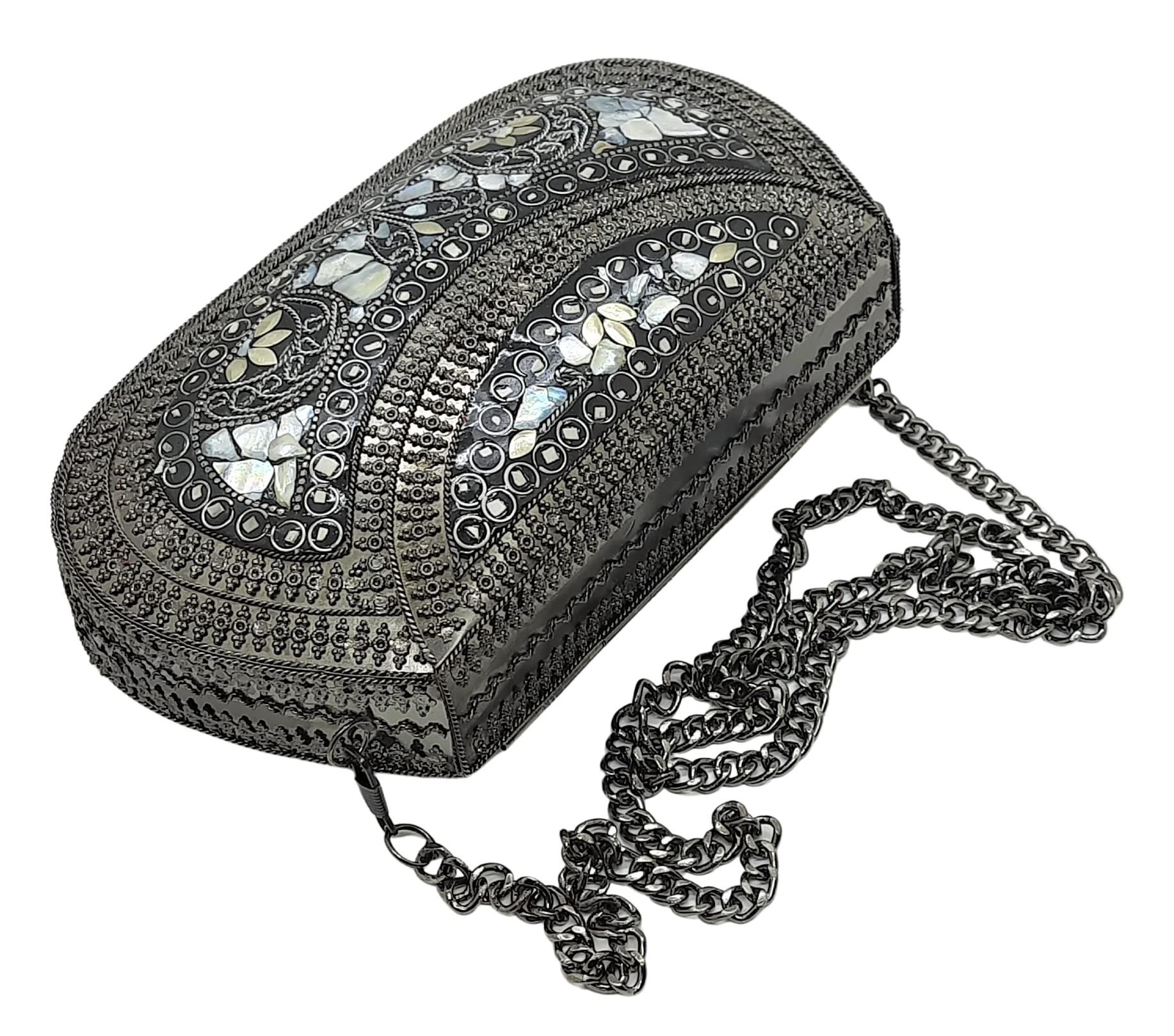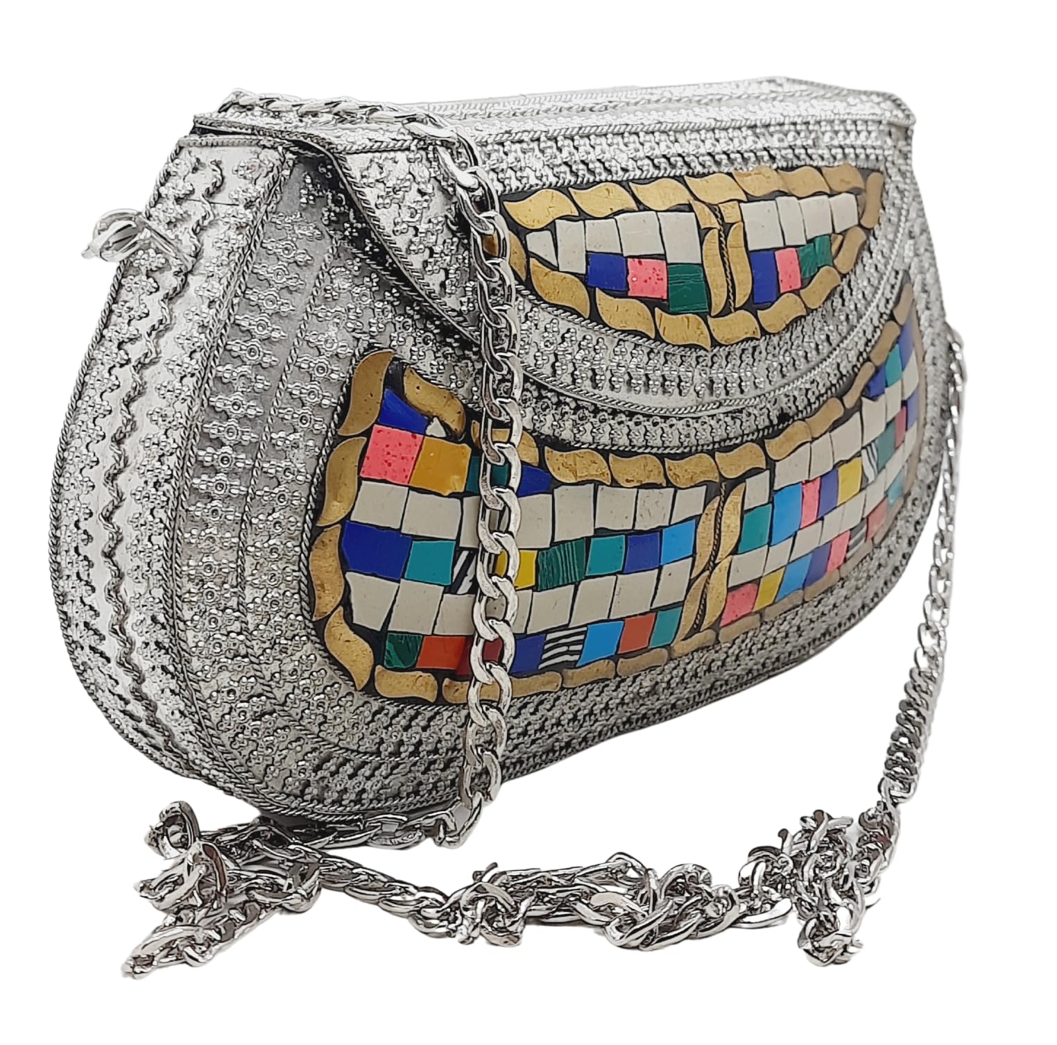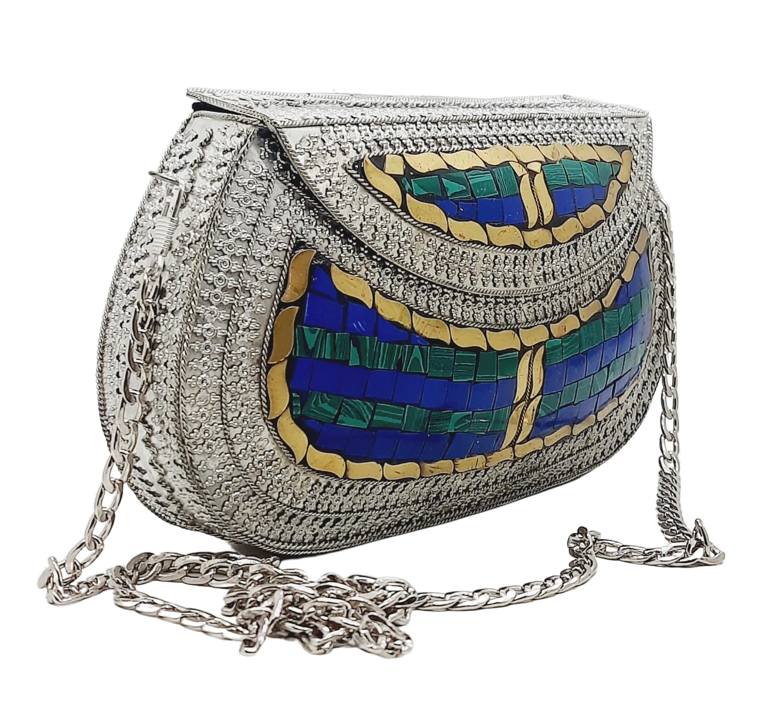 - [HANDMADE CLUTCH] This bag is meticulously handcrafted and made from metal, giving it a unique and antique look. It is also decorated with multi-color stones for added elegance.