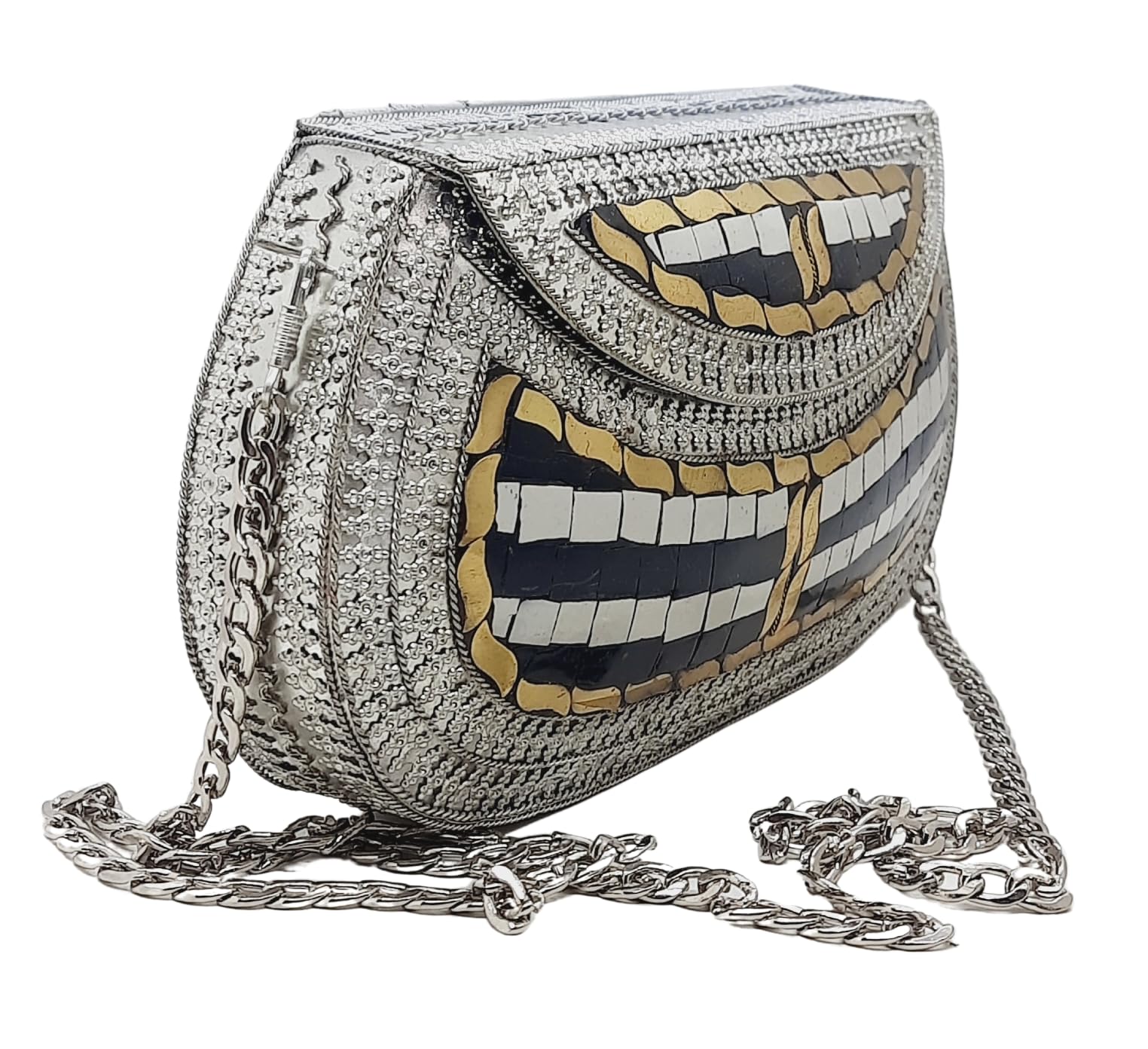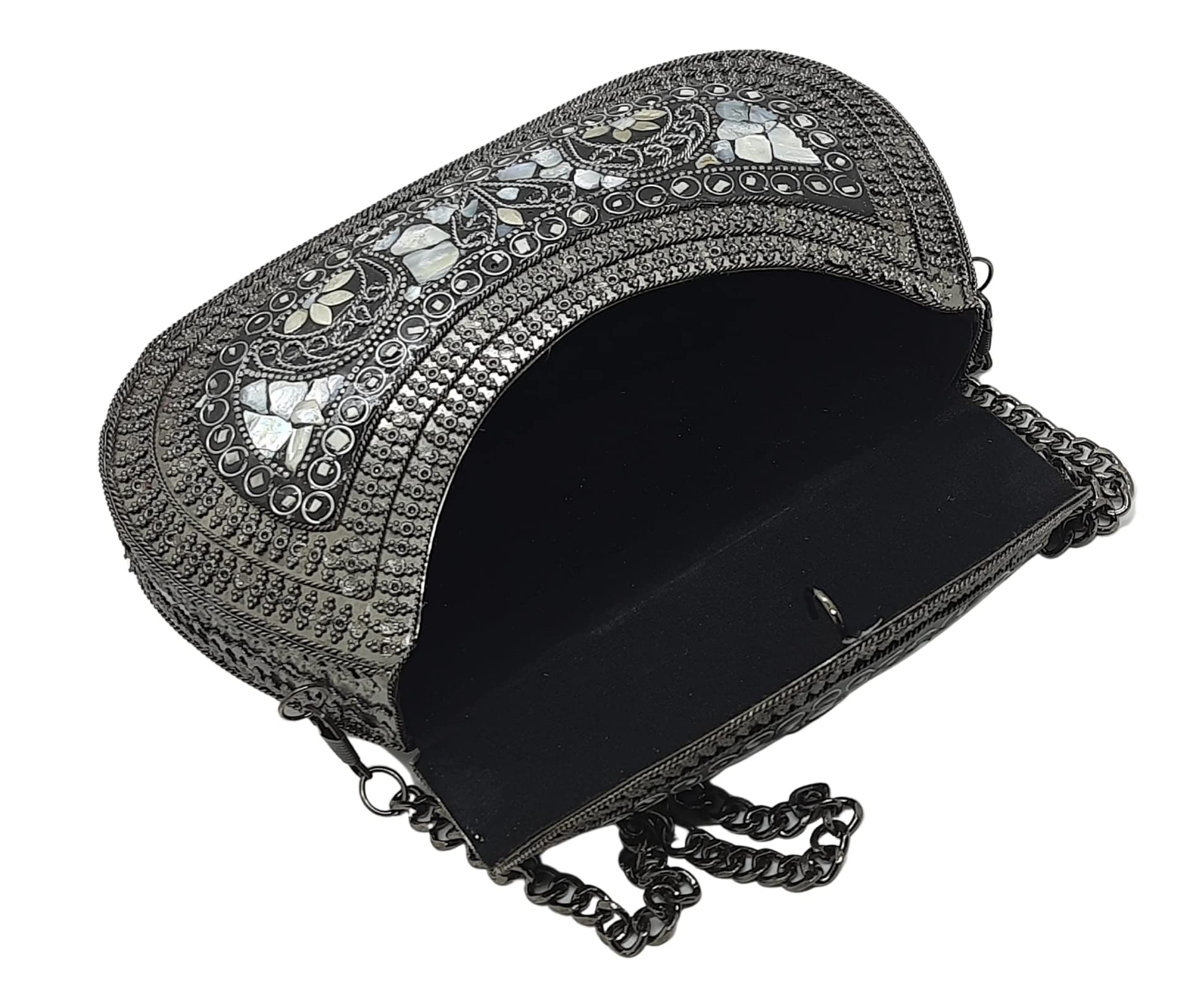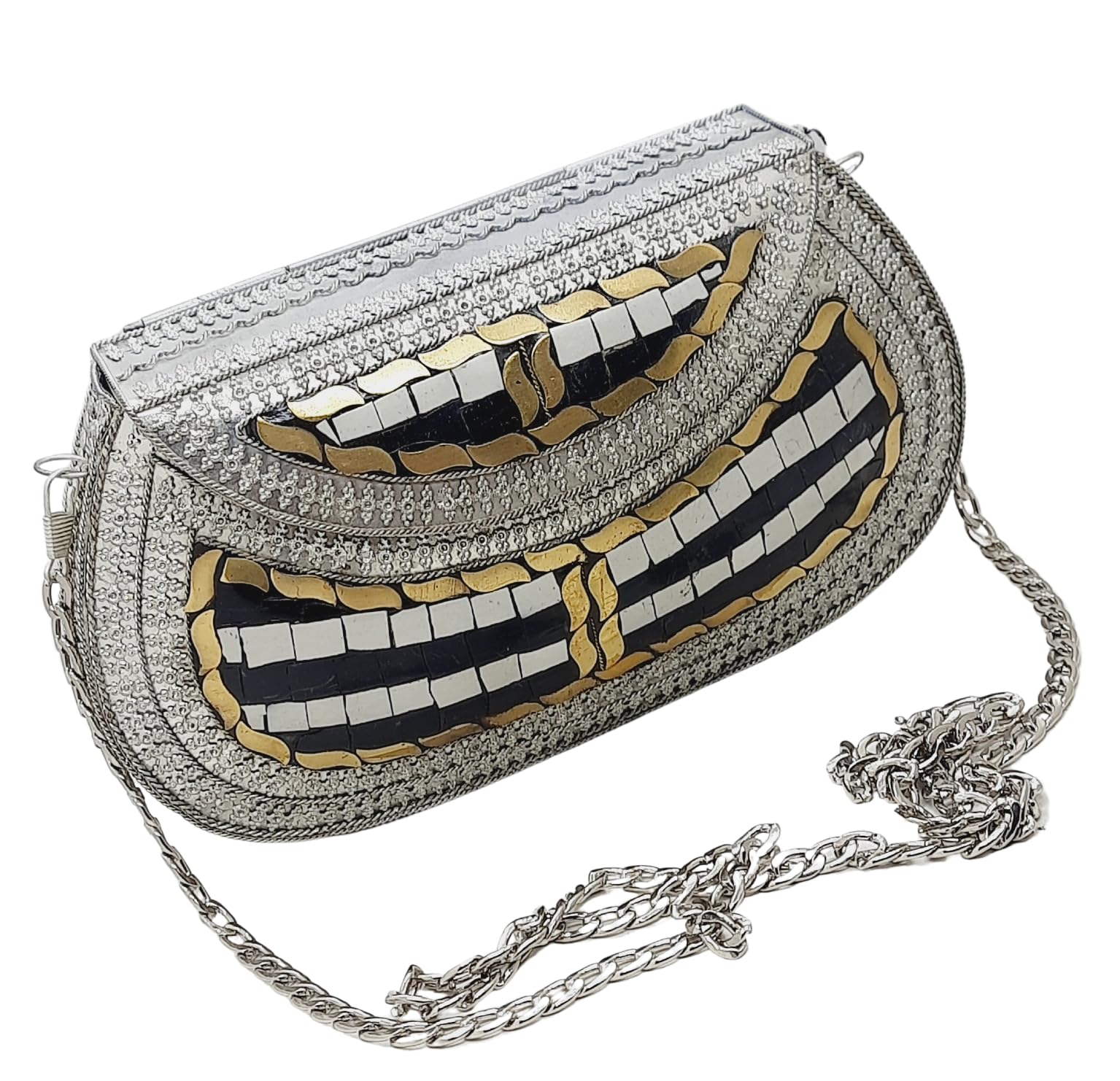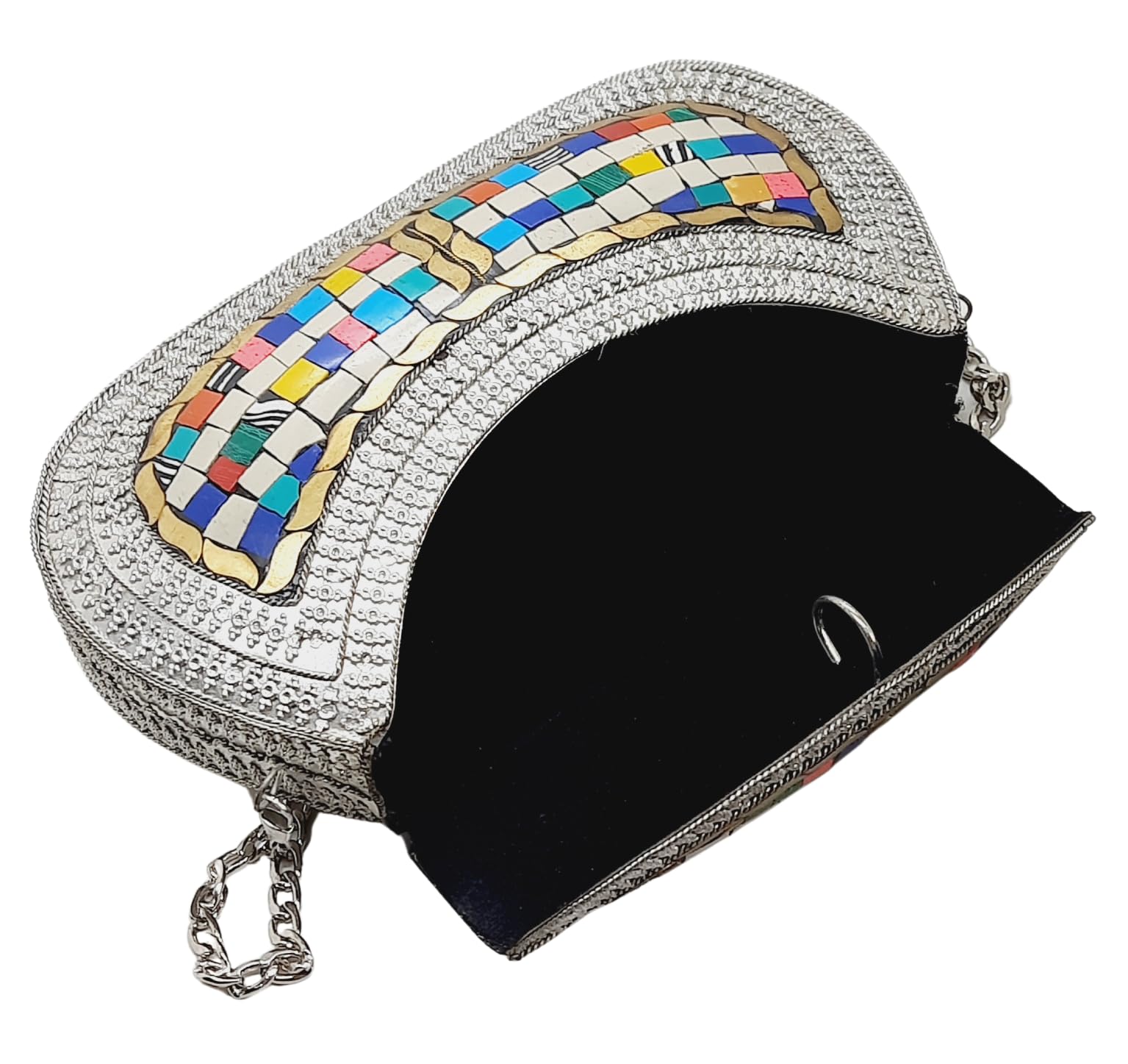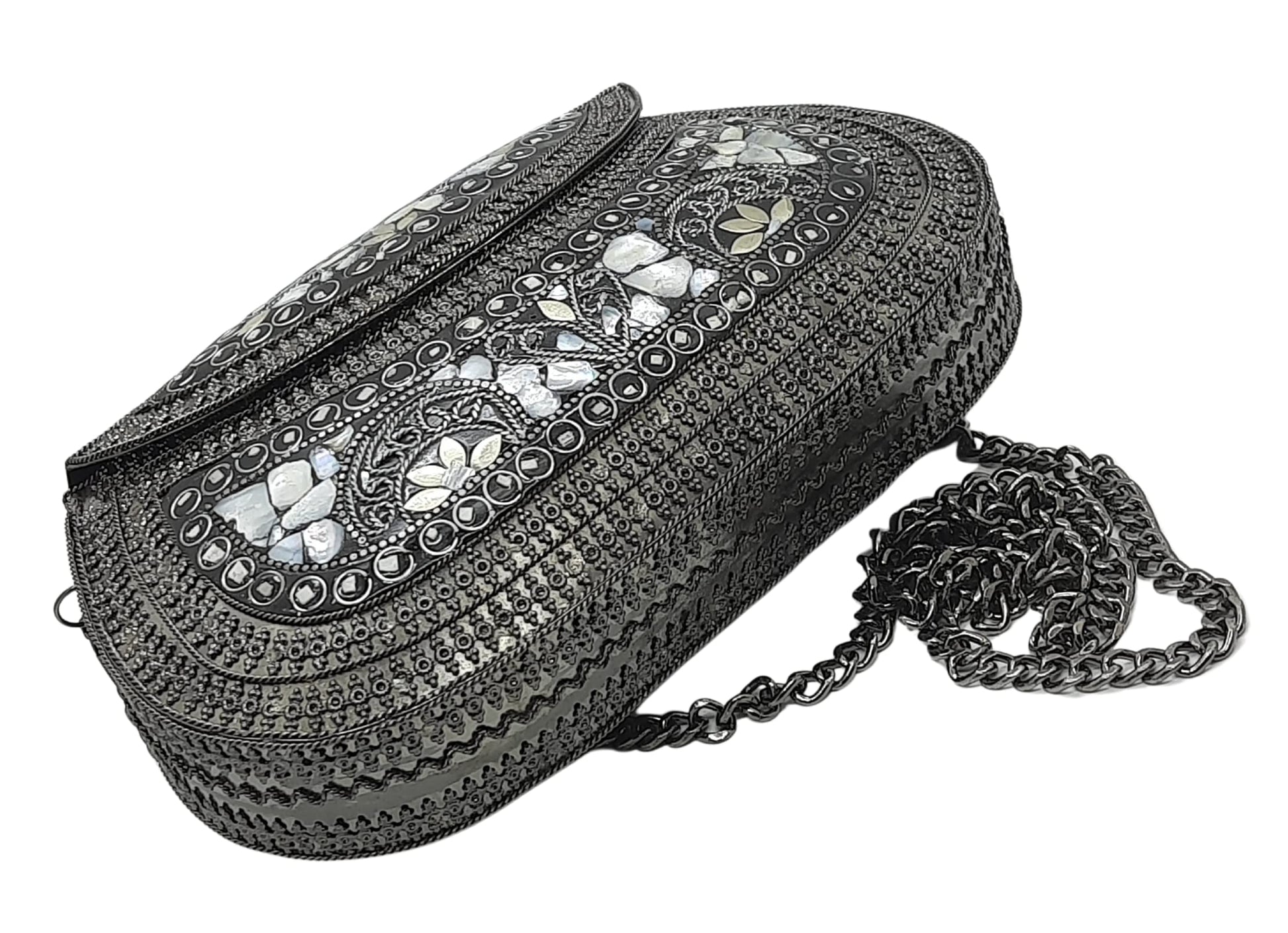 - [HANDMADE CLUTCH] This bag is meticulously handcrafted and made from metal, giving it a unique and antique look. It is also decorated with multi-color stones for added elegance.