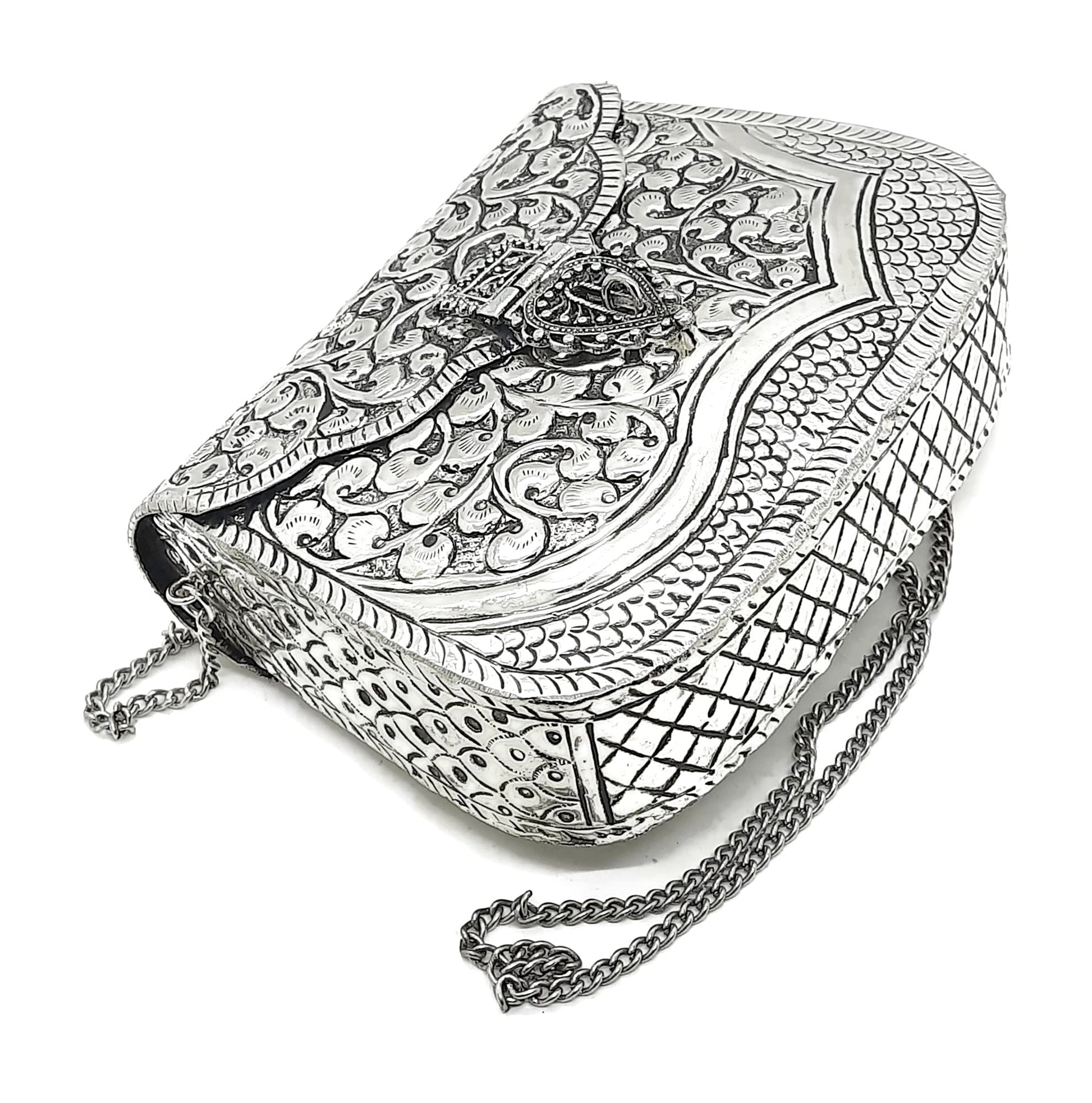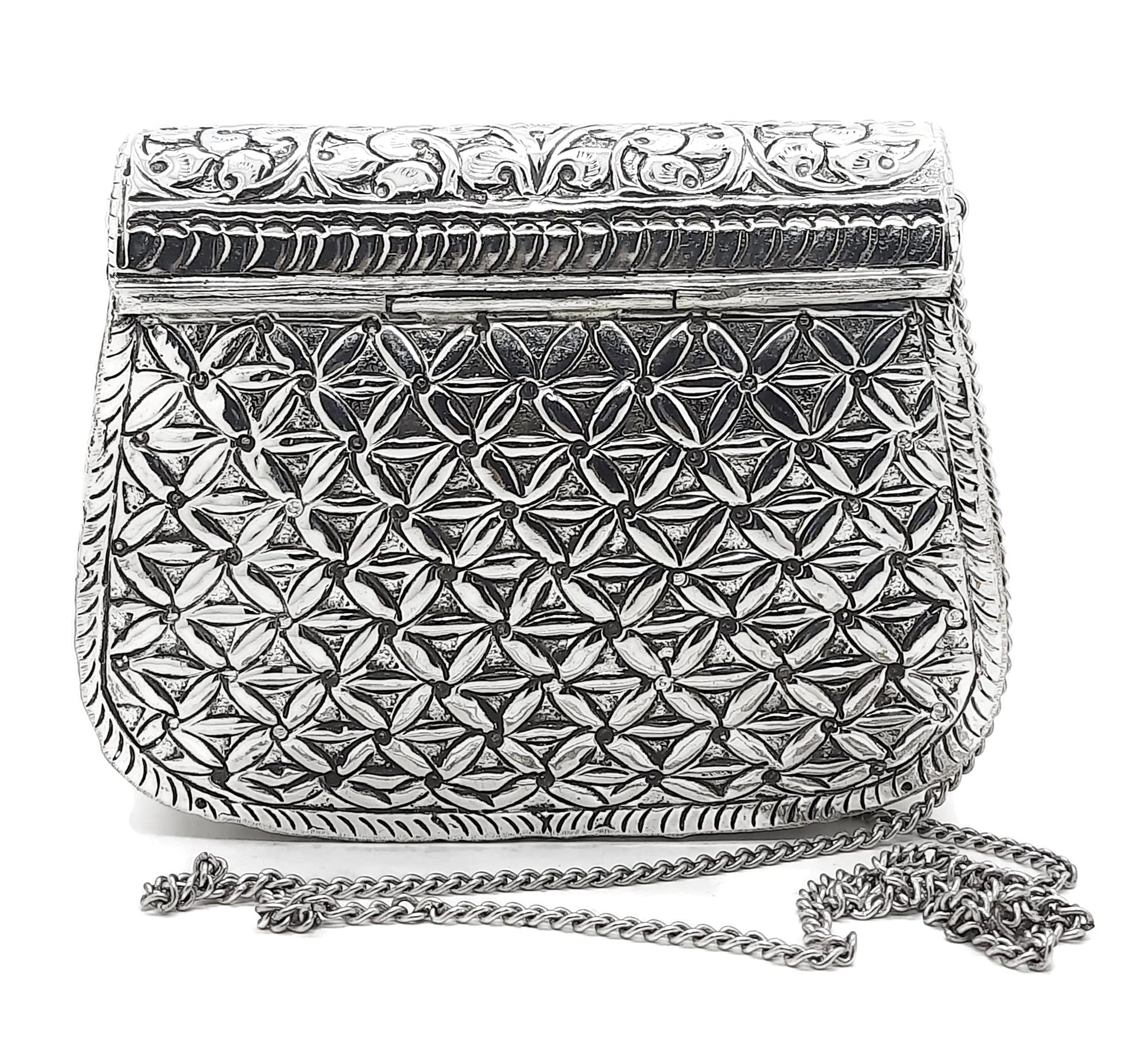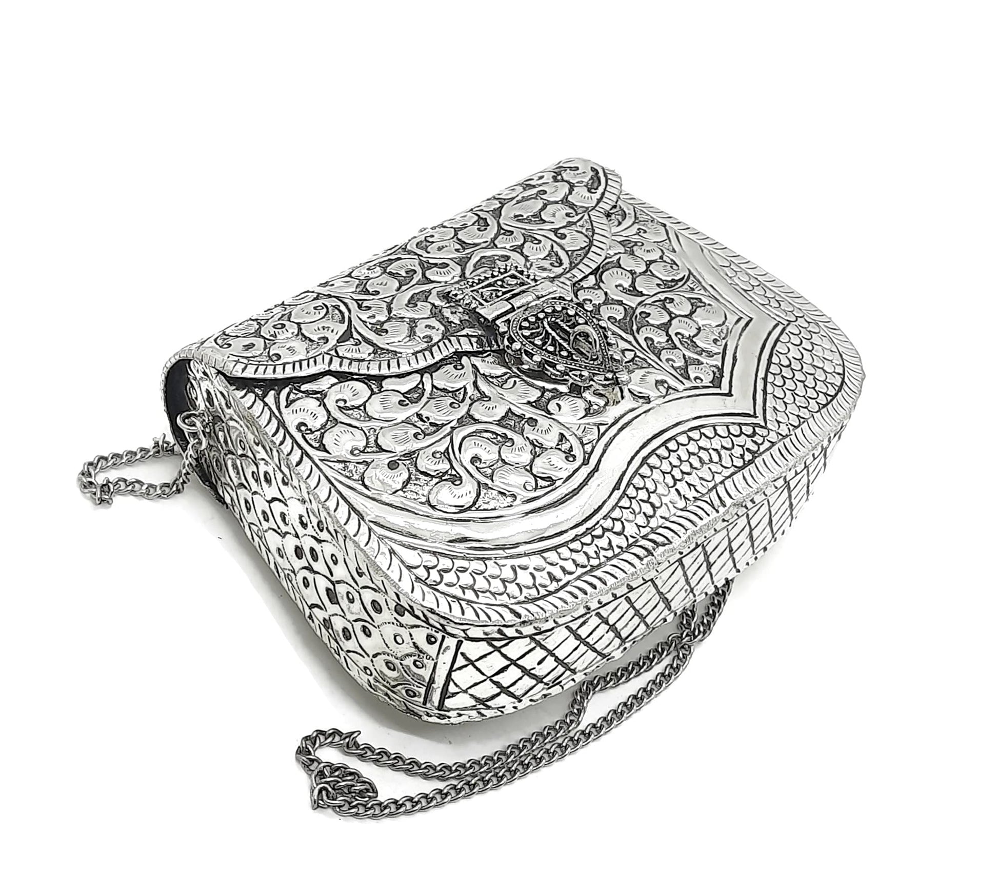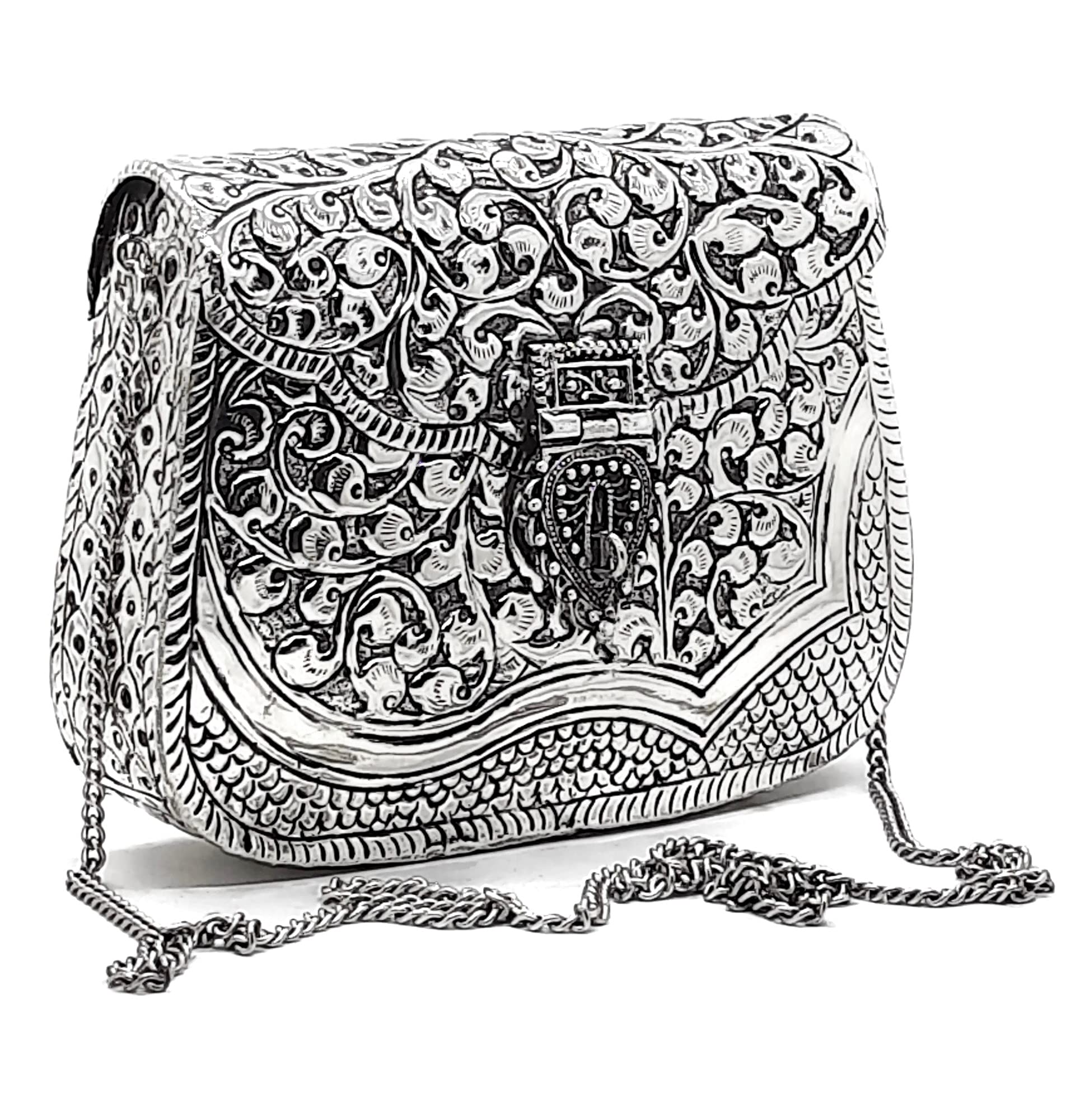 Handmade Ethnic Clutch cum sling bag made Brass Metal . A basic Brass metal object is fist designed and fine carving is done on it by hand. The process is finally completed by oxidization and polishing. Unique bag can Accommodate small size Cellphone and other small accessories. Size: Length 7 Inch, Width 2 Inch, Height 5.5 Inch, Weight 390 gm . Very nice and eye catching stuff , when you wear every one ask you.