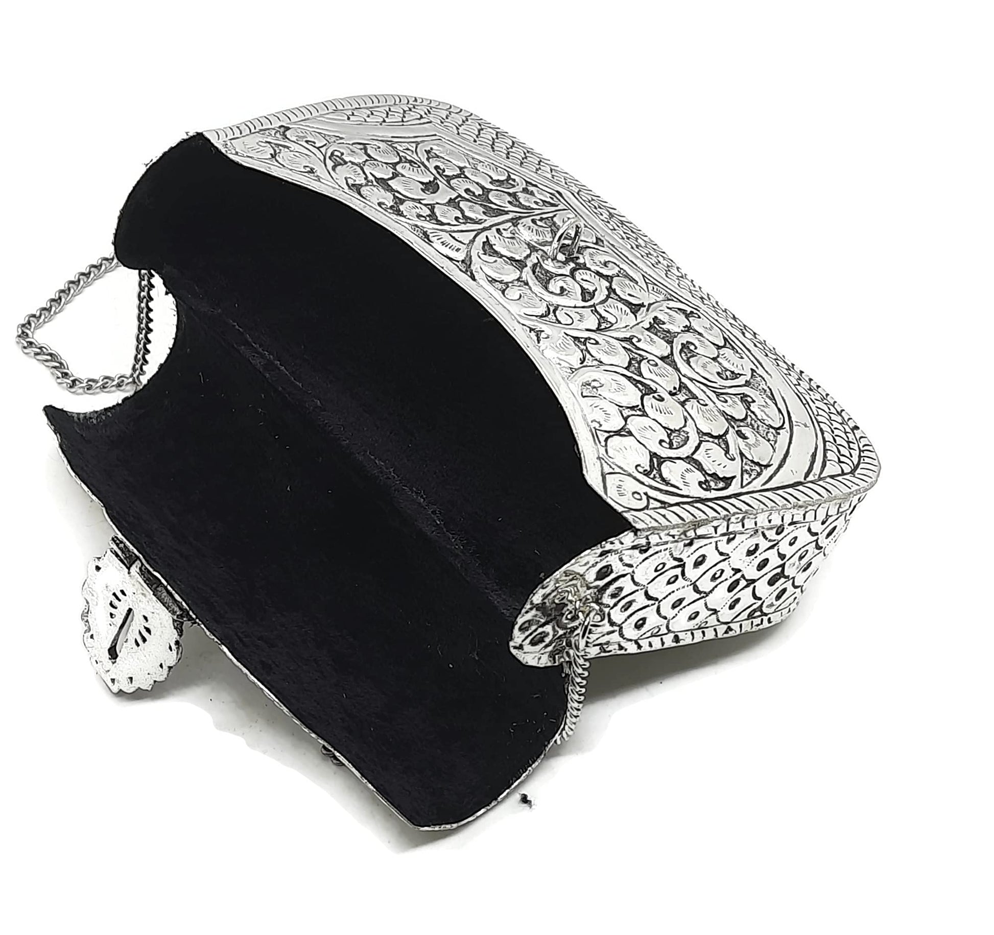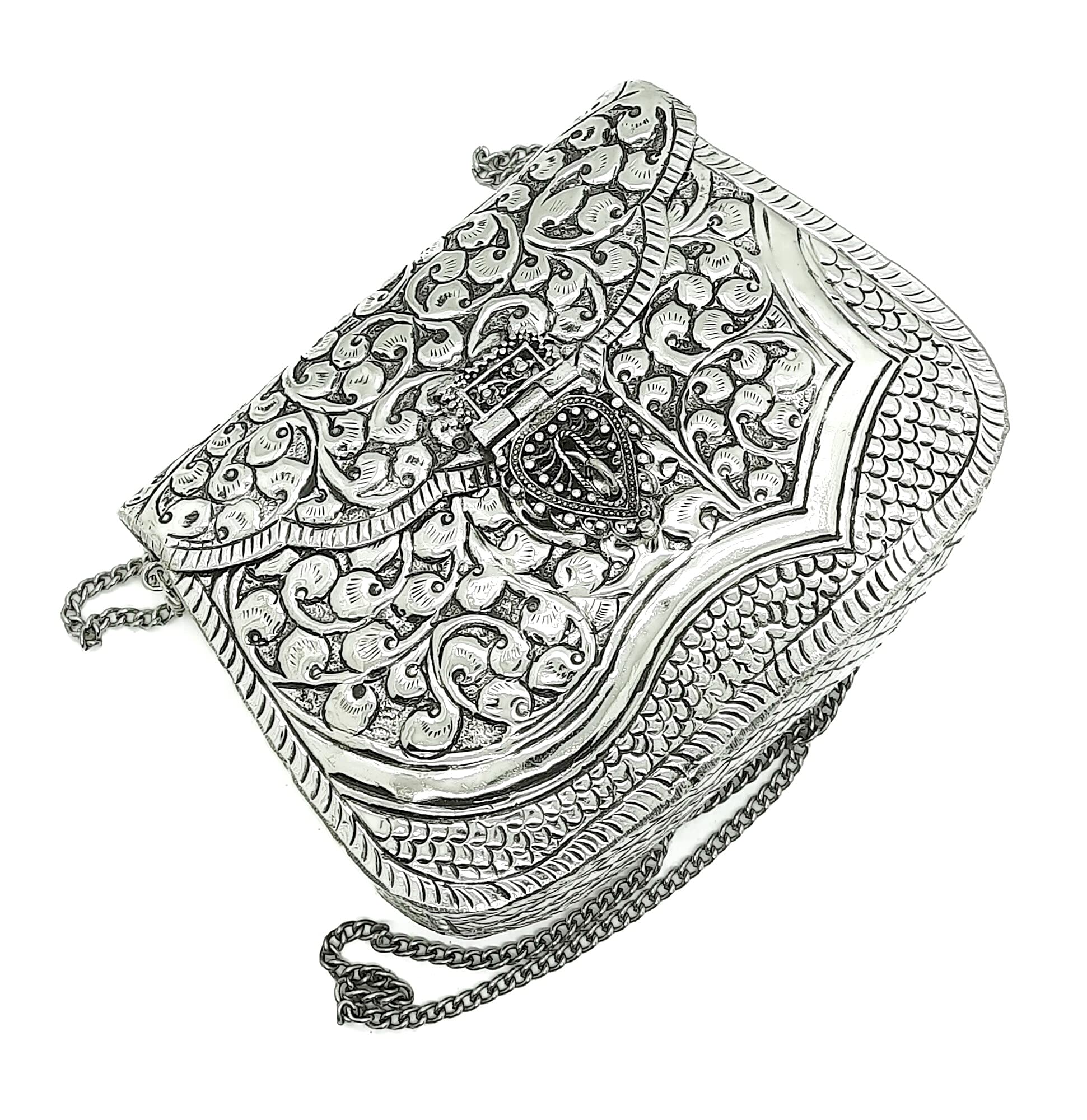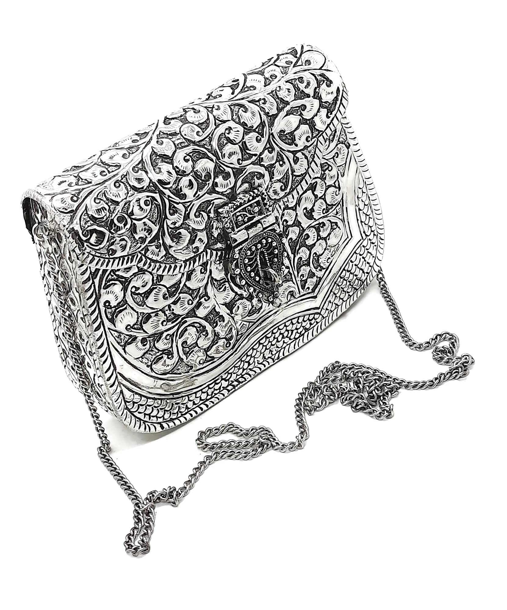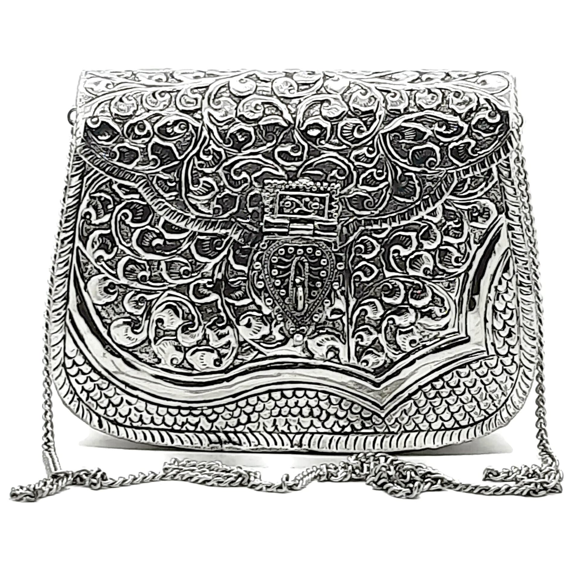 Handmade Ethnic Clutch cum sling bag made Brass Metal . A basic Brass metal object is fist designed and fine carving is done on it by hand. The process is finally completed by oxidization and polishing. Unique bag can Accommodate small size Cellphone and other small accessories. Size: Length 7 Inch, Width 2 Inch, Height 5.5 Inch, Weight 390 gm . Very nice and eye catching stuff , when you wear every one ask you.
