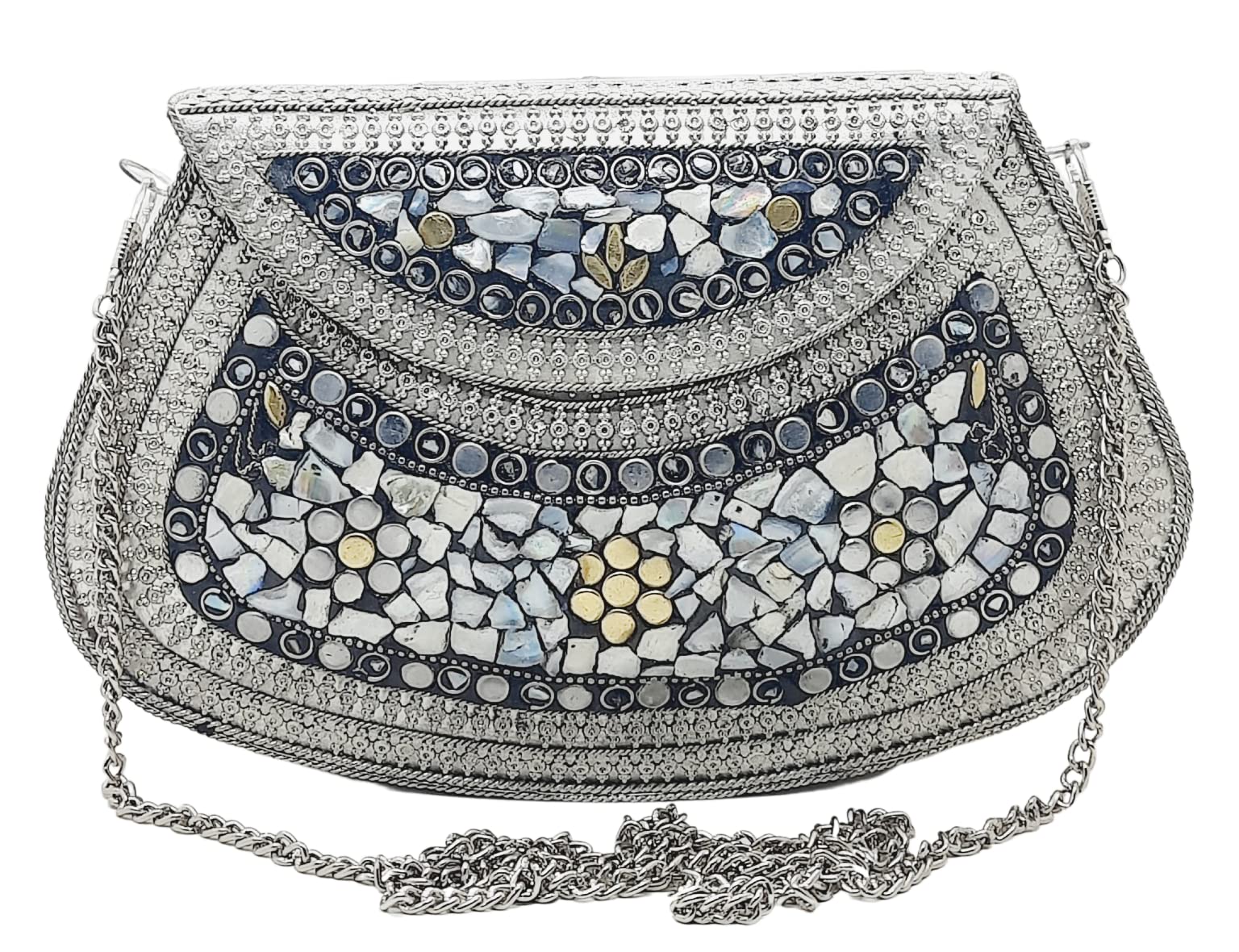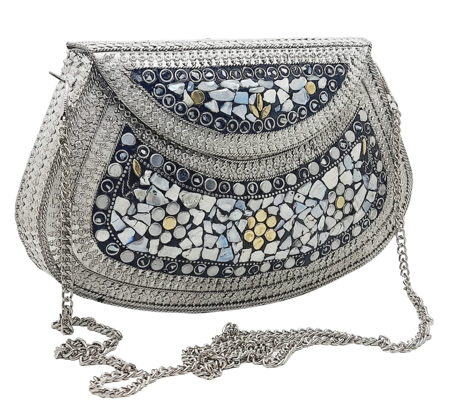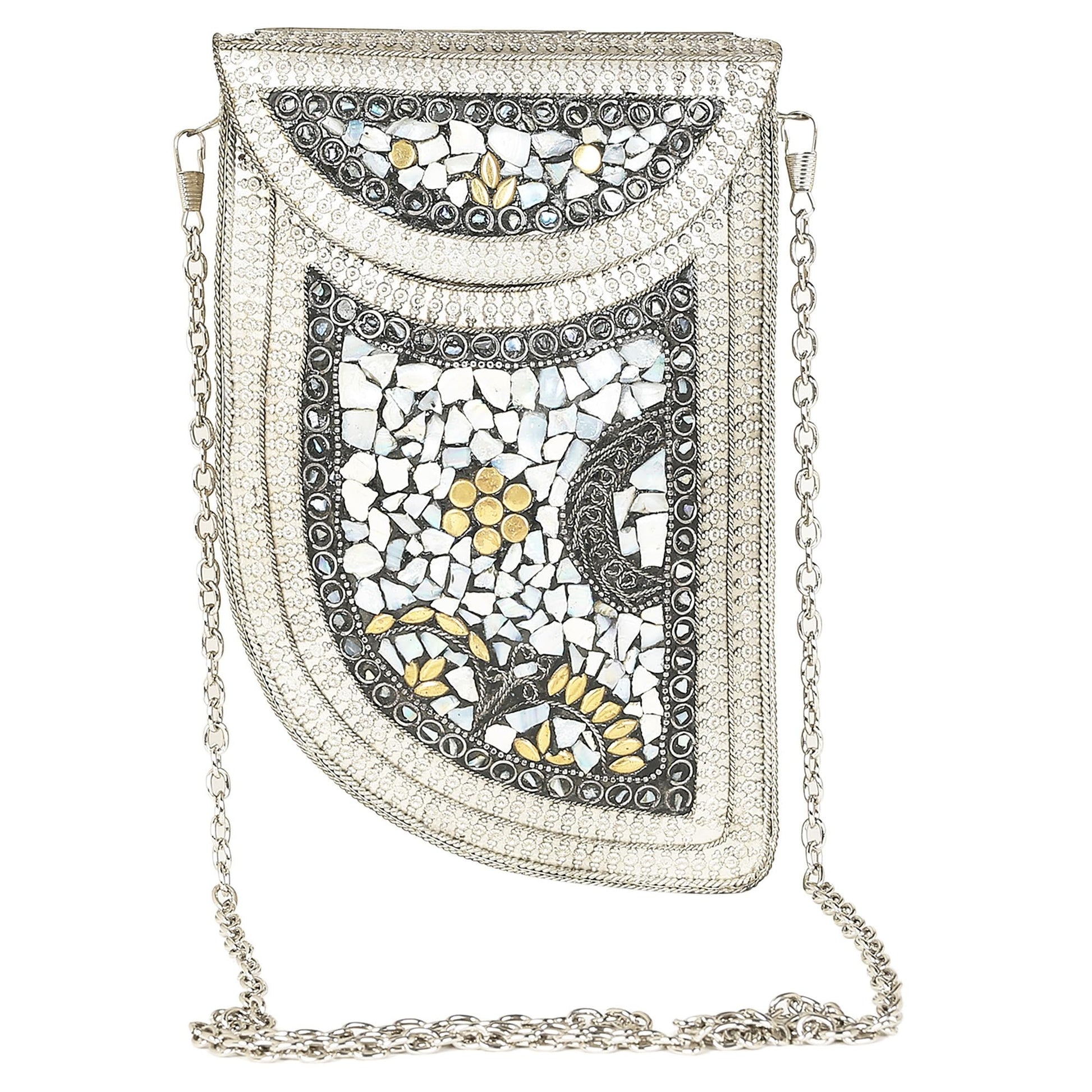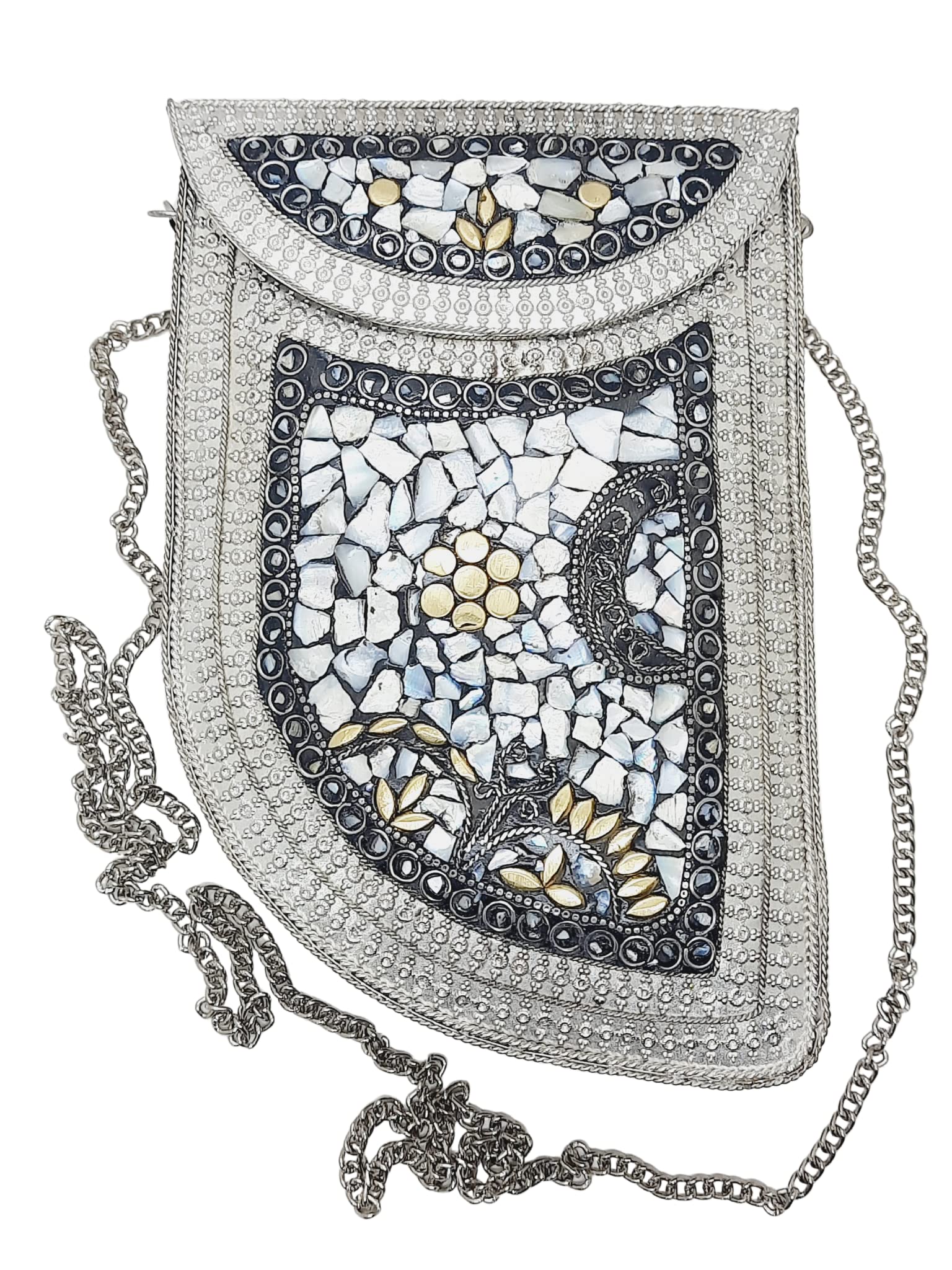 Handmade Metal Bag ,Bag is complete made from Metal and Beautiful Shell work in whole bag. Light weight , Cellphone can be put inside Bag and other Small Accessories like Lipsticks, Keys , Cards etc .Design by Craftsman by cutting metal in Box frame and Fine Shell Stone work on it in mosaic pattern. This bag Clutch is suitable to keep Smart Cellphone and small accessories. Stylish: Elegant, Bling madness, Glamorous, Fashionable. Bag Feature:: "Length 7.5 Inch, Height 5.5 Inch and Chain length 22 Inch, Weight 360 Gm. Perfect to keep any Size Cellphone and other small accessories .