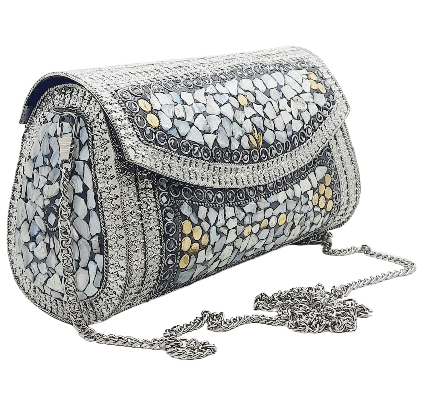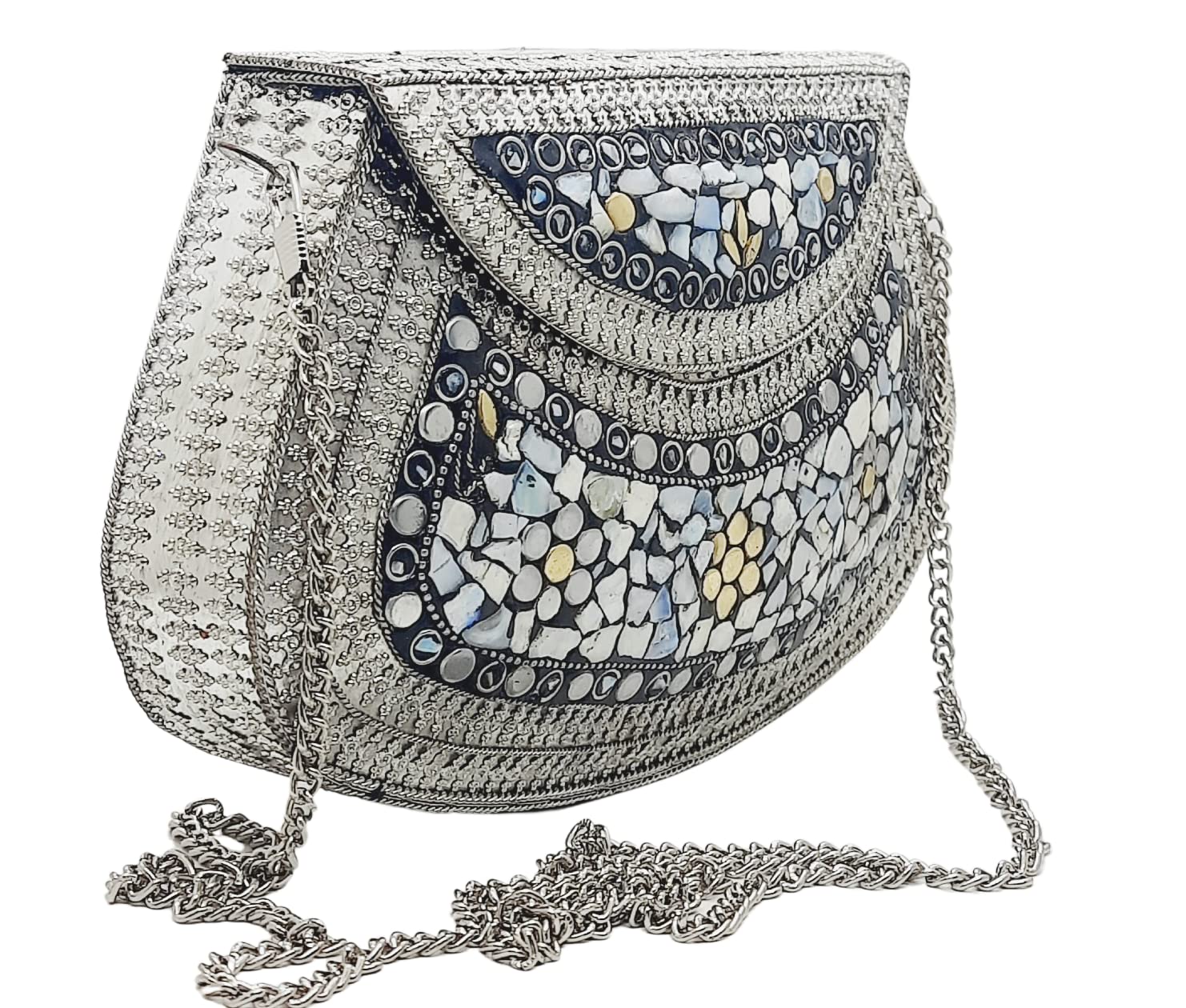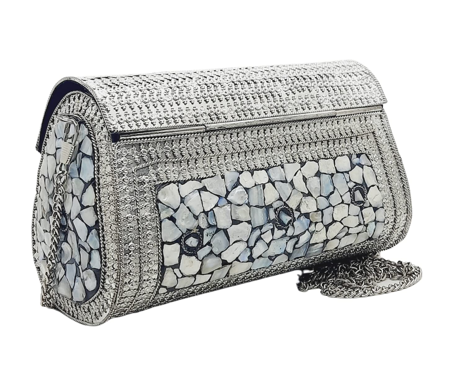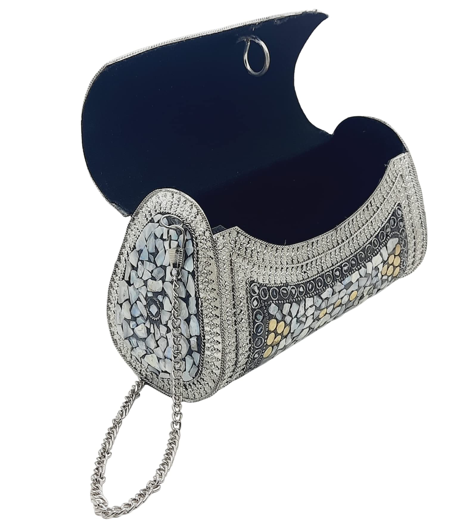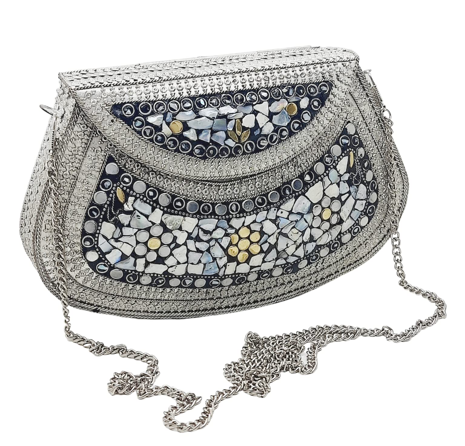 Handmade Metal Bag ,Bag is complete made from Metal and Beautiful Shell work in whole bag. Light weight , Cellphone can be put inside Bag and other Small Accessories like Lipsticks, Keys , Cards etc .Design by Craftsman by cutting metal in Box frame and Fine Shell Stone work on it in mosaic pattern. This bag Clutch is suitable to keep Smart Cellphone and small accessories. Stylish: Elegant, Bling madness, Glamorous, Fashionable. Bag Feature:: "Length 7.5 Inch, Height 5.5 Inch and Chain length 22 Inch, Weight 360 Gm. Perfect to keep any Size Cellphone and other small accessories .