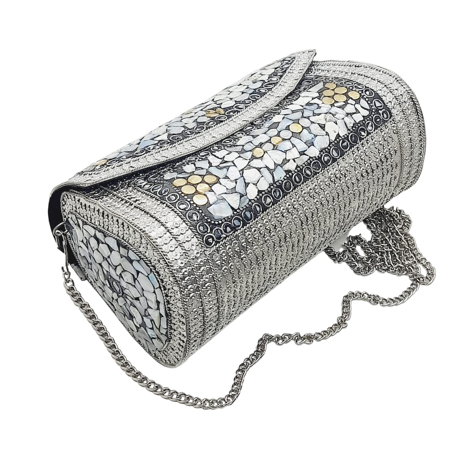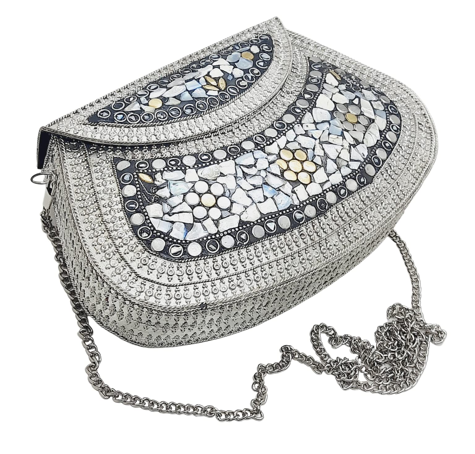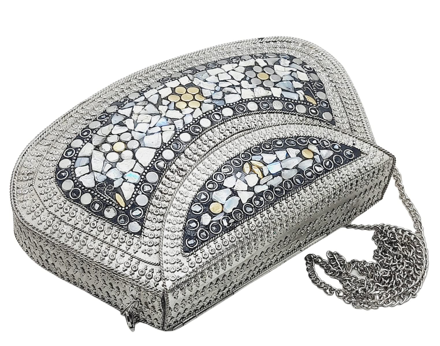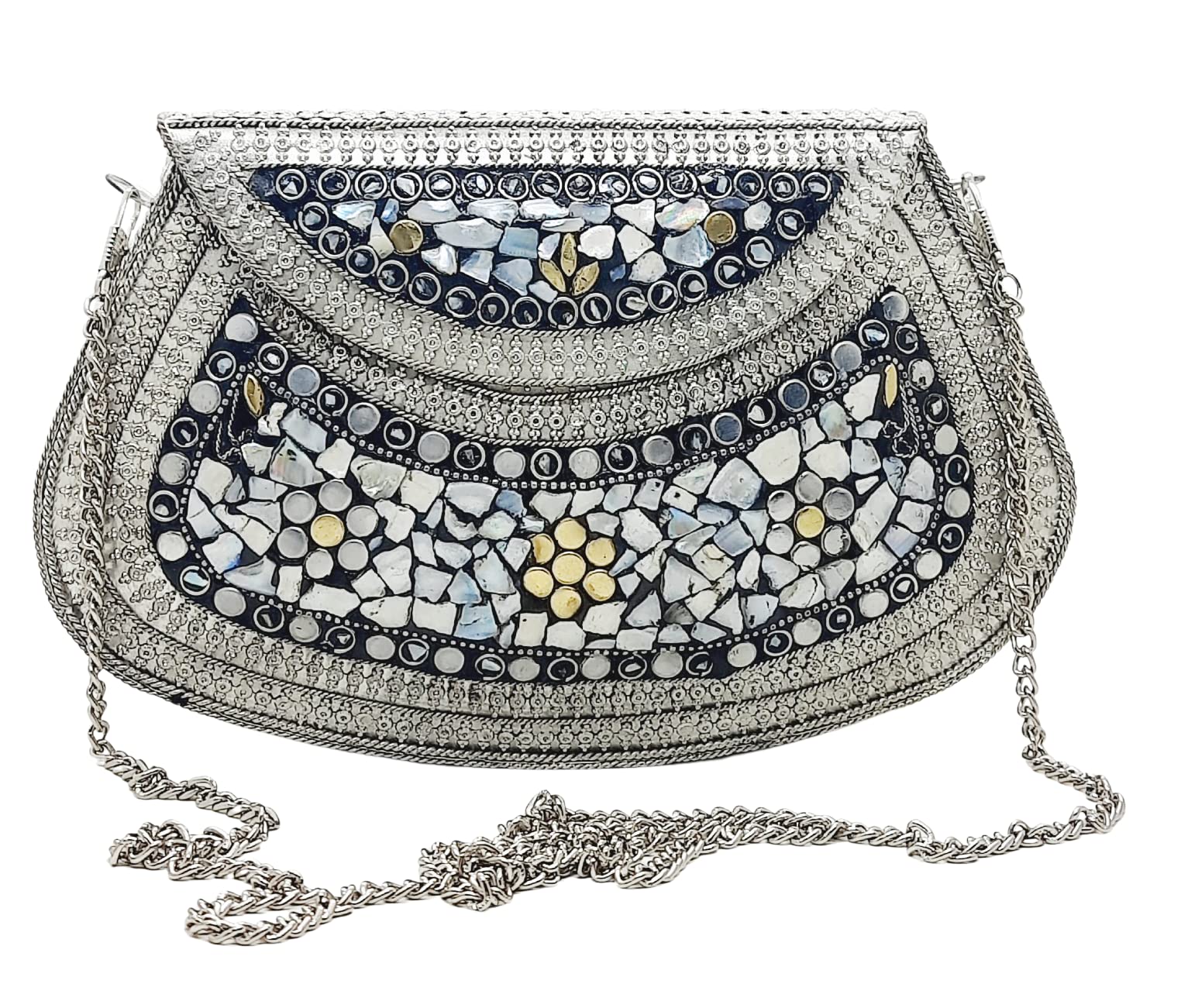 Handmade Metal Bag ,Bag is complete made from Metal and Beautiful Shell work in whole bag. Light weight , Cellphone can be put inside Bag and other Small Accessories like Lipsticks, Keys , Cards etc .Design by Craftsman by cutting metal in Box frame and Fine Shell Stone work on it in mosaic pattern. This bag Clutch is suitable to keep Smart Cellphone and small accessories. Stylish: Elegant, Bling madness, Glamorous, Fashionable. Bag Feature:: "Length 7.5 Inch, Height 5.5 Inch and Chain length 22 Inch, Weight 360 Gm. Perfect to keep any Size Cellphone and other small accessories .