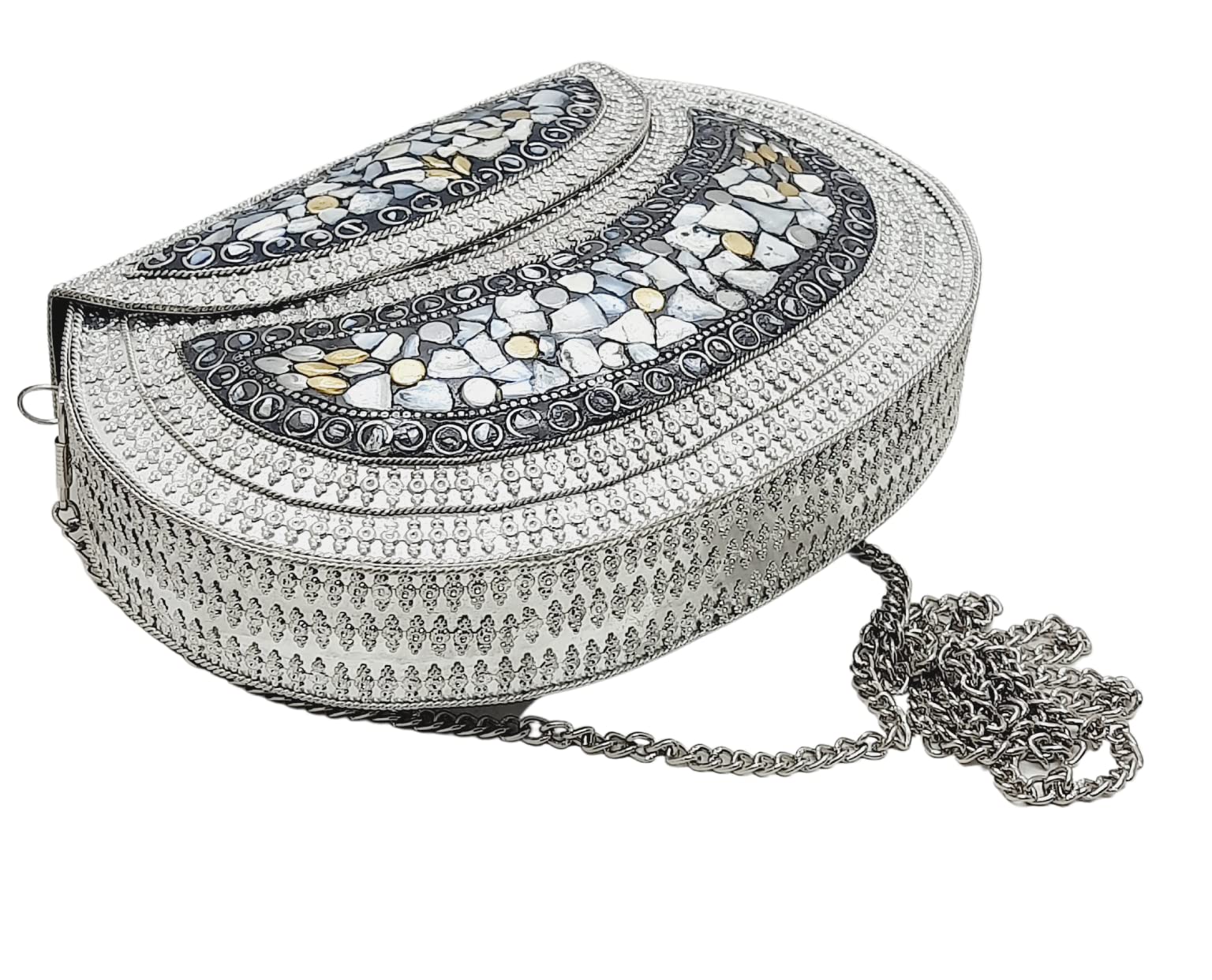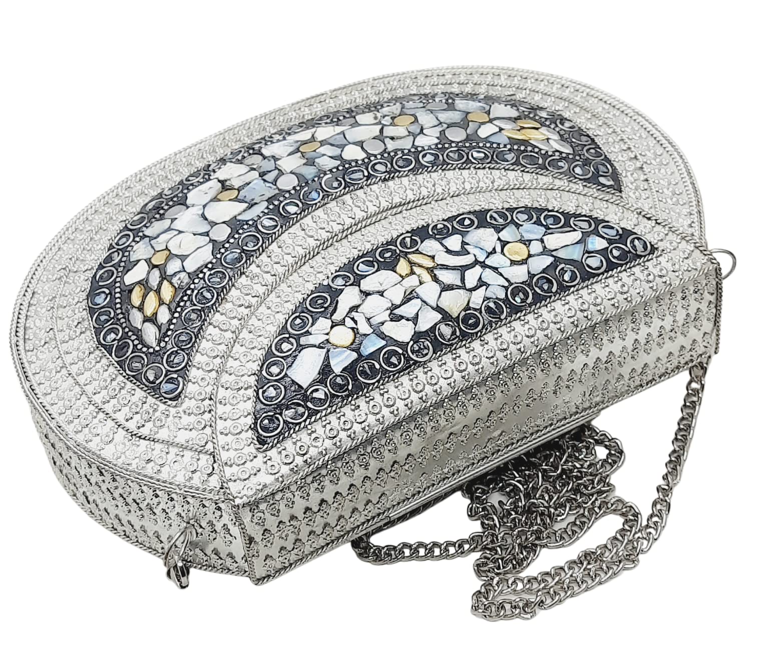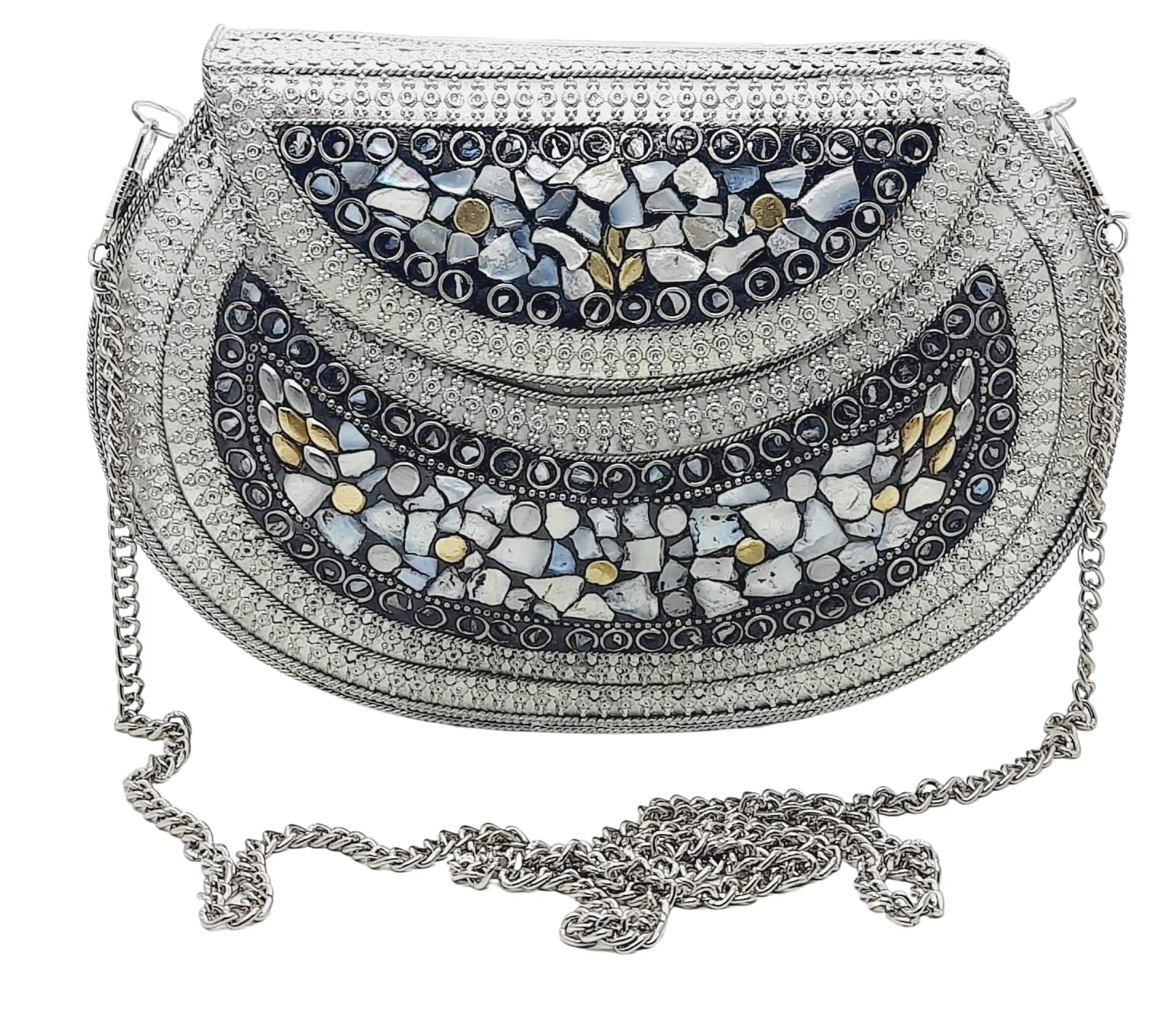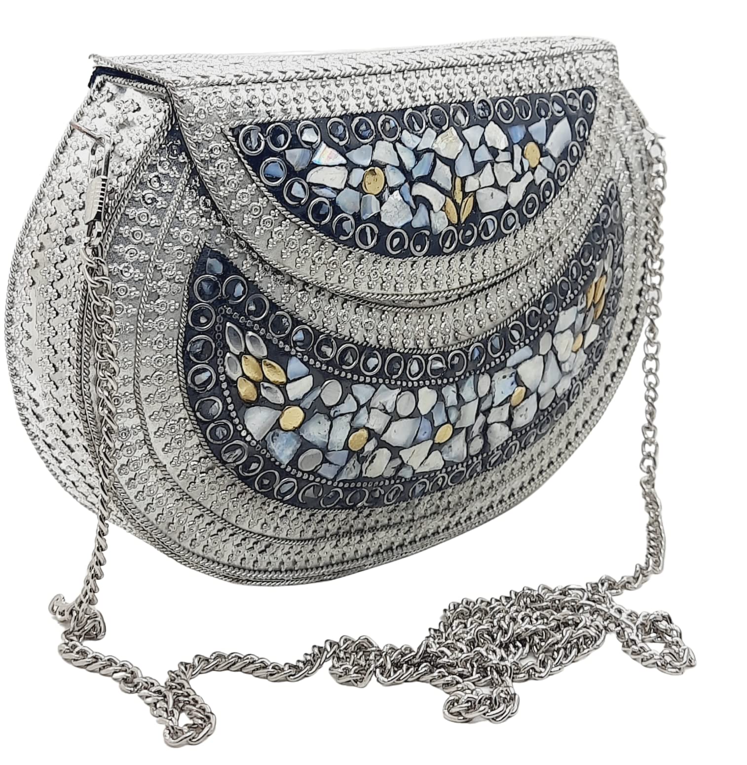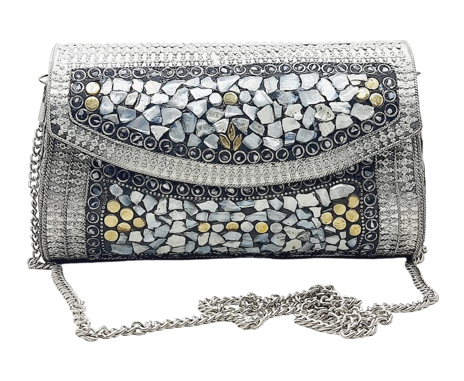 Handmade Metal Bag ,Bag is complete made from Metal and Beautiful Shell work in whole bag. Light weight , Cellphone can be put inside Bag and other Small Accessories like Lipsticks, Keys , Cards etc .Design by Craftsman by cutting metal in Box frame and Fine Shell Stone work on it in mosaic pattern. This bag Clutch is suitable to keep Smart Cellphone and small accessories. Stylish: Elegant, Bling madness, Glamorous, Fashionable. Bag Feature:: "Length 7.5 Inch, Height 5.5 Inch and Chain length 22 Inch, Weight 360 Gm. Perfect to keep any Size Cellphone and other small accessories .