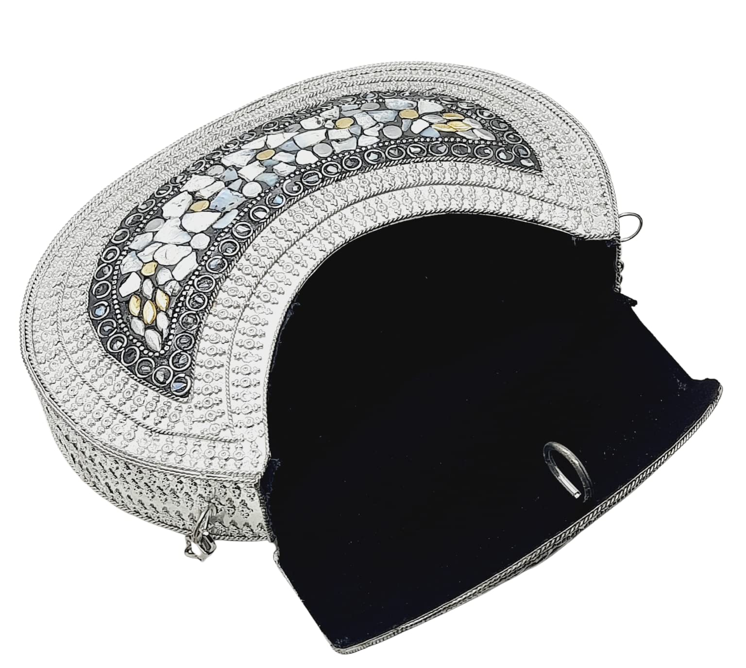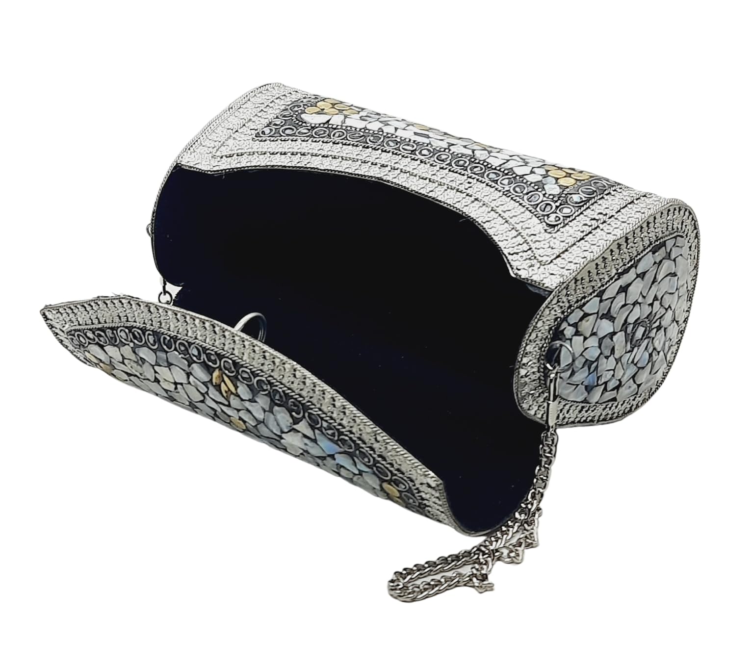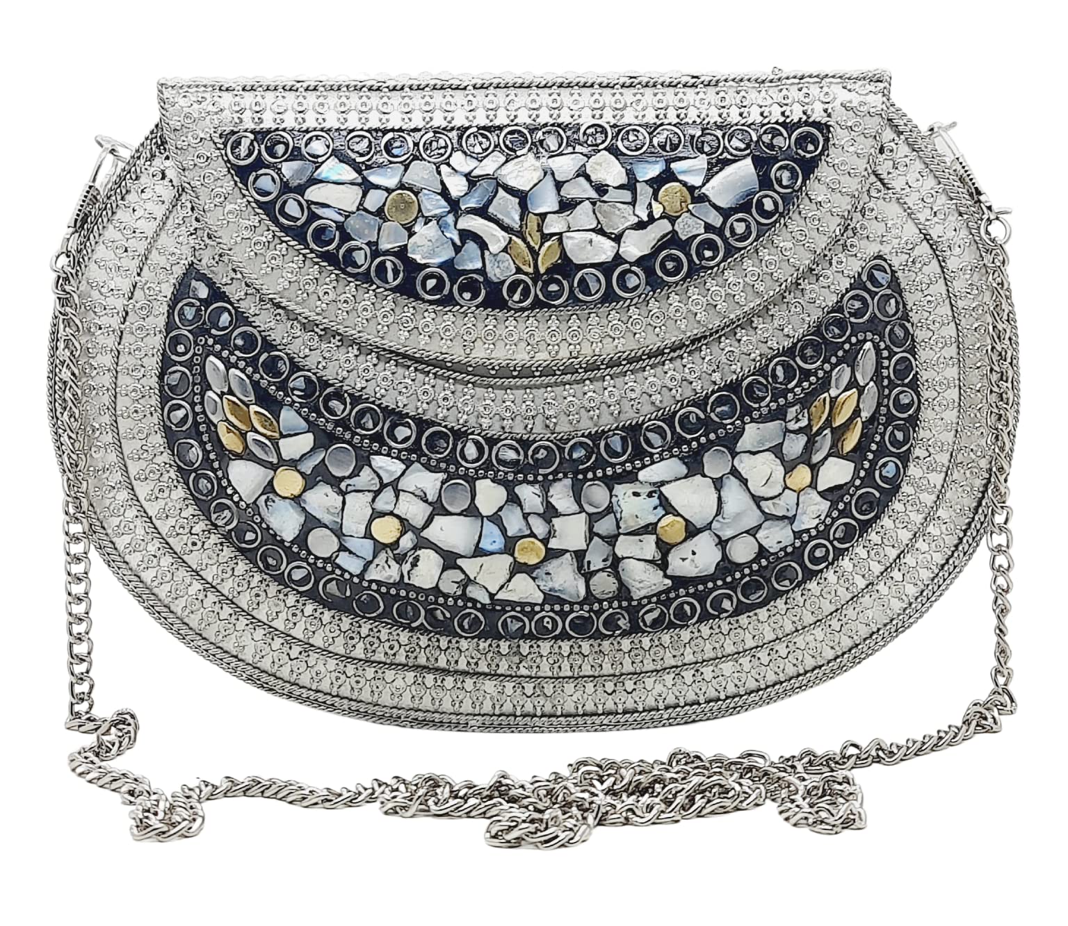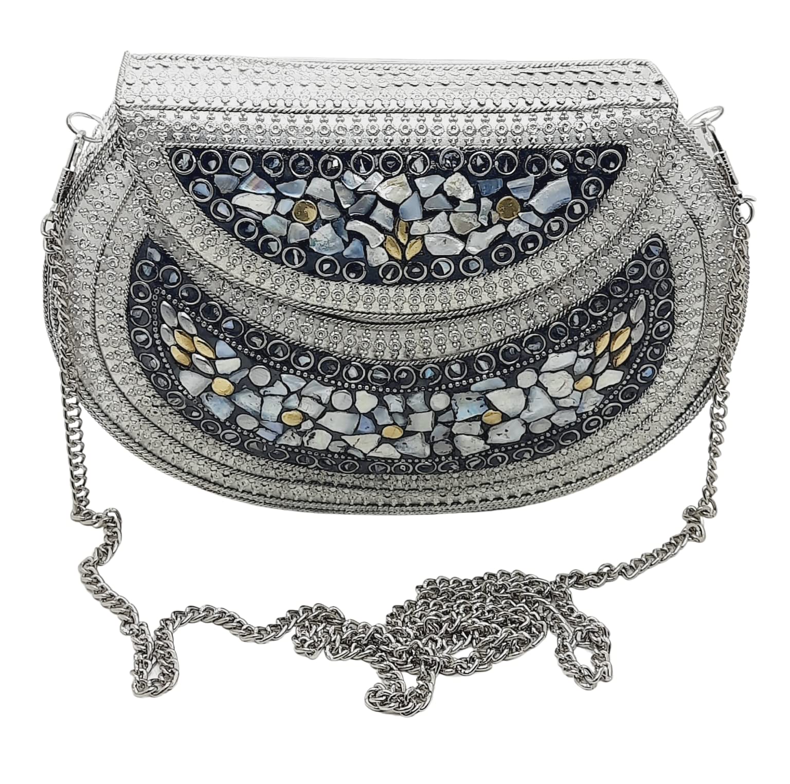 Handmade Metal Bag ,Bag is complete made from Metal and Beautiful Shell work in whole bag. Light weight , Cellphone can be put inside Bag and other Small Accessories like Lipsticks, Keys , Cards etc .Design by Craftsman by cutting metal in Box frame and Fine Shell Stone work on it in mosaic pattern. This bag Clutch is suitable to keep Smart Cellphone and small accessories. Stylish: Elegant, Bling madness, Glamorous, Fashionable. Bag Feature:: "Length 7.5 Inch, Height 5.5 Inch and Chain length 22 Inch, Weight 360 Gm. Perfect to keep any Size Cellphone and other small accessories .